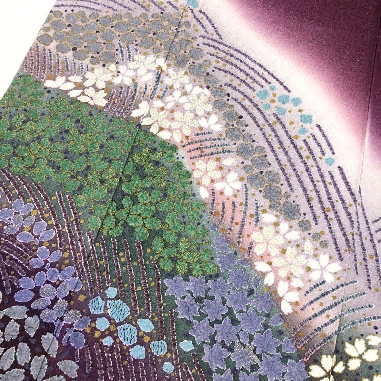 小紫色の品のあるお色味、金通しの上質な質感、大変手のかかった美しい絞り染で鮮やかにデザインされた花模様が素敵なお品でございます。
