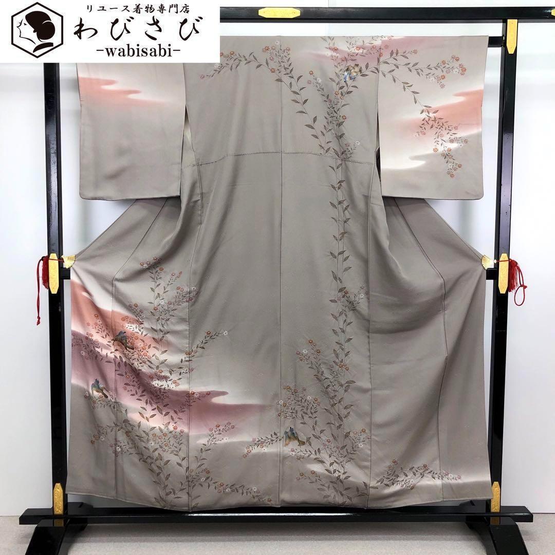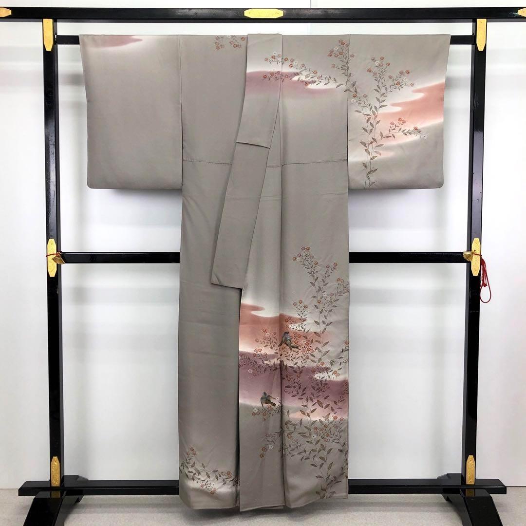 訪問着 美しい鳥の刺繍 草花模様 京極生壁色 K-2999