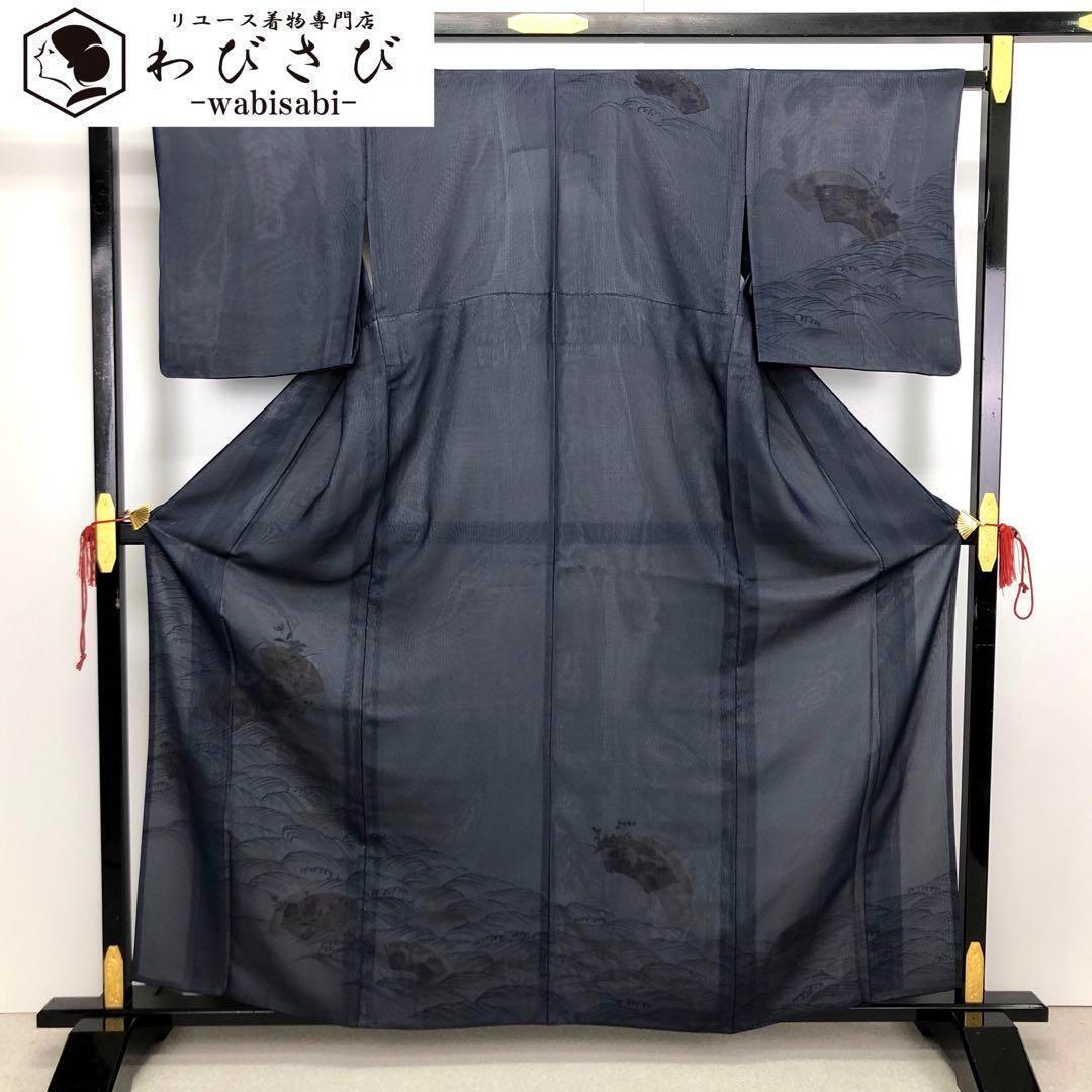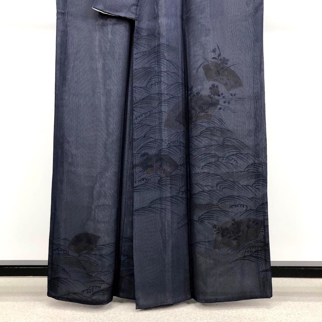 紗袷せ 付下げ 地紙に花柄 波模様 紺色 K-3012