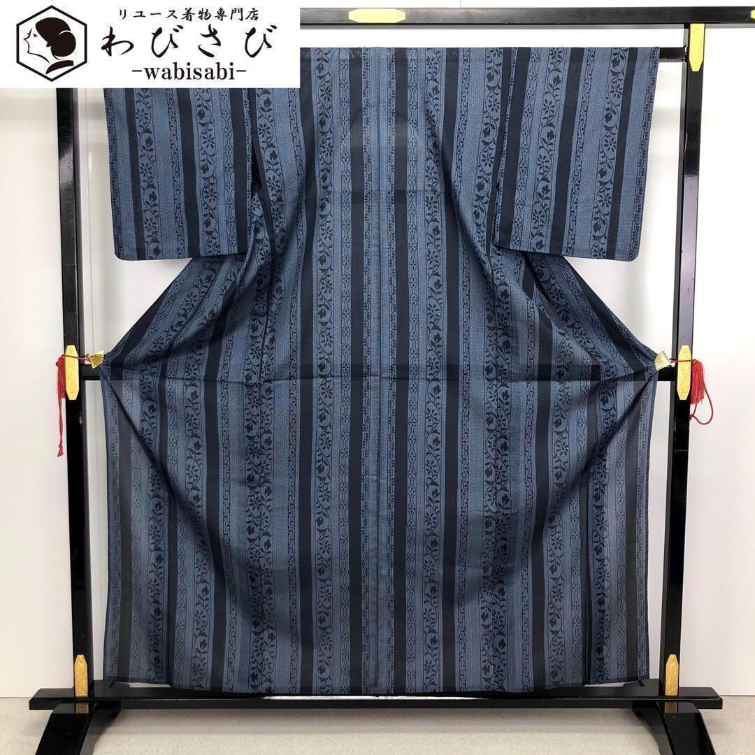 夏着物 小紋 紗 縦柄花唐草模様 紺色 K-3038 着物 きもの kimono 和服 和装 中古 リサイクル着物 【送料無料】