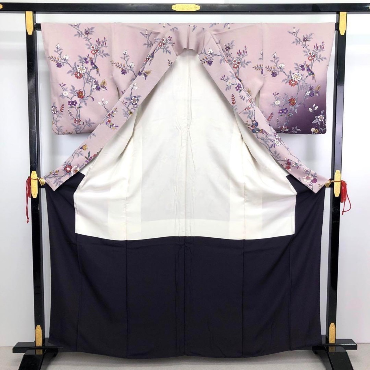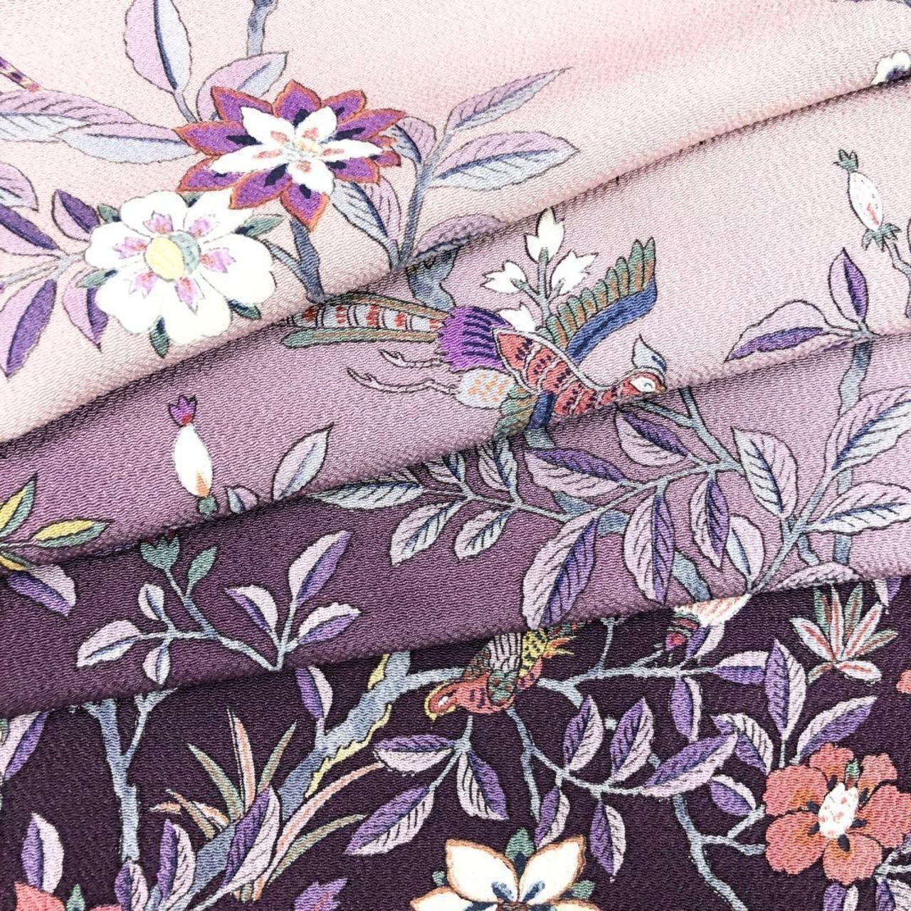 淡藤色の質感の良い鬼しぼ縮緬に鮮やかで華やかな花唐草模様に鳳凰がデザインされた美しいグラデーションのお品でございます。