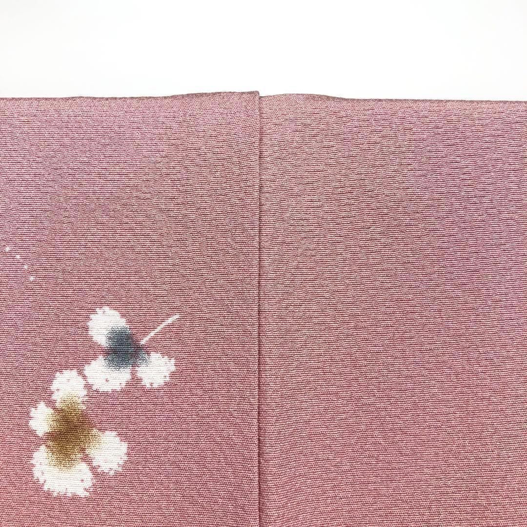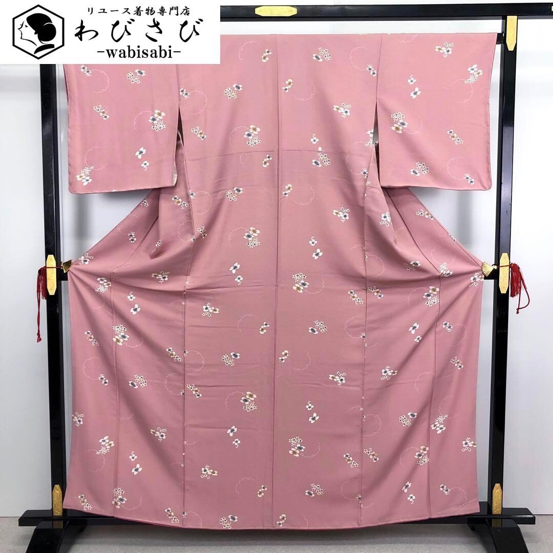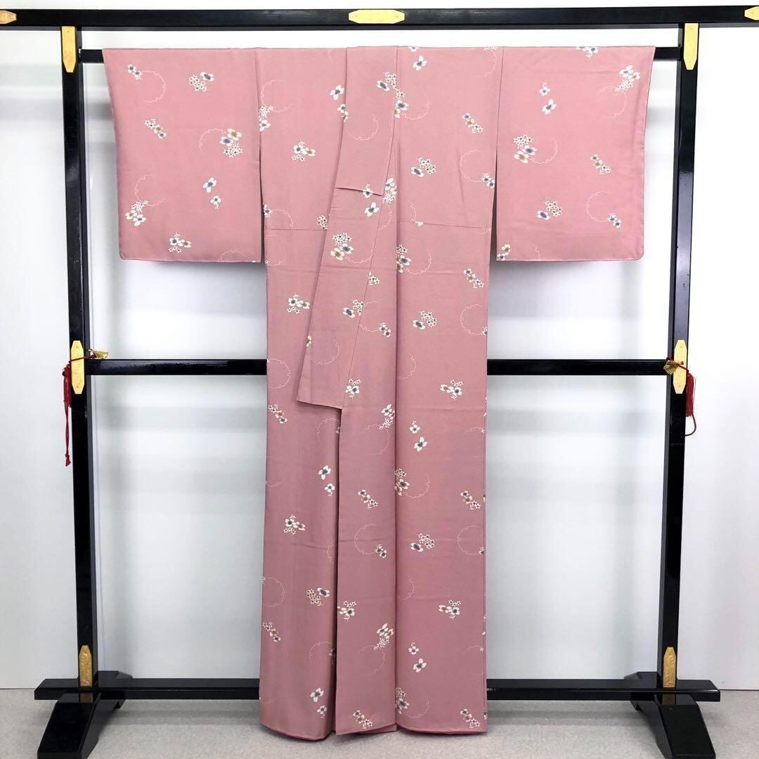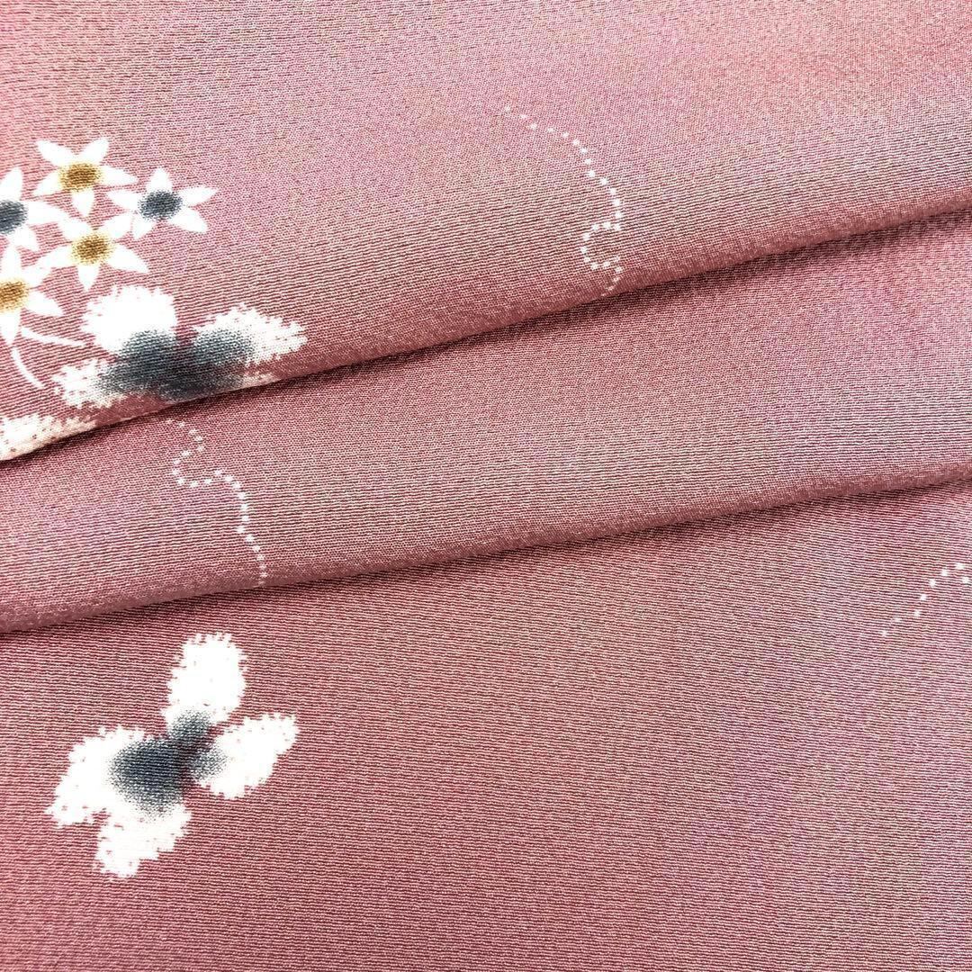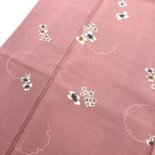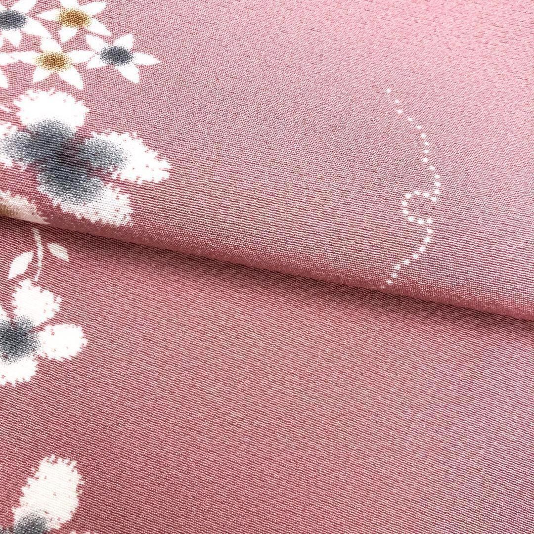 石竹色の上品なピンク系のお色味の縮緬に飛び柄でデザインされた絞りの花柄、雪輪模様が素敵なお品でございます。