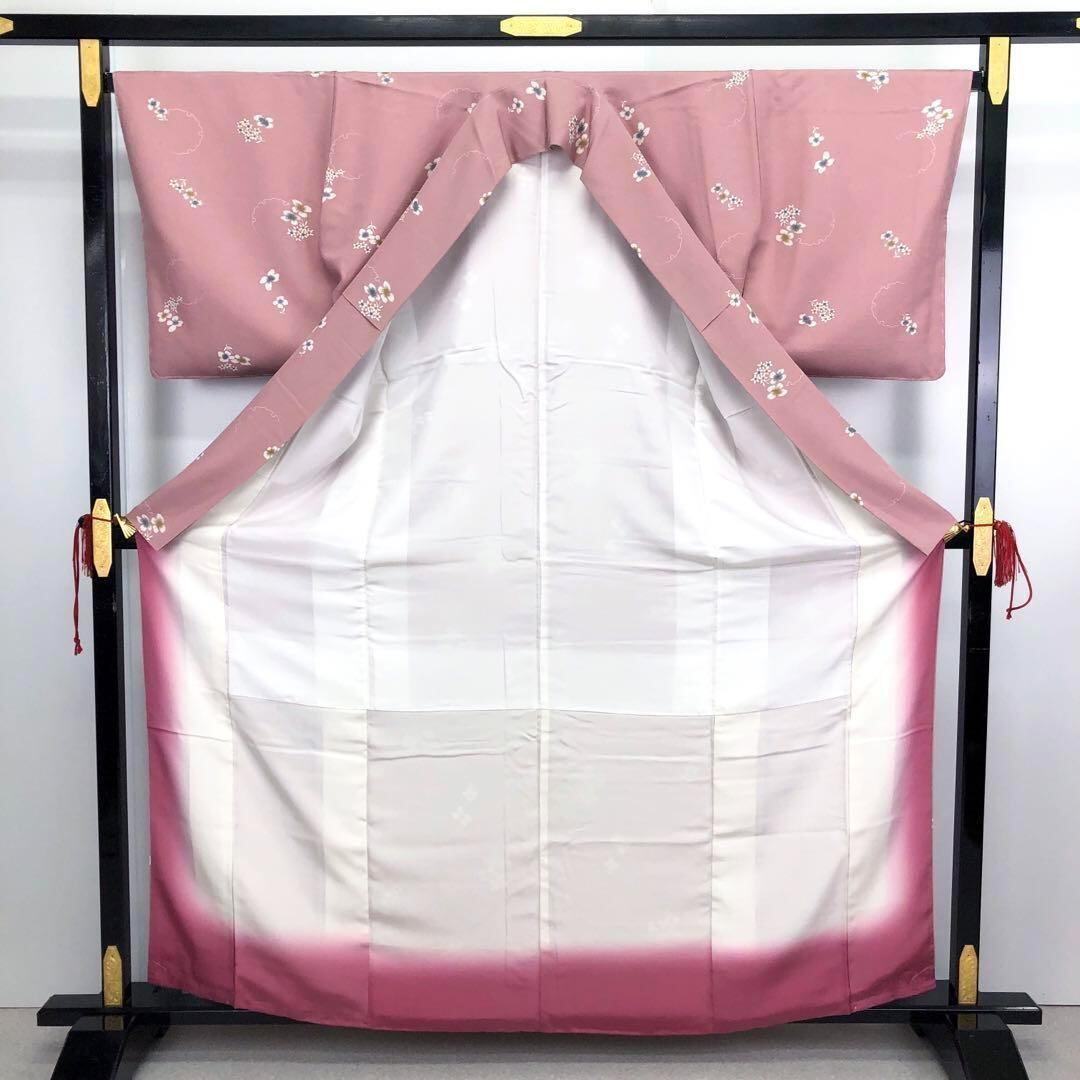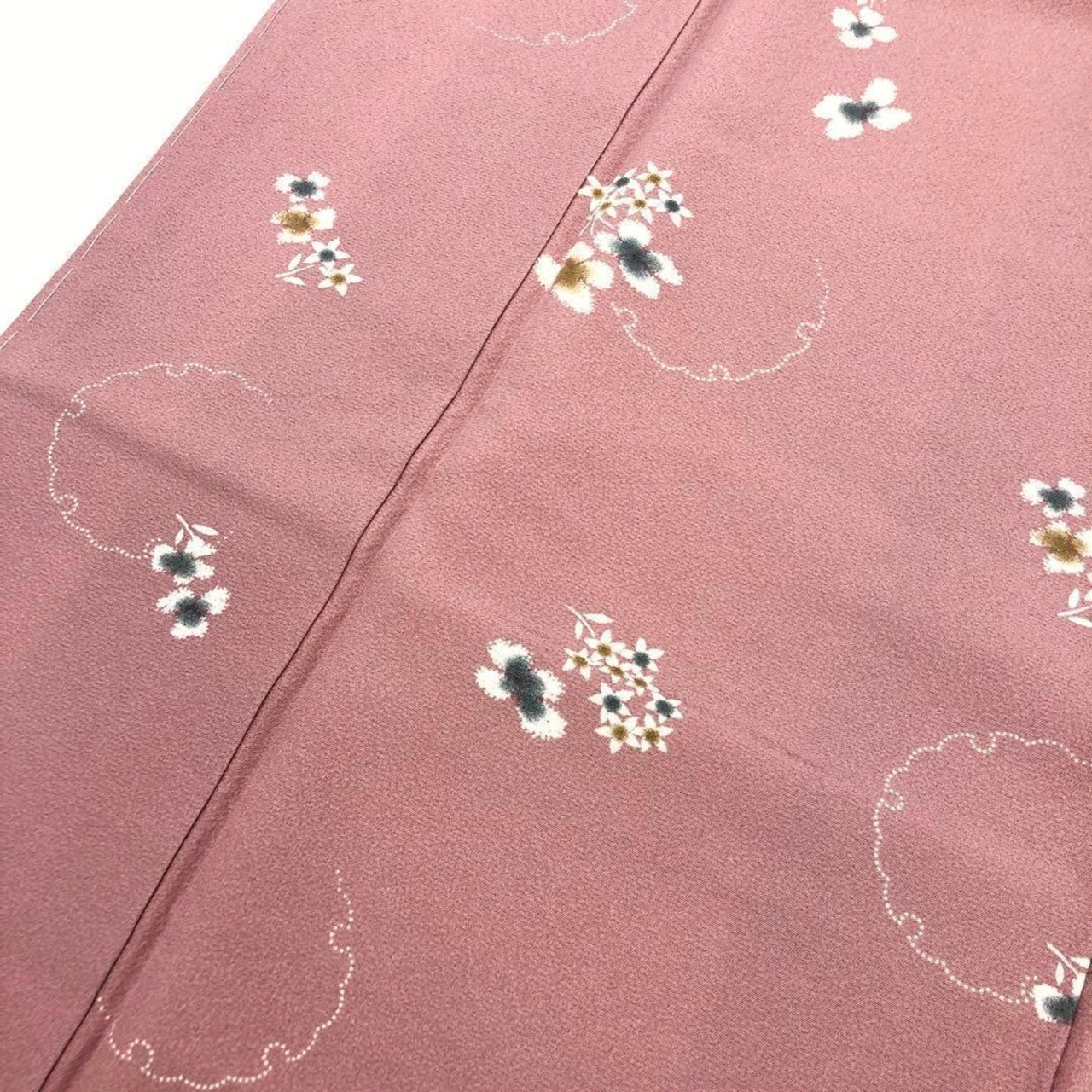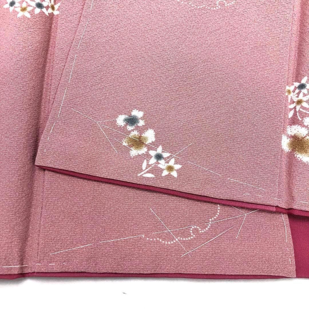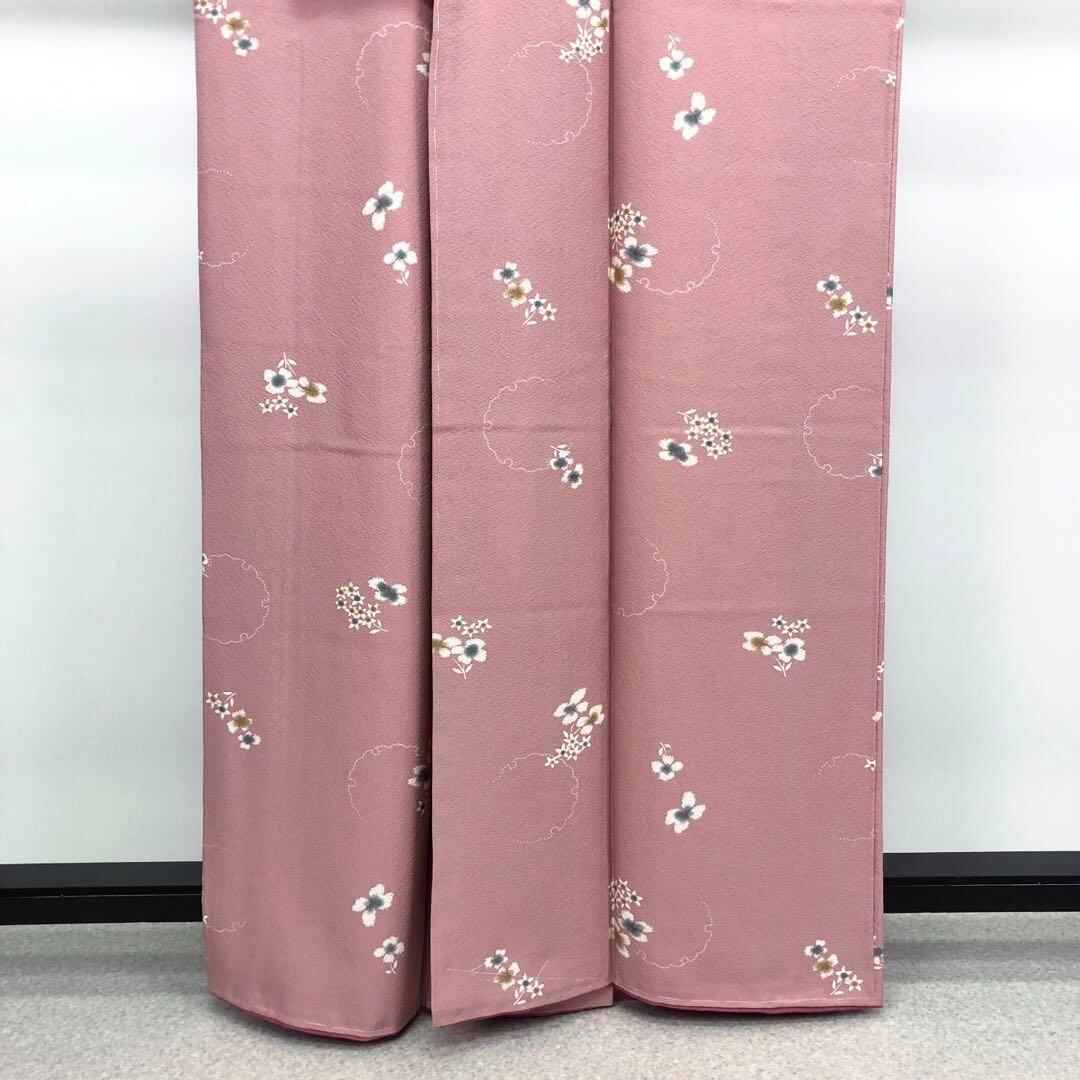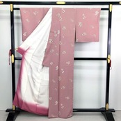 石竹色の上品なピンク系のお色味の縮緬に飛び柄でデザインされた絞りの花柄、雪輪模様が素敵なお品でございます。