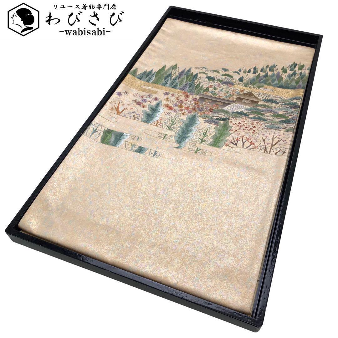 山々に松や梅、家などの全ての柄裄が刺繍でデザインされた総刺繍の素敵なお品でございます。