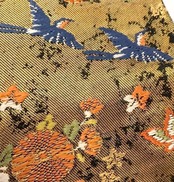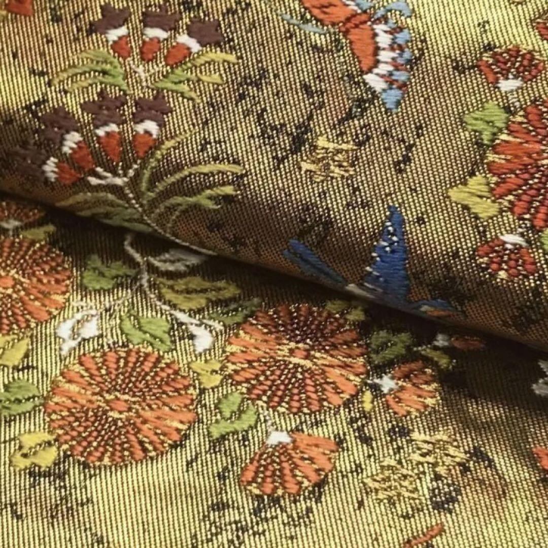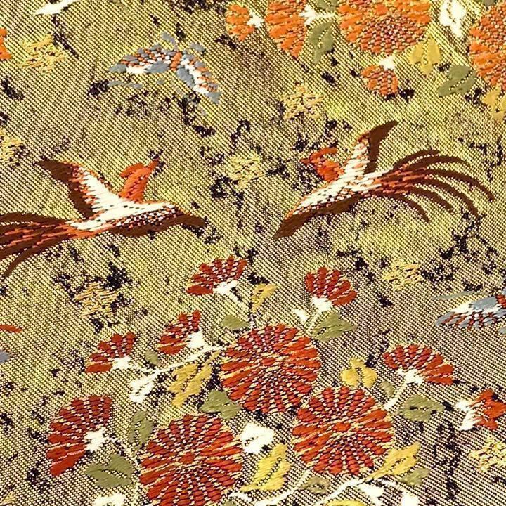 金ベースのお色に四季の花々、鳳凰や蝶々の美しい織模様がデザインされた素敵なお品でございます。