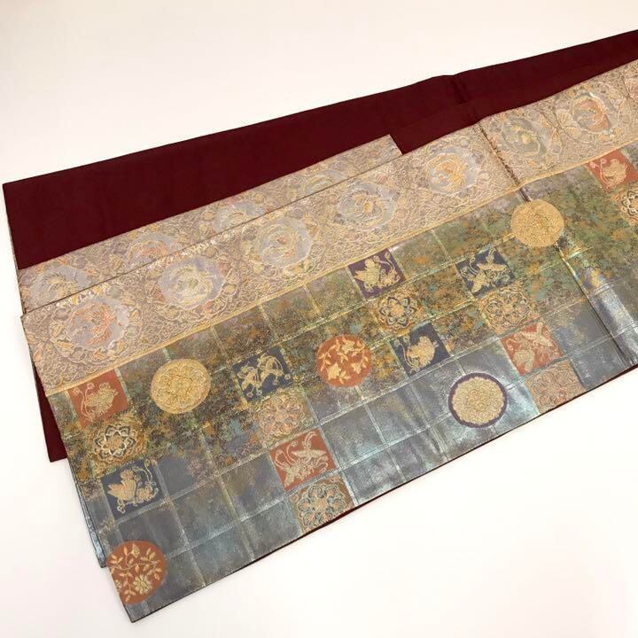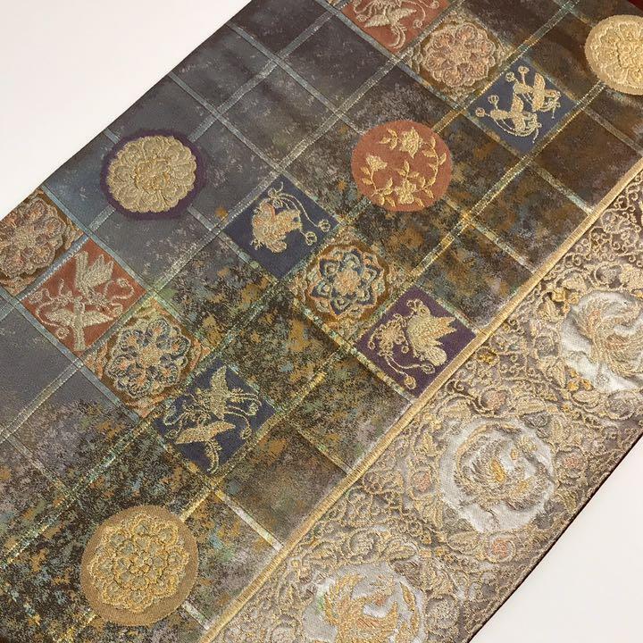 袋帯 正倉院格子華文 丸に鳳凰 格子模様に華模様 金糸 O-1270