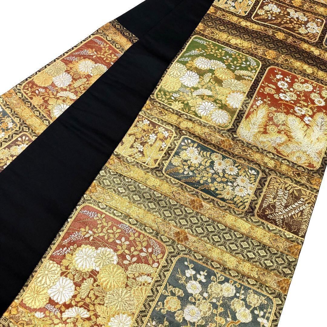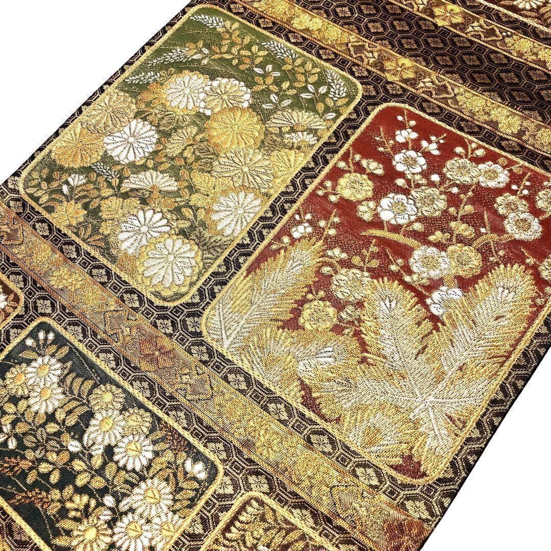 袋帯 蒔絵瑞祥文 豊雅錦 花柄 菊 梅 藤 松 金糸 金色 O-1356 着物 きもの kimono 和服 和装 中古 リサイクル着物 【送料無料】