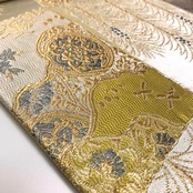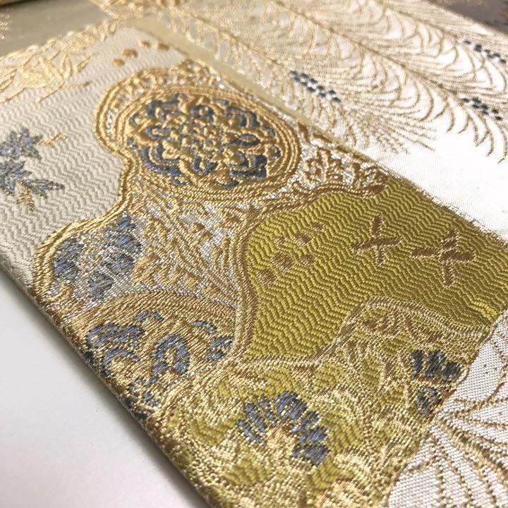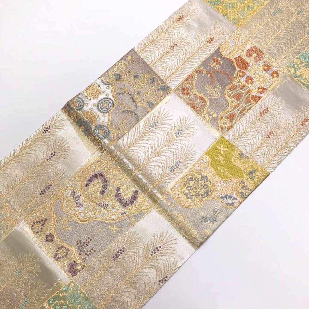 袋帯 四角に多様な柄や花草の織模様 金糸 白銀色 O-1506