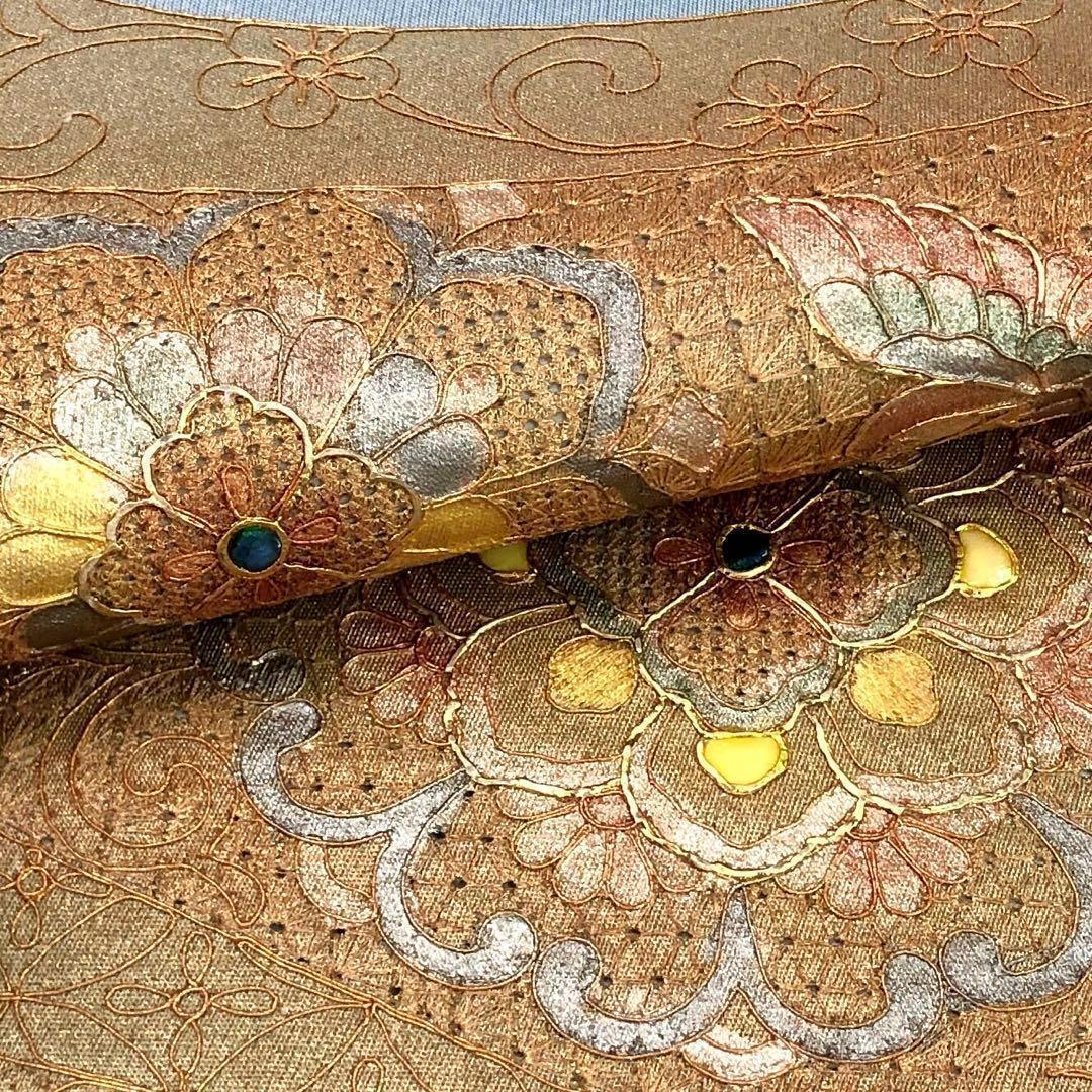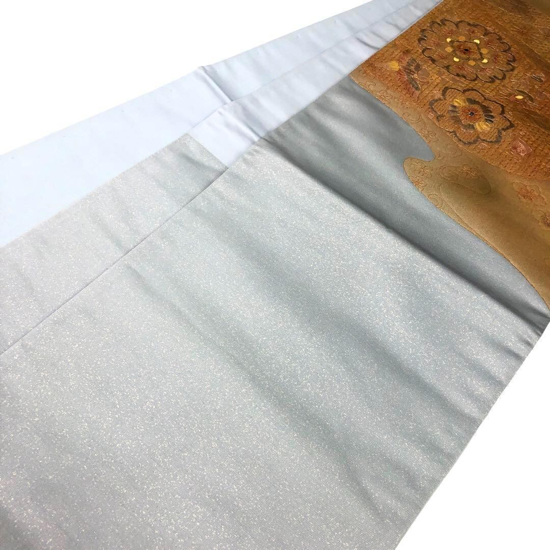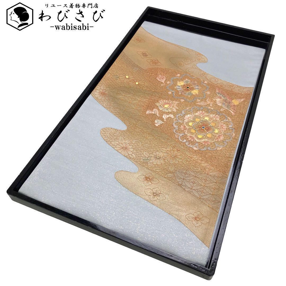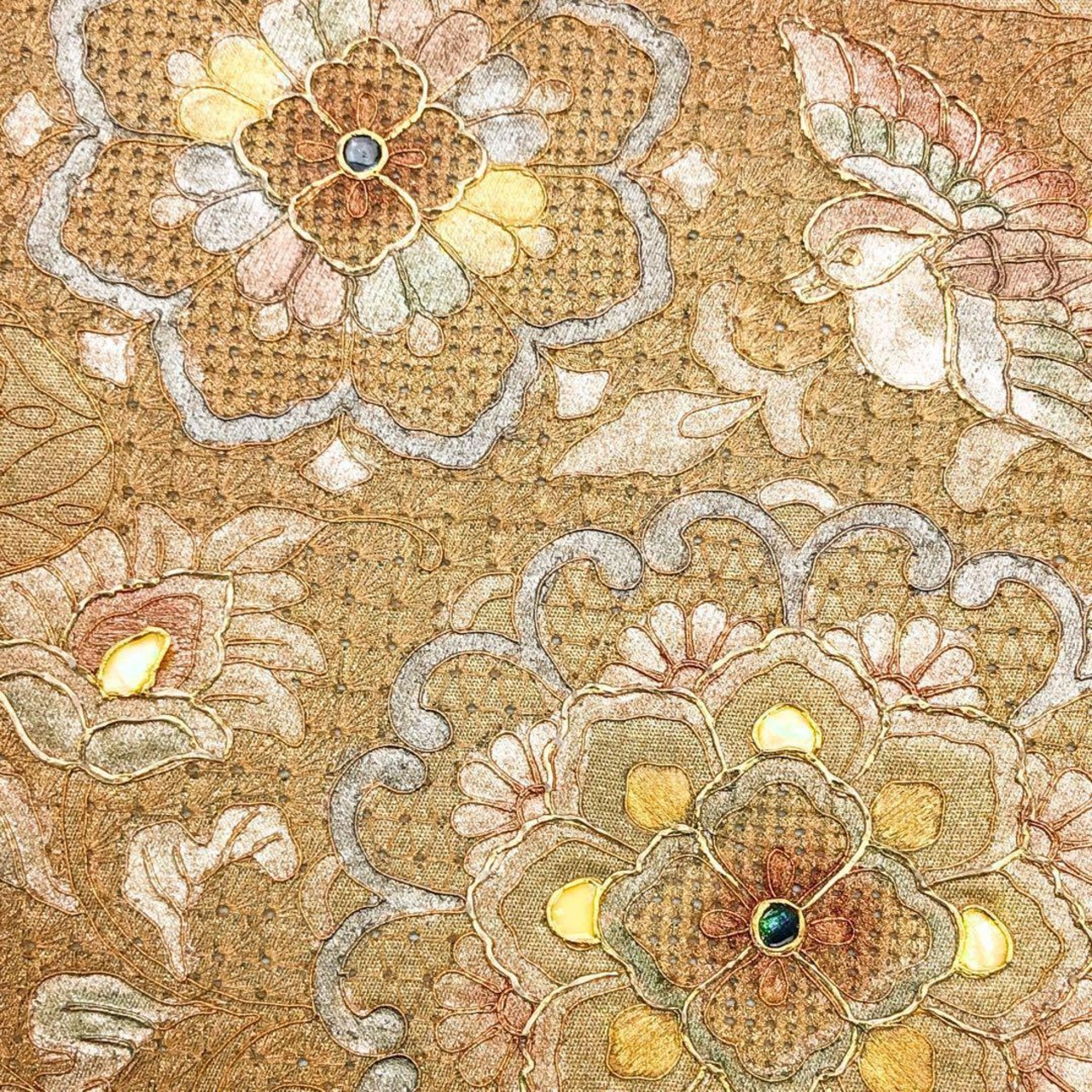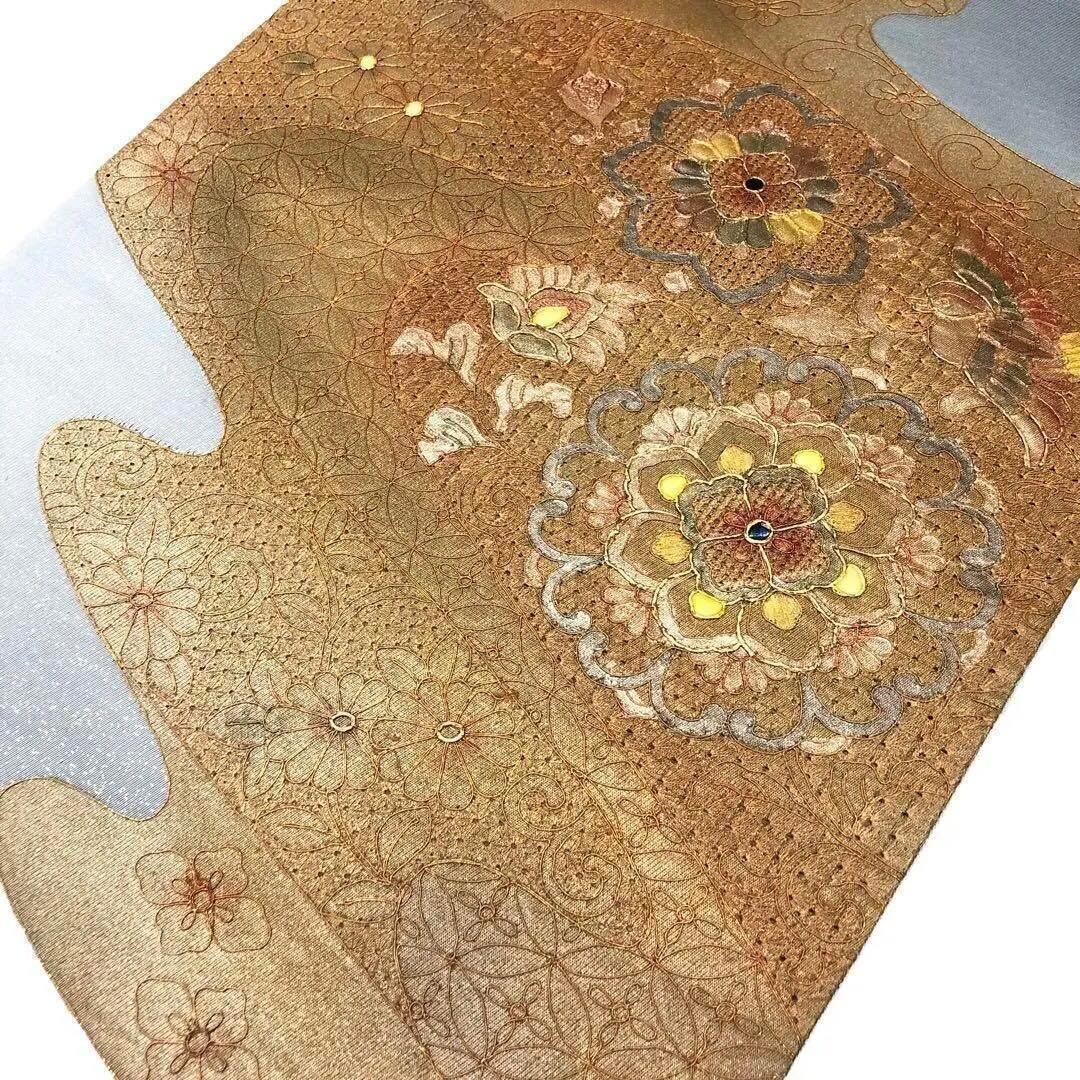 蒼白色の上品なお色味に螺鈿、汕頭刺繍で手のかかった美しい華柄模様に鳥柄がデザインされた素敵なお品でございます。