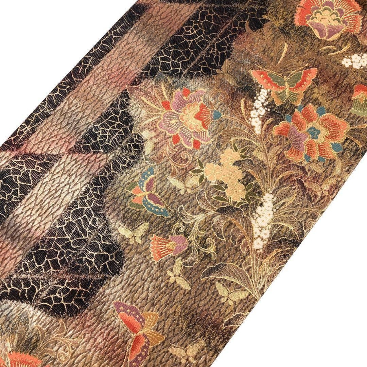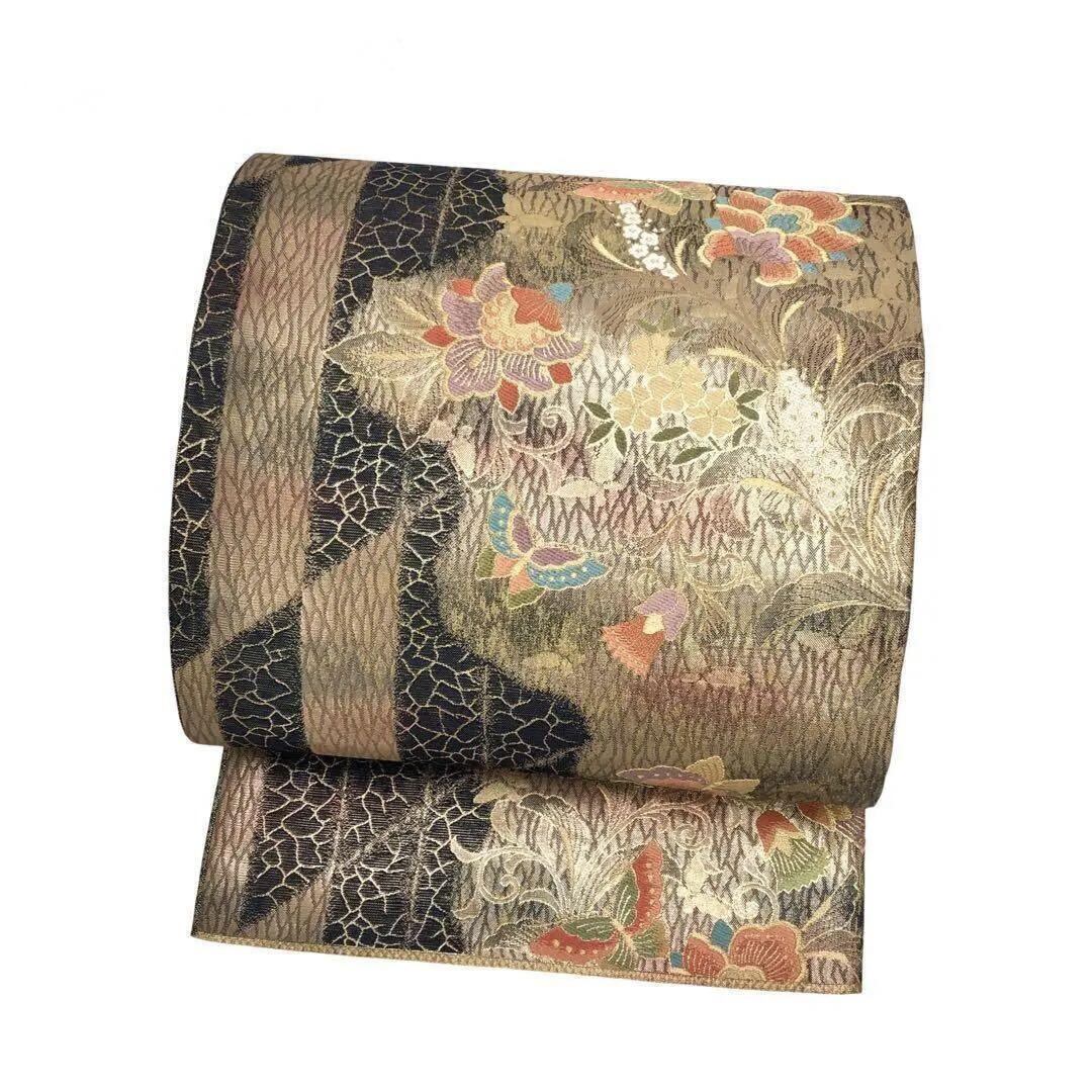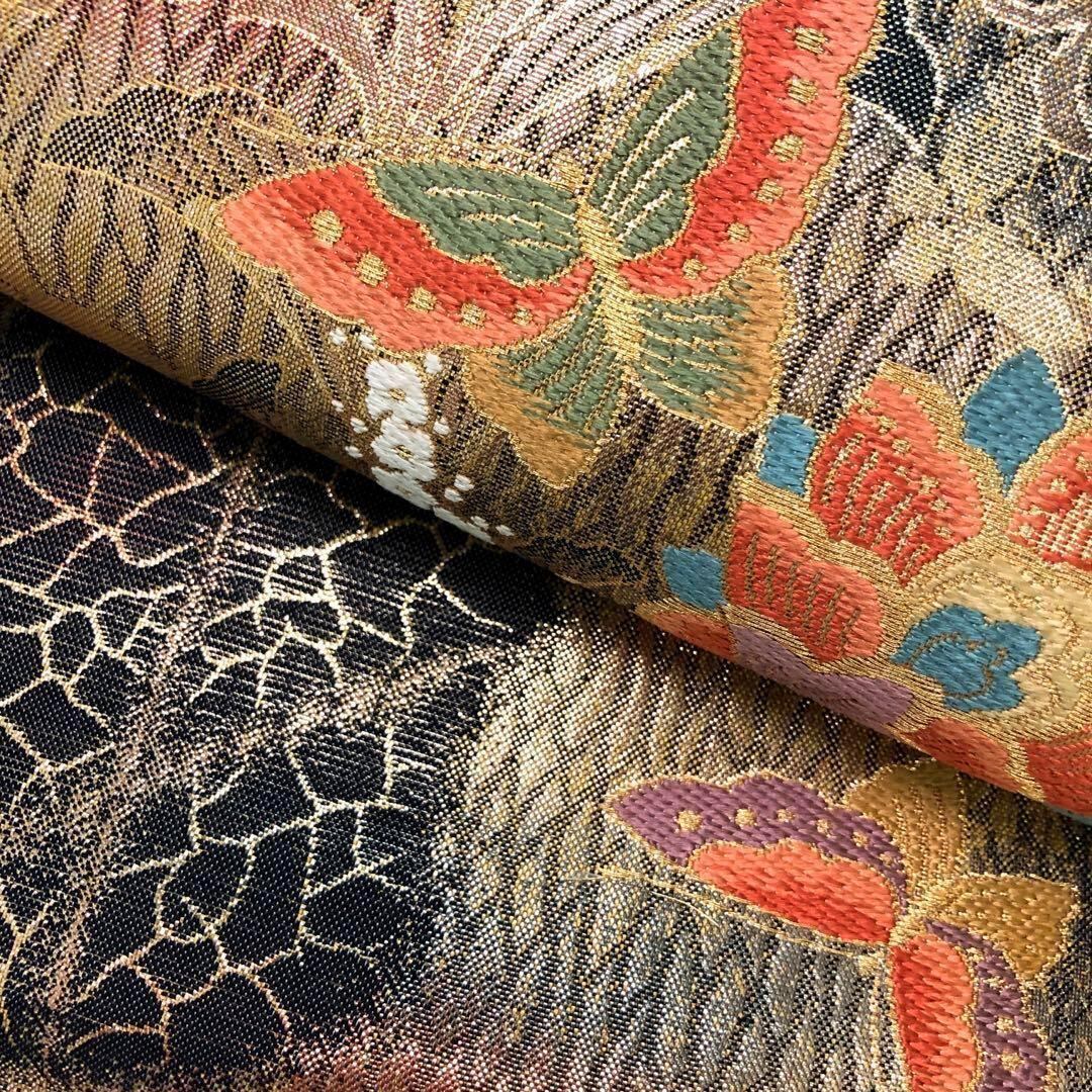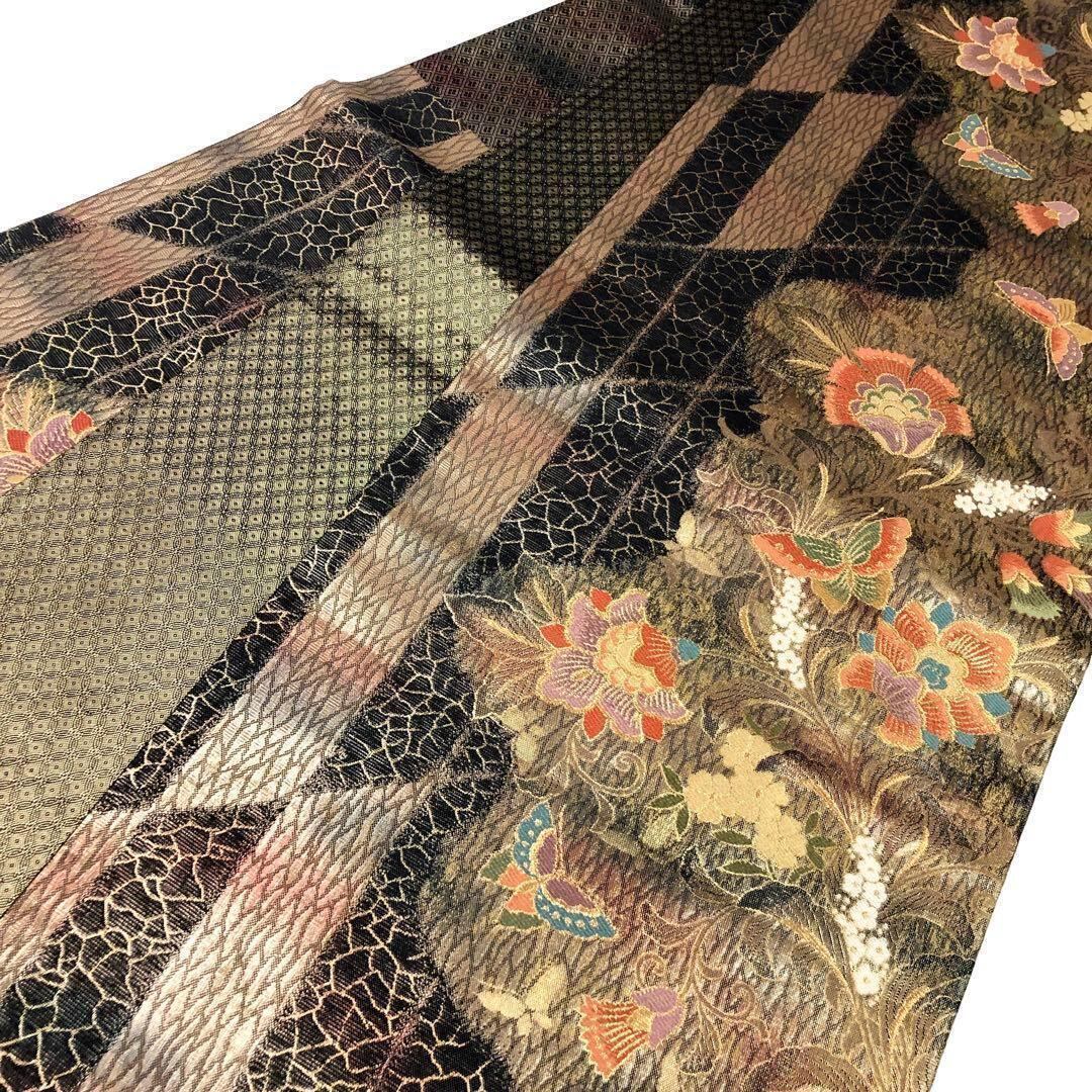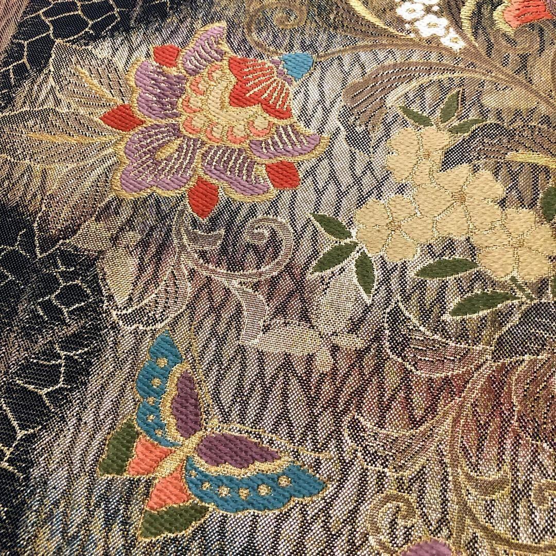 黒地に金糸を使った美しく輝く花に舞う蝶々の柄行がデザインされた煌びやかな印象の素敵なお品でございます。