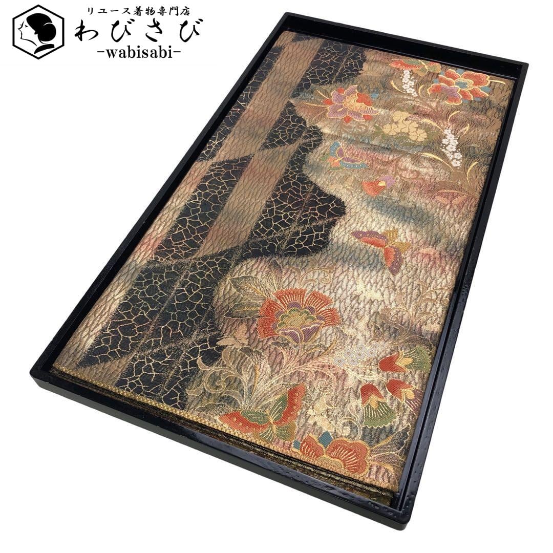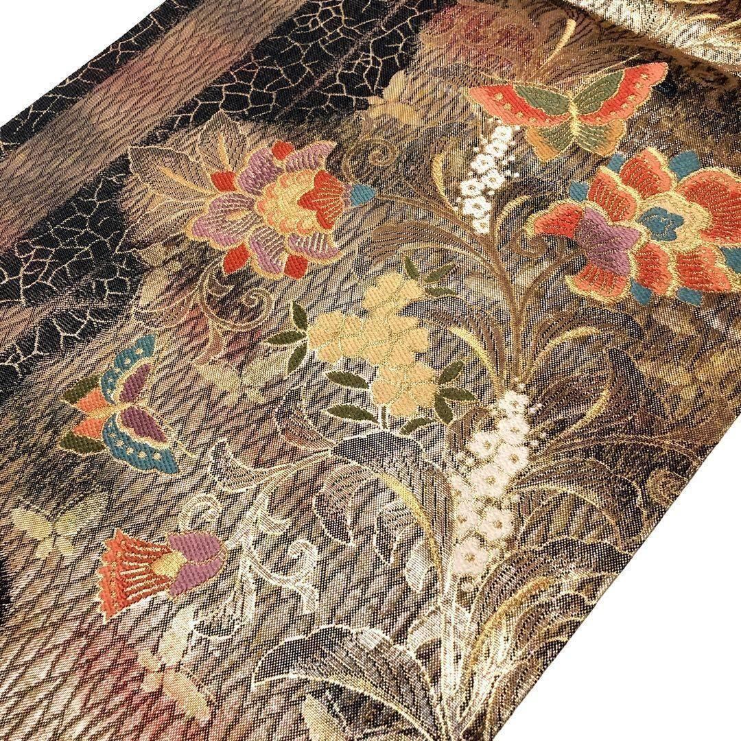 袋帯 花唐草 花に舞う蝶々 金糸 黒色 O-1657 着物 きもの kimono 和服 和装 中古 リサイクル着物 【送料無料】