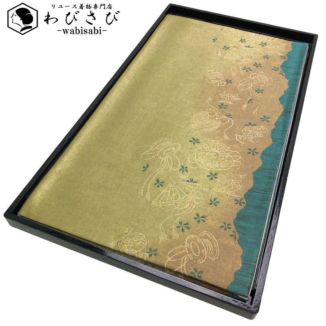 引き箔の金地に宝尽くしのおめでたい織柄でデザインされた素敵なお品でございます。
