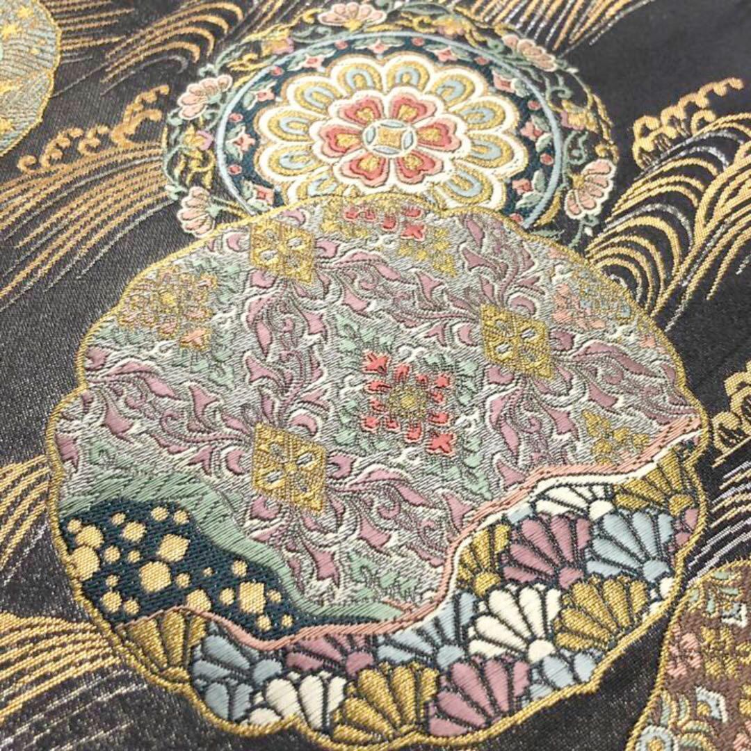 七彩吟繍織、丸花に美しい華柄模様、金彩の波模様などがとても煌びやかな美しいお品でございます。