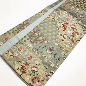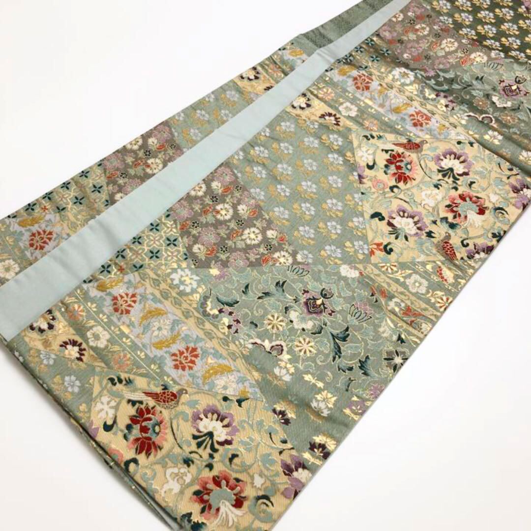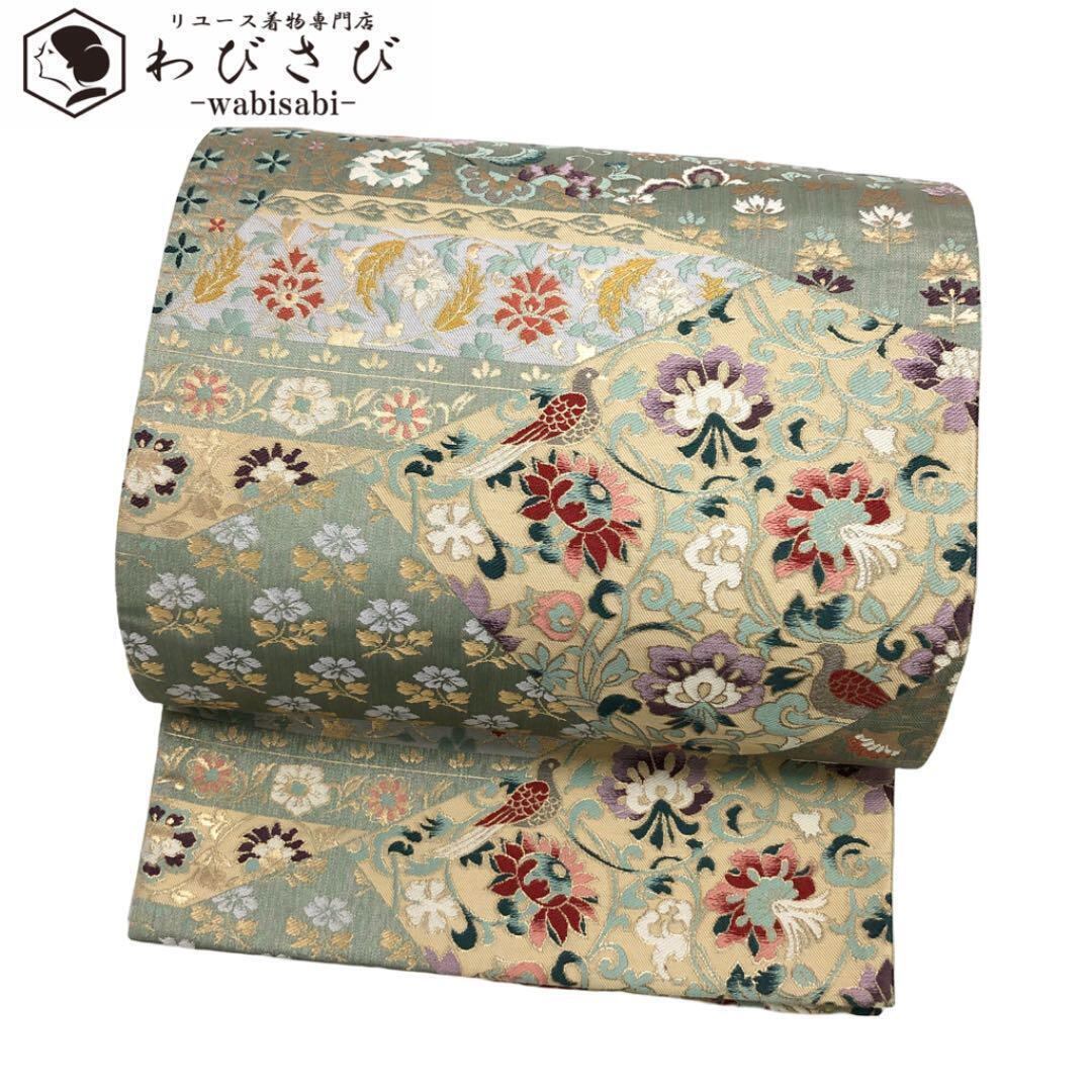 袋帯 花唐草に鳥柄 寄せ柄 灰緑色 O-1879