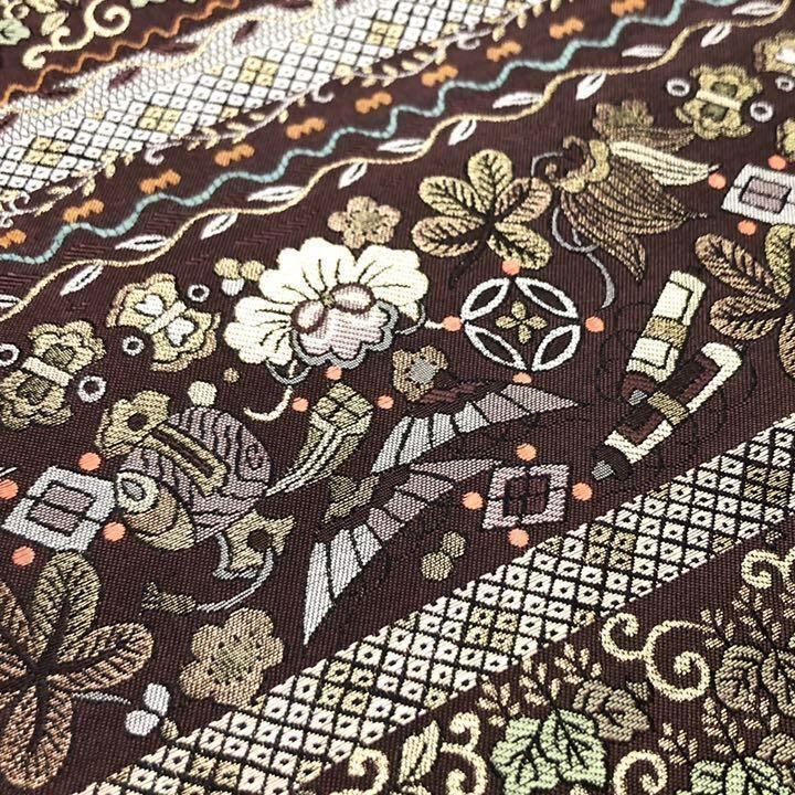 リボン織の独特の立体感のある素敵な織模様に花柄、宝尽くしがデザインされた美しいお品でございます。