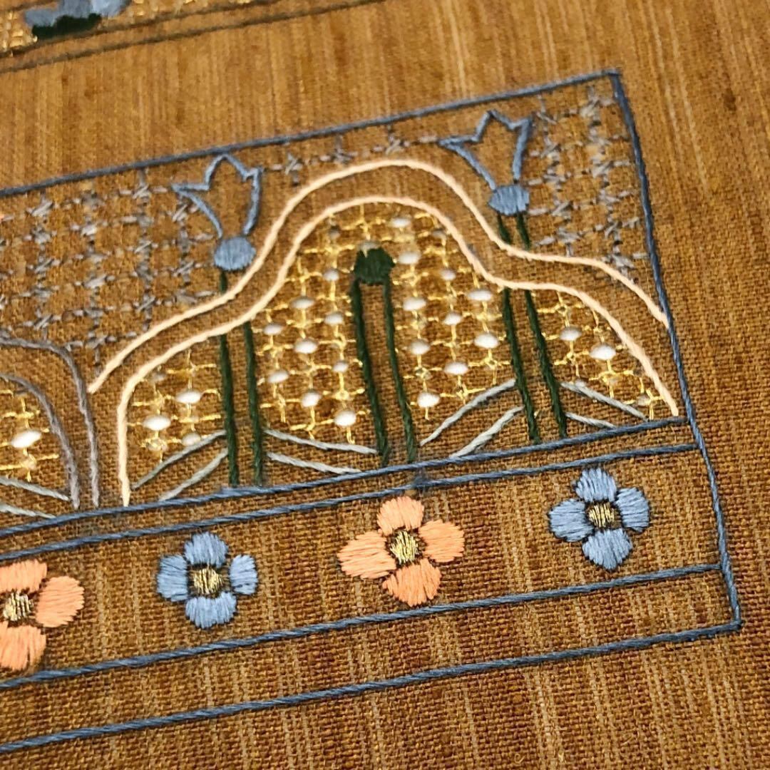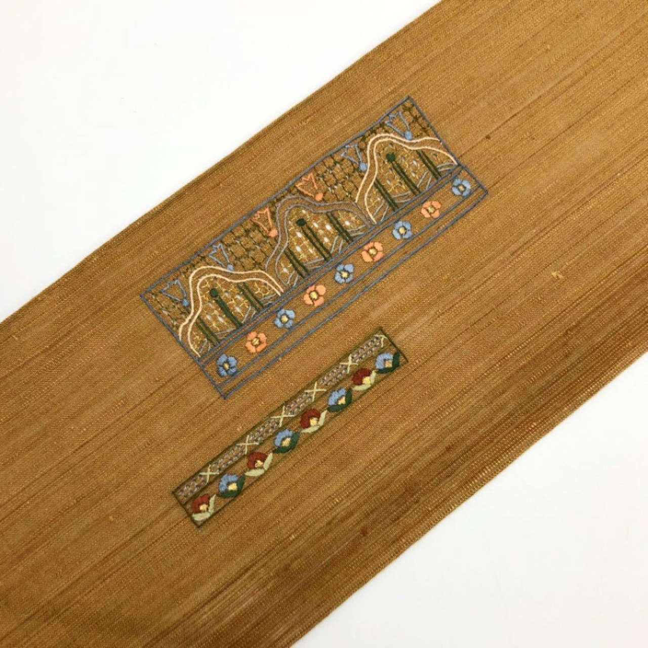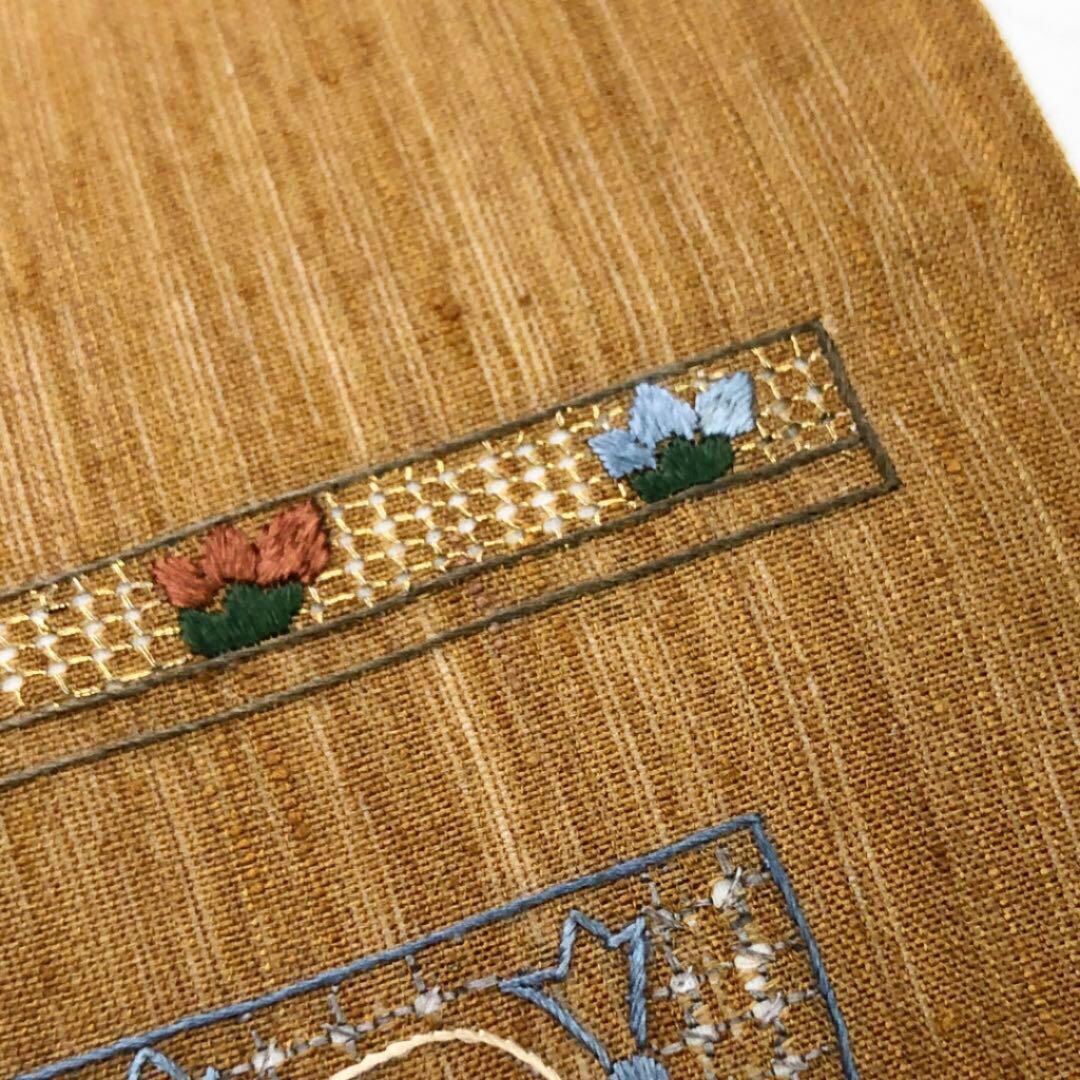 少し透け感のある色味の良い紬地に汕頭刺繍、蘇州刺繍で花柄模様がデザインされた素敵なお品でございます。