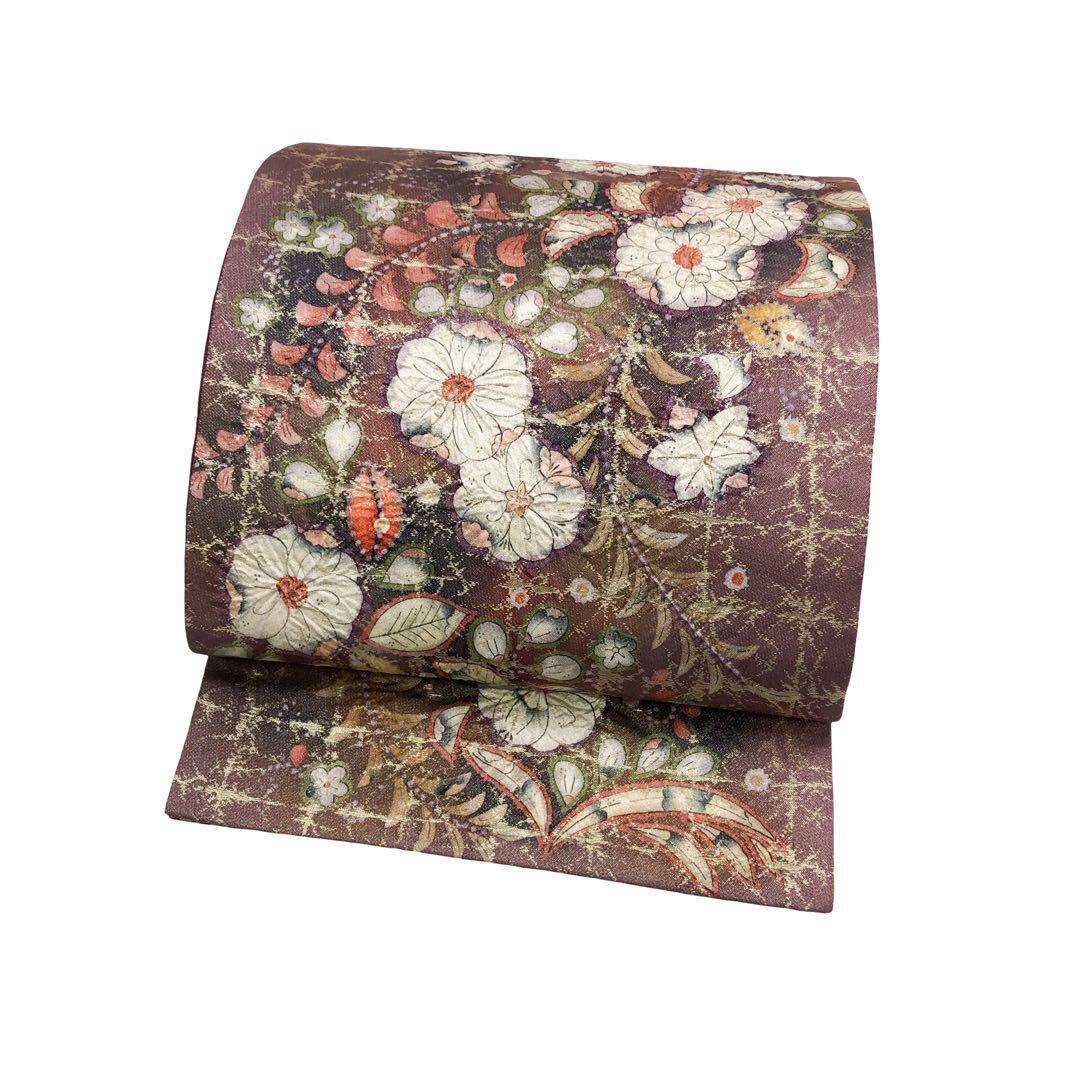 葡萄酒色の上品なお色味の銀通しに、金糸の格子模様に辻が花がデザインされた美しいお品でございます。