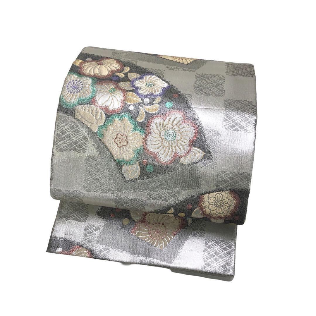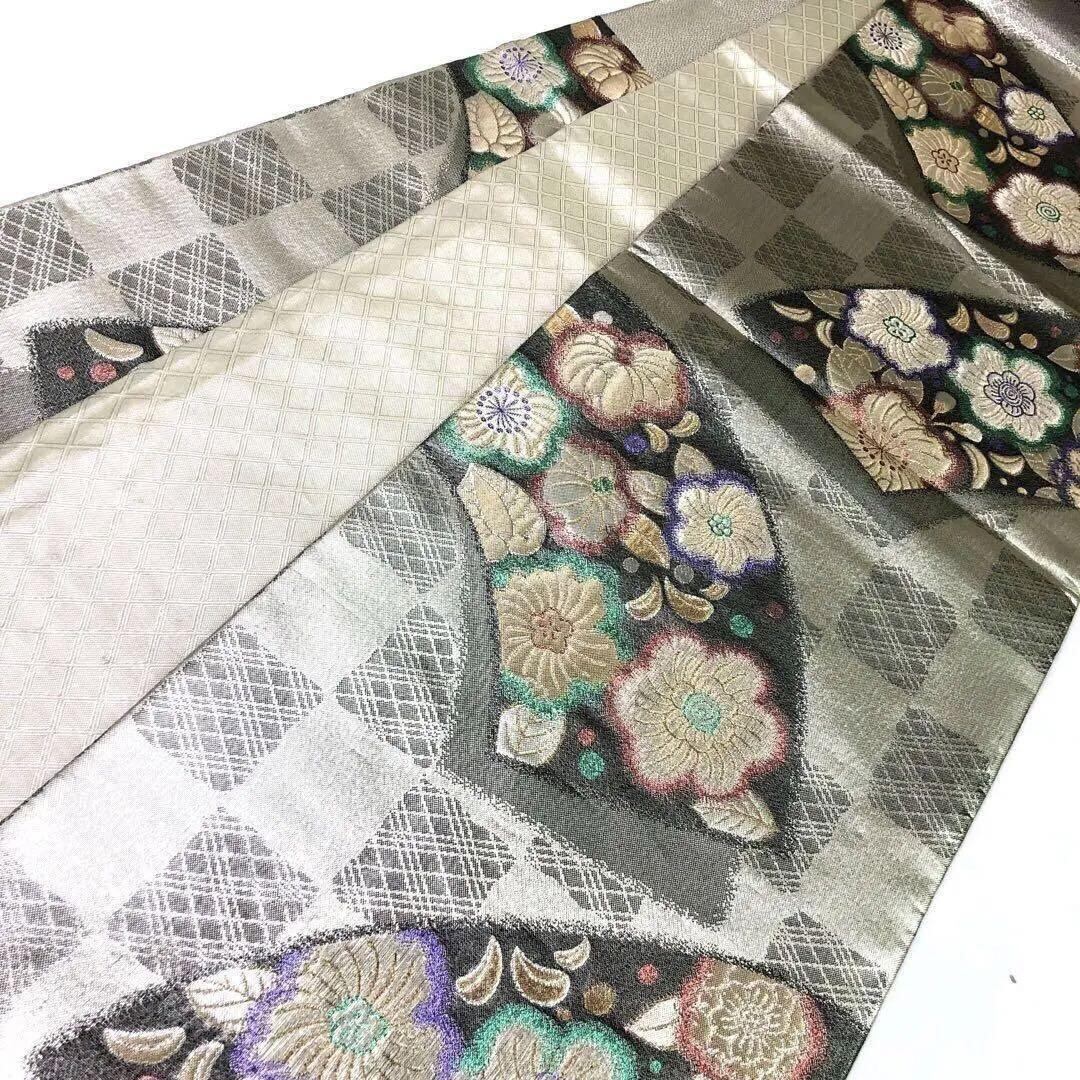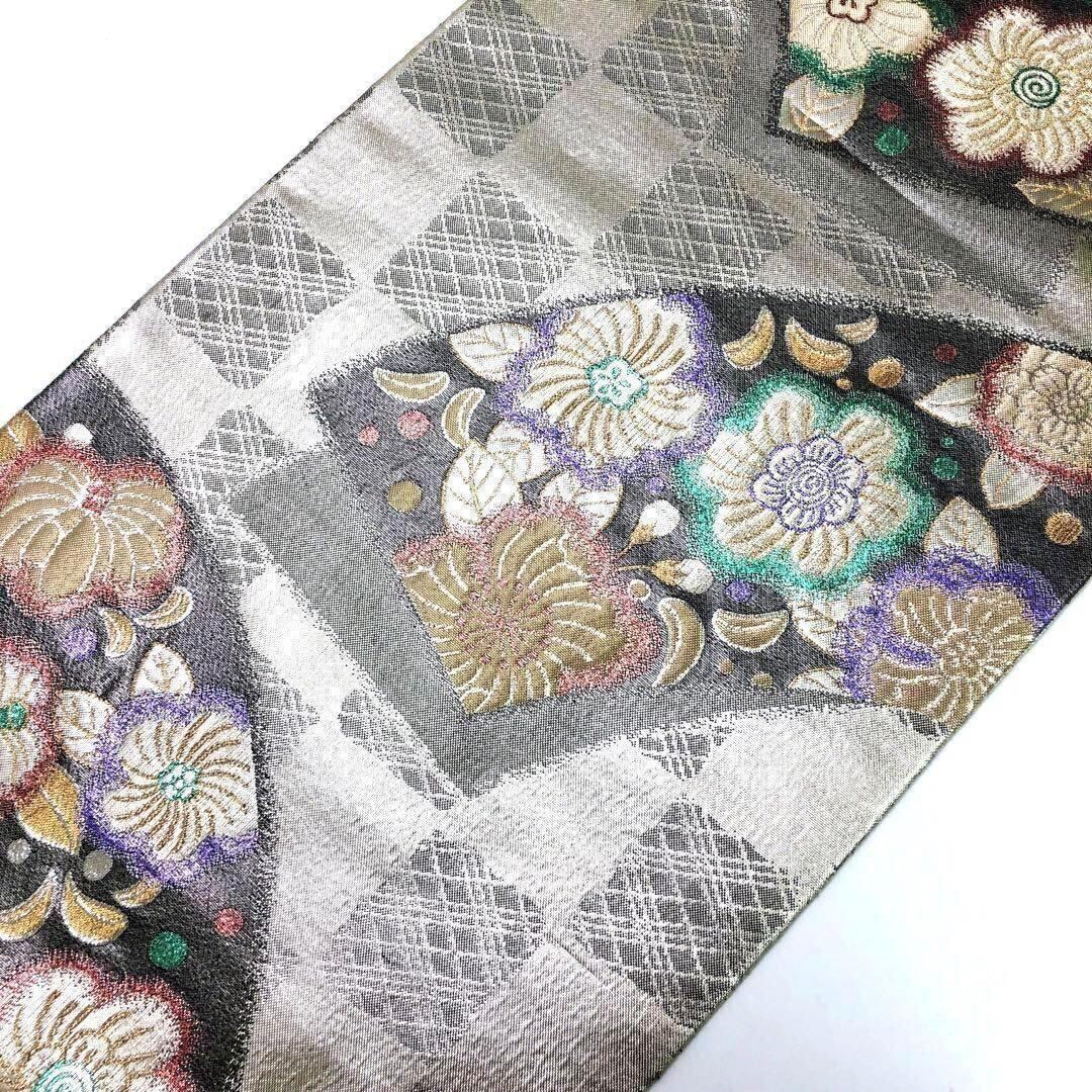 光沢感のあるグレー系の格子模様に辻が花がデザインされた素敵なお品でございます。