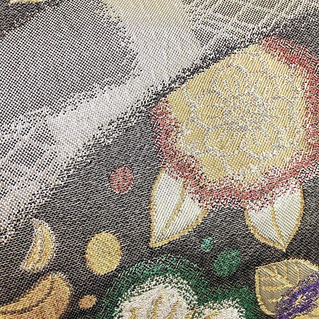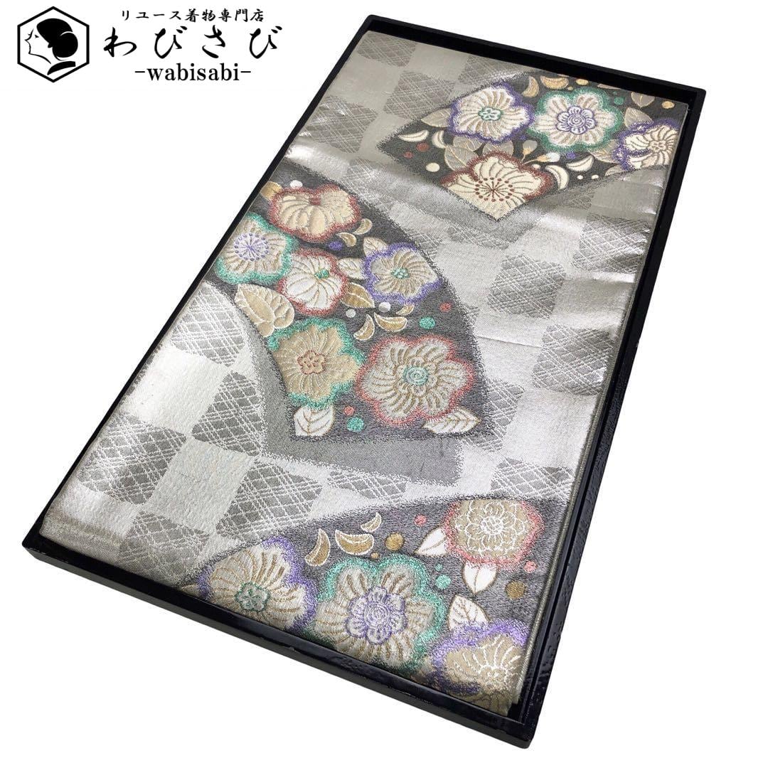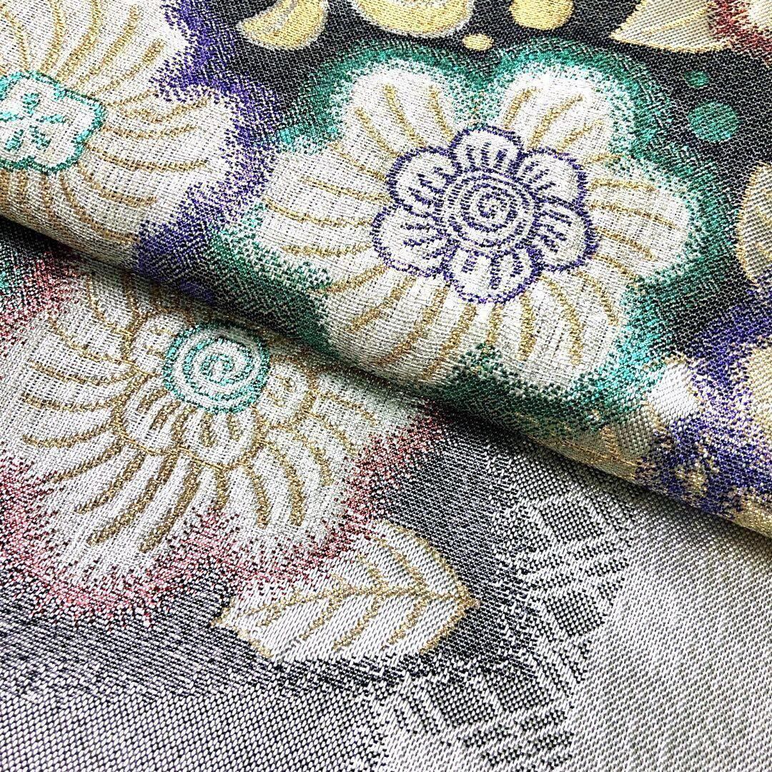 光沢感のあるグレー系の格子模様に辻が花がデザインされた素敵なお品でございます。