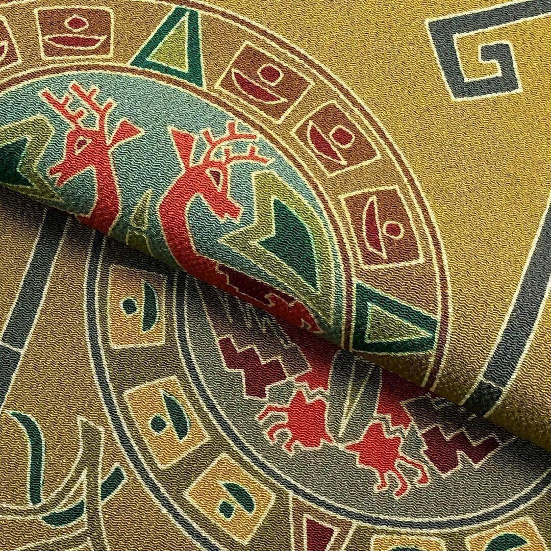 国防色の品のあるお色味の縮緬に抽象模様でデザインされた丸に動物柄の素敵なお品でございます。