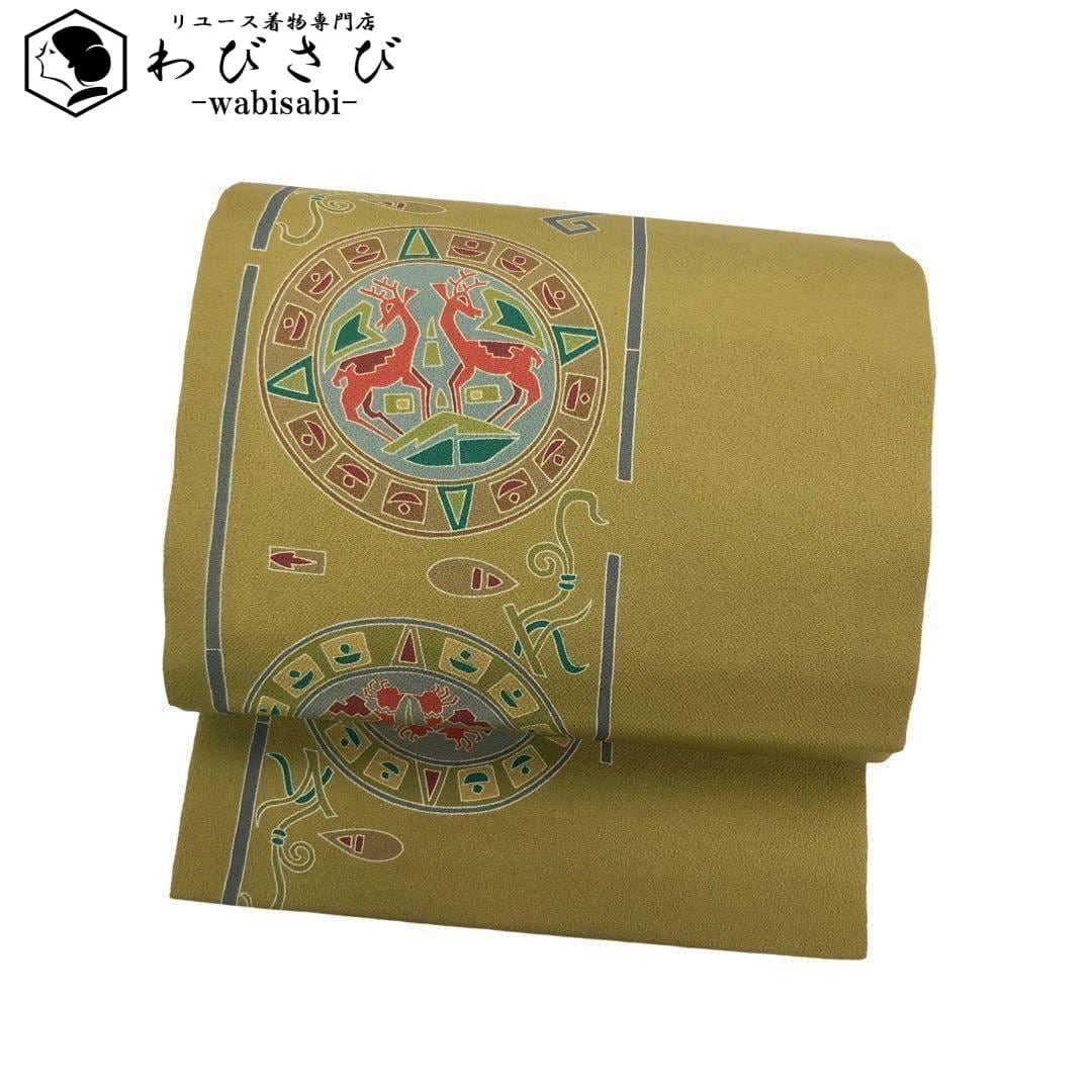 名古屋帯 丸に動物柄 抽象模様 国防色 縮緬 長尺 O-2357 着物 きもの kimono 和服 和装 中古 リサイクル着物 【送料無料】