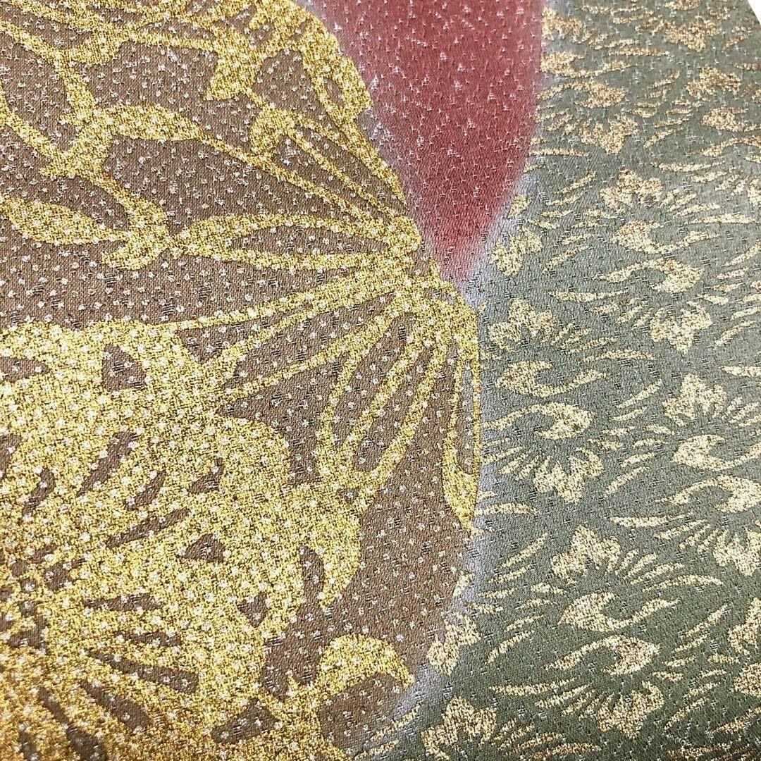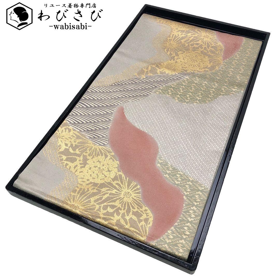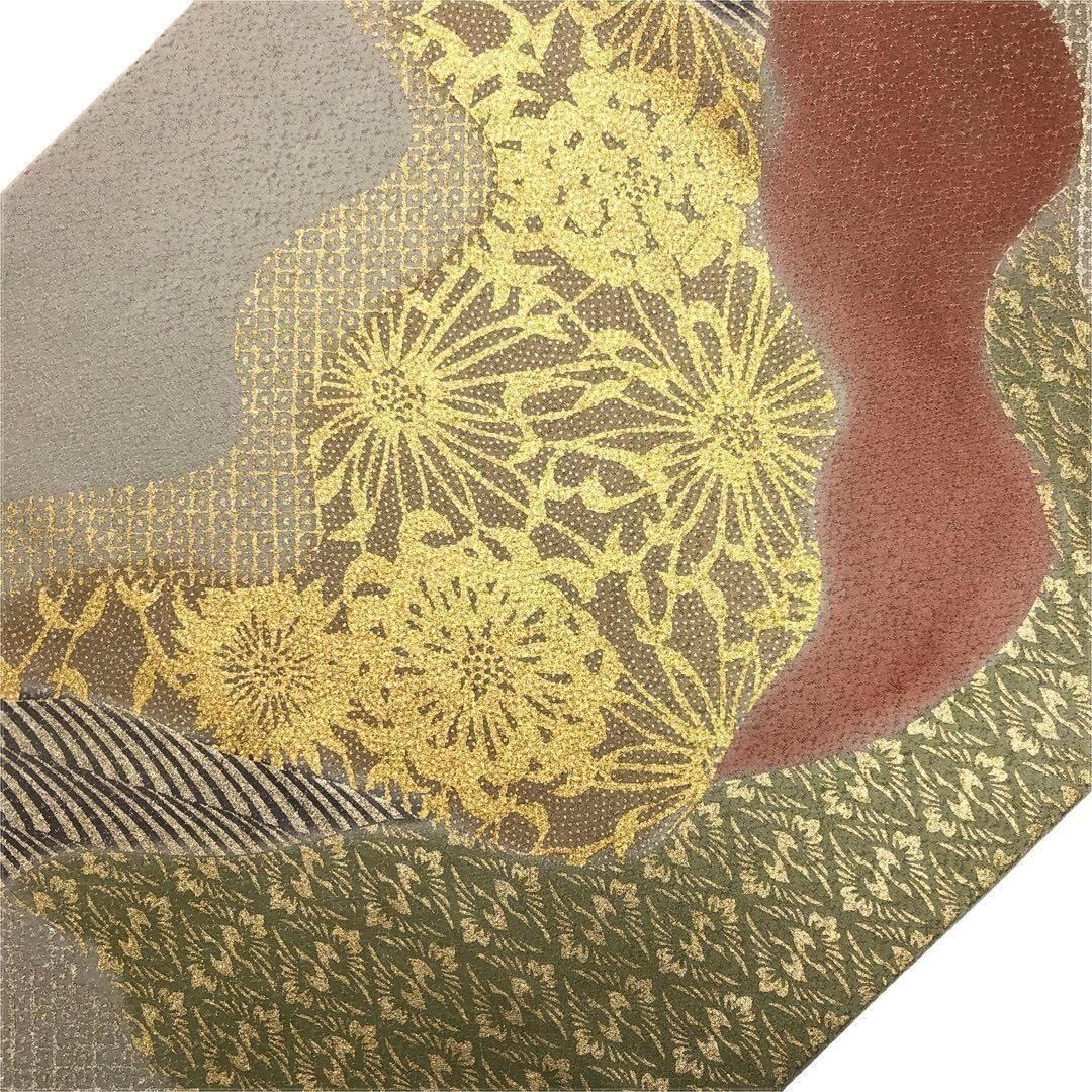 袋帯 一期一会 花柄模様 向鶴菱 金彩 絹鼠色 O-2366 着物 きもの kimono 和服 和装 中古 リサイクル着物 【送料無料】