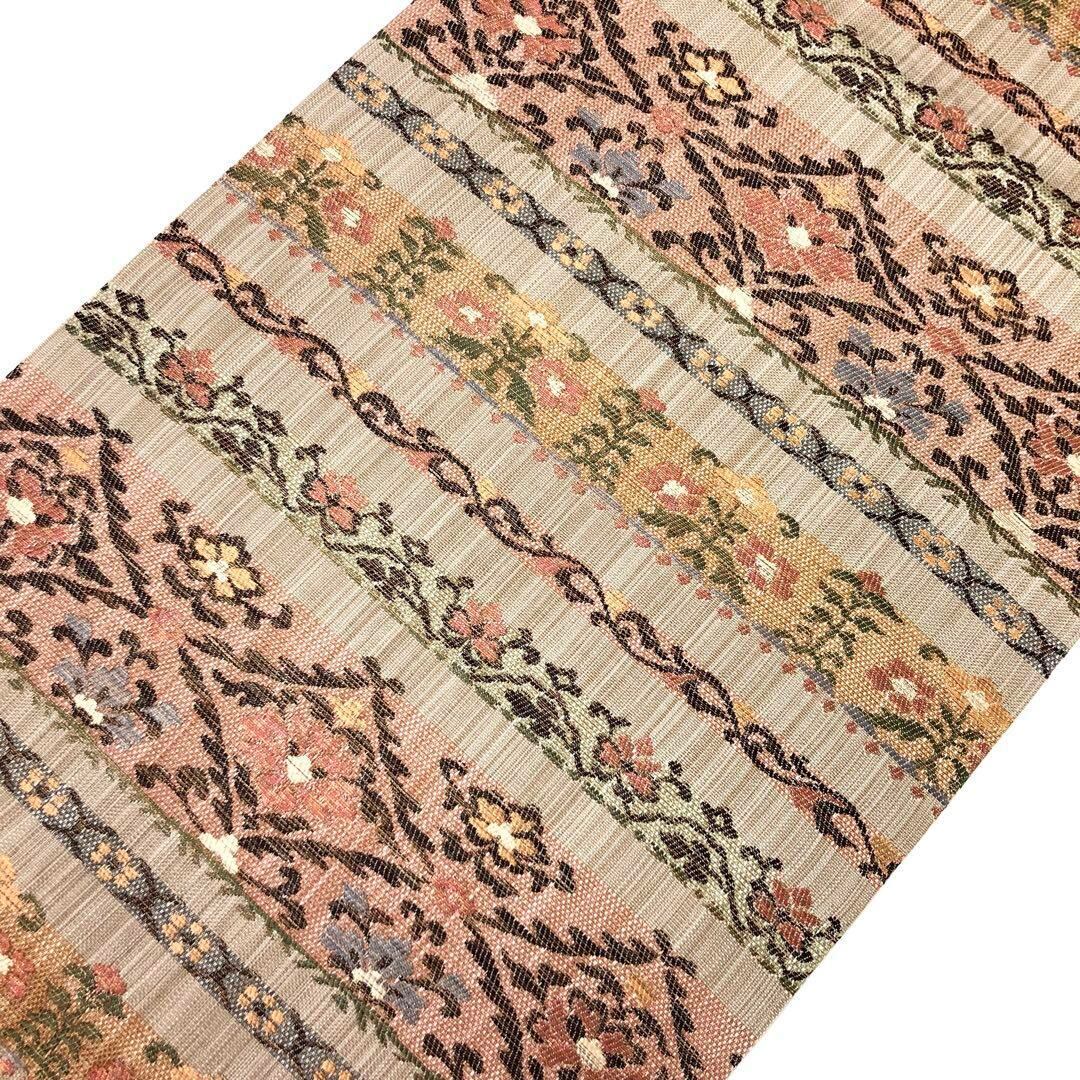 白橡色の品のあるお色味にうっすら縦縞模様に横段の淡いお色味に花唐草模様がデザインされた素敵なお品でございます。