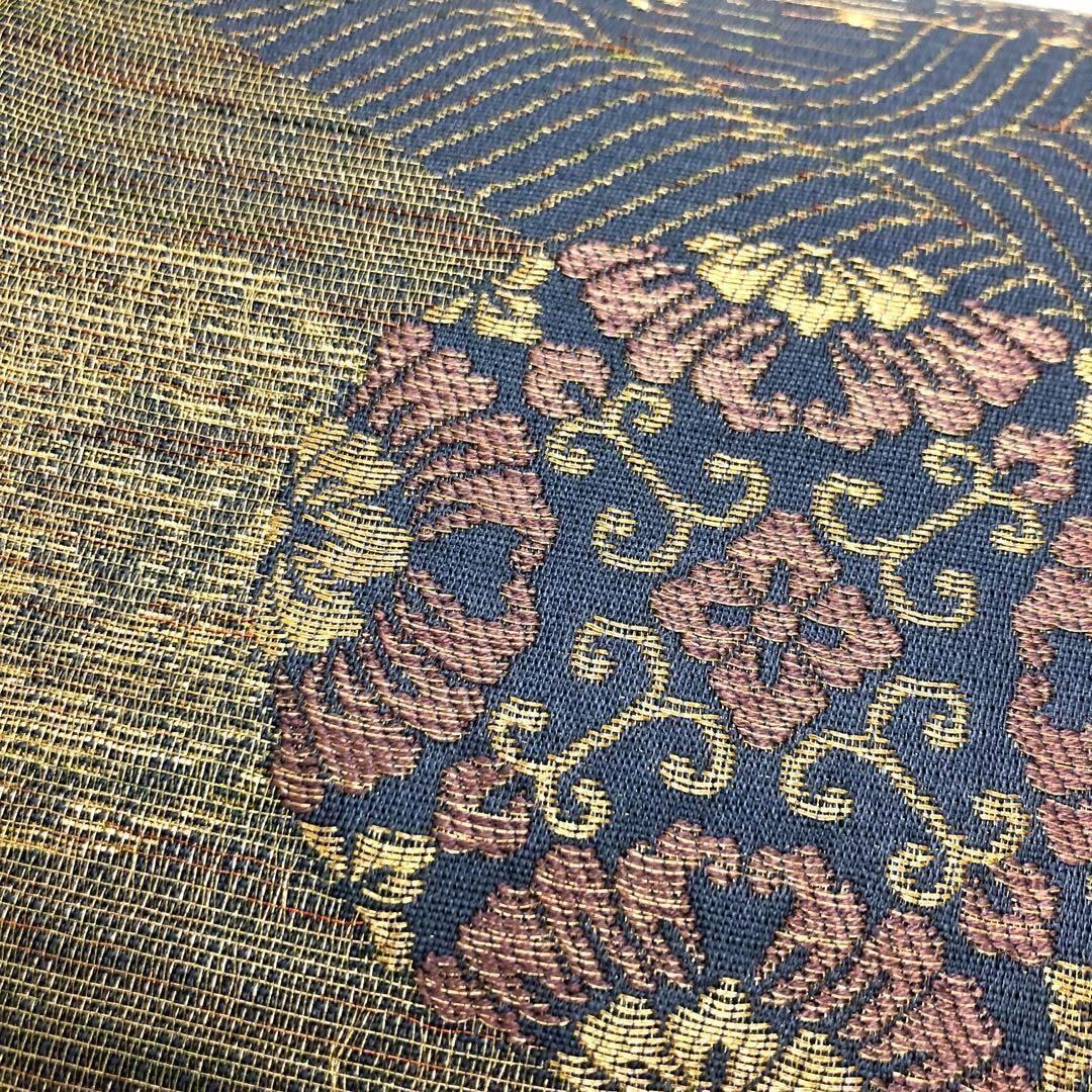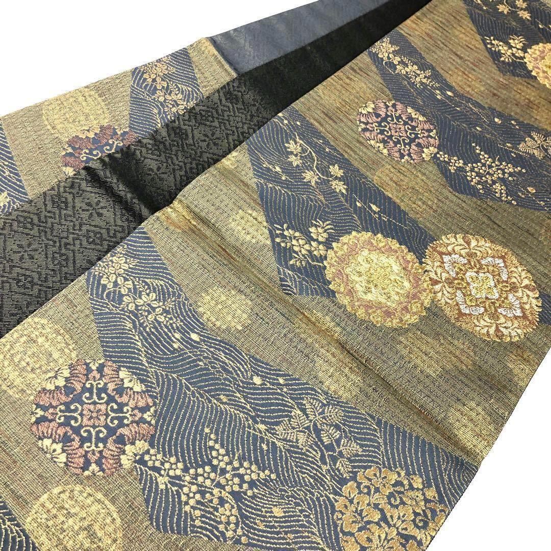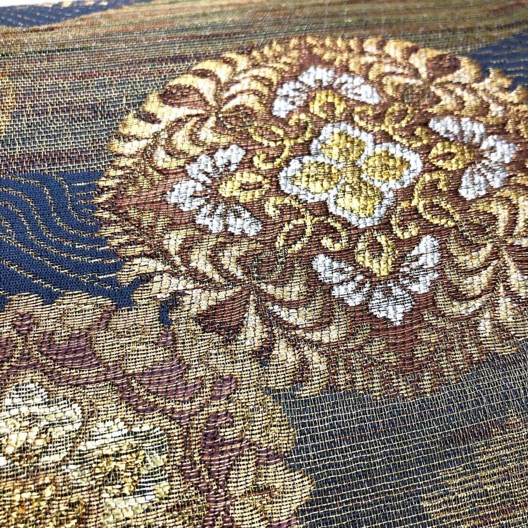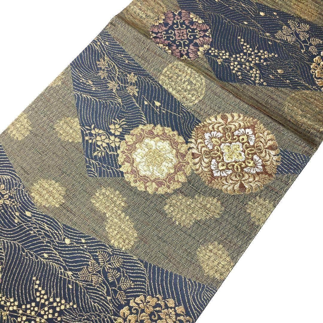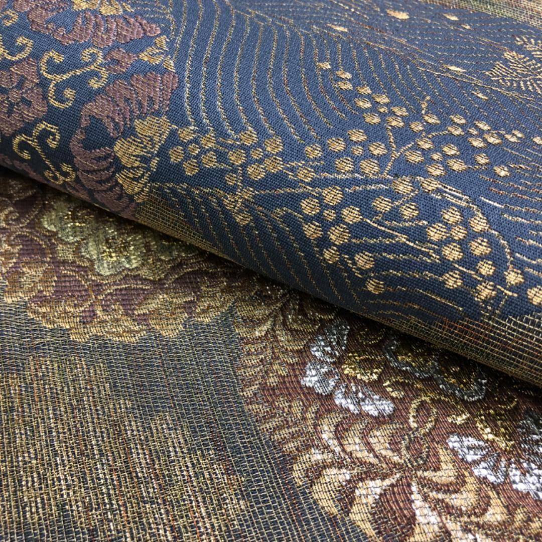 淡い紺藍色のお色味に金銀糸を使って煌びやかにデザインされた流水に華丸紋様が素敵なお品でございます。