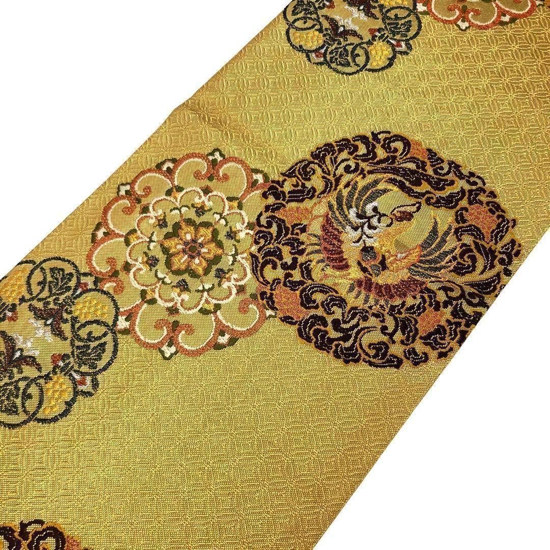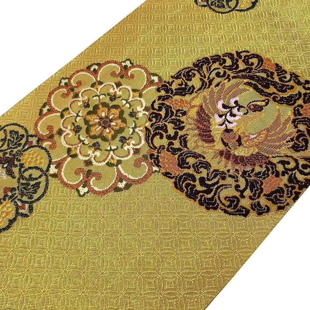 袋帯 宮廷貝榮 連珠華文 七宝 鶴 黄金色 O-2482 着物 きもの kimono 和服 和装 中古 リサイクル着物 【送料無料】