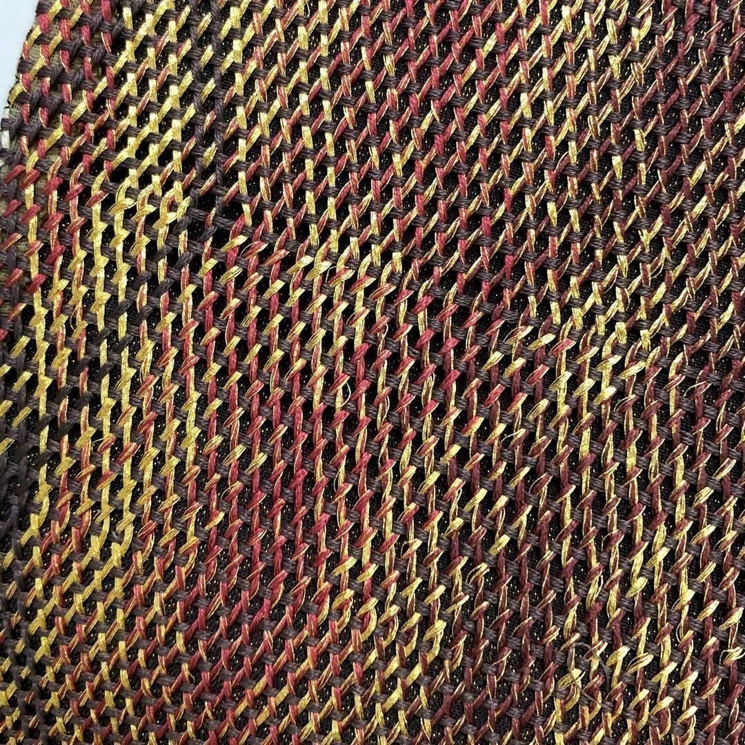 落ち着いたお色味の黒から赤黒く高級感のあるお色味のグラデーションに金糸を使った交差する織模様が美しい素敵なお品でございます。