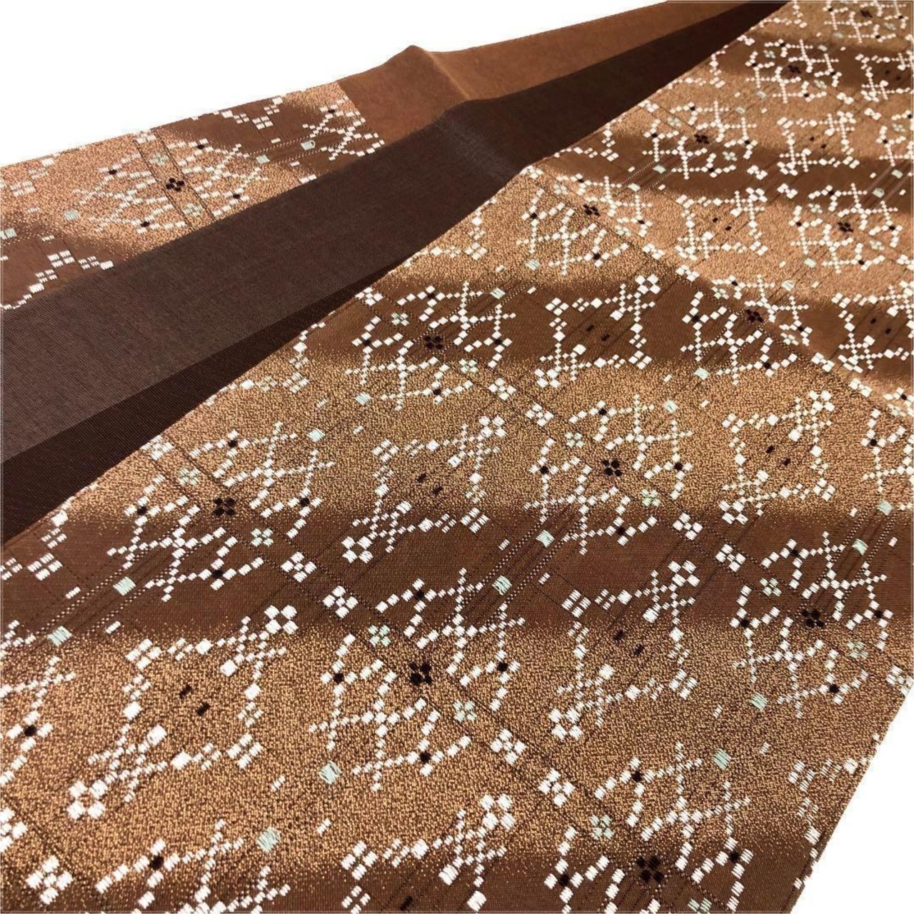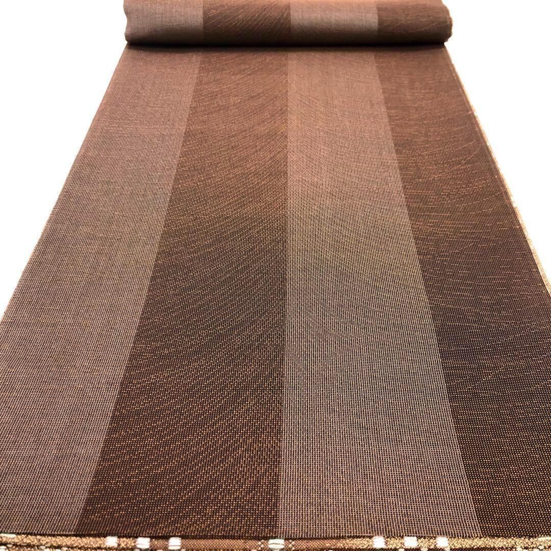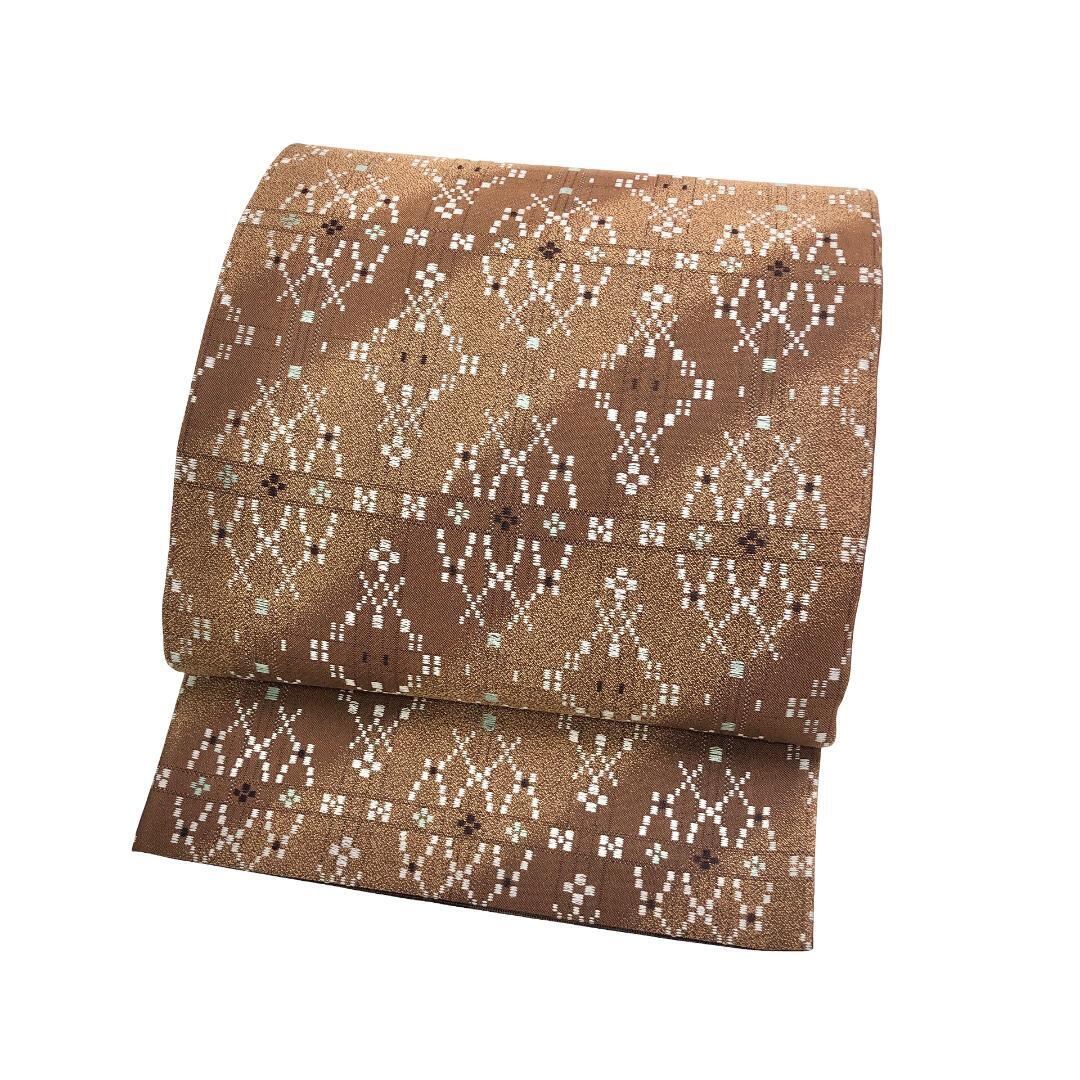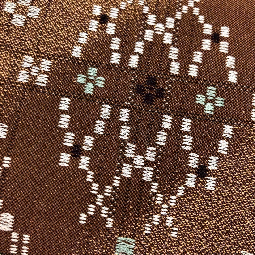 土器色と杉染色の落ち着いたお色味の斜め模様のグラデーションの紬地に花織がデザインされた素敵なお品でございます。