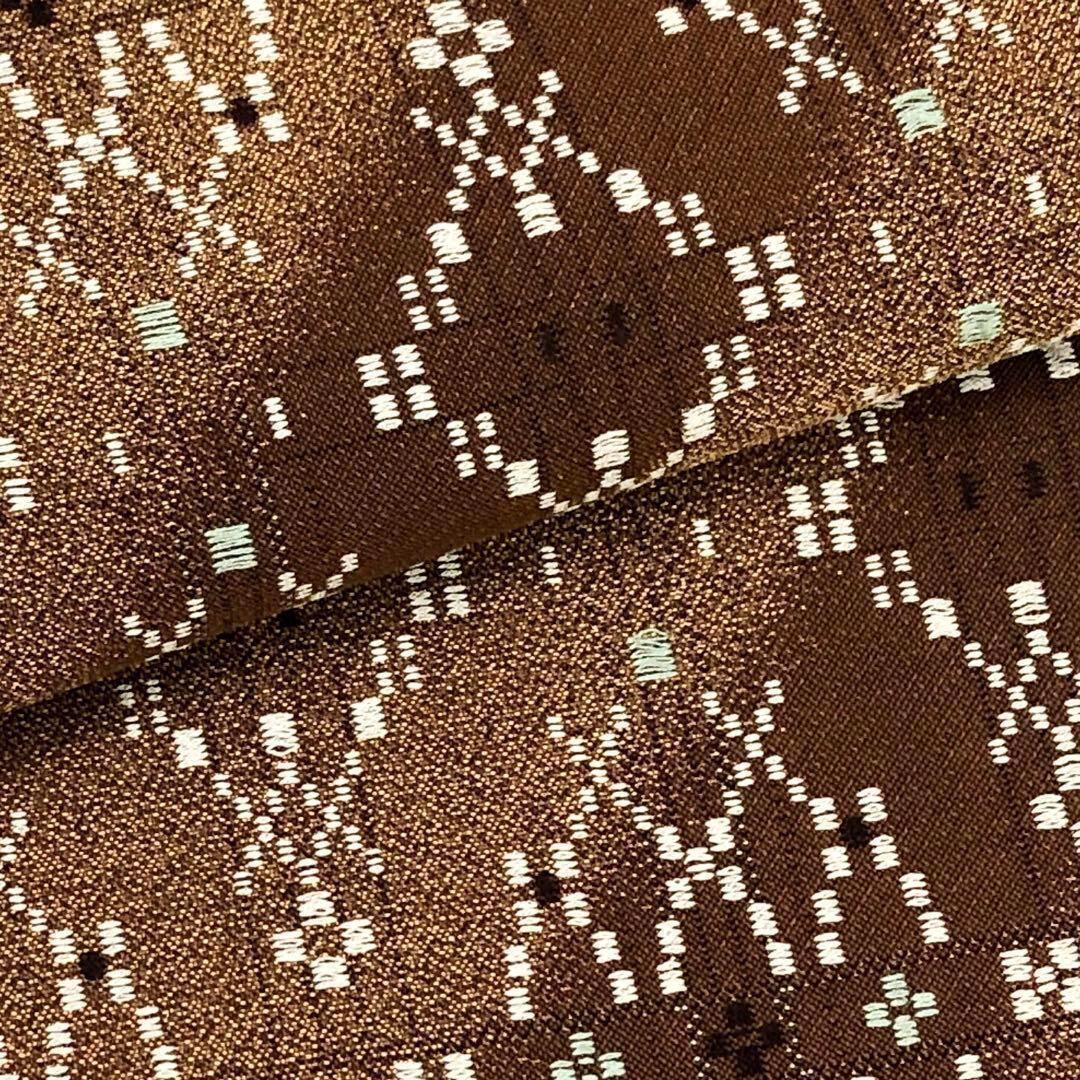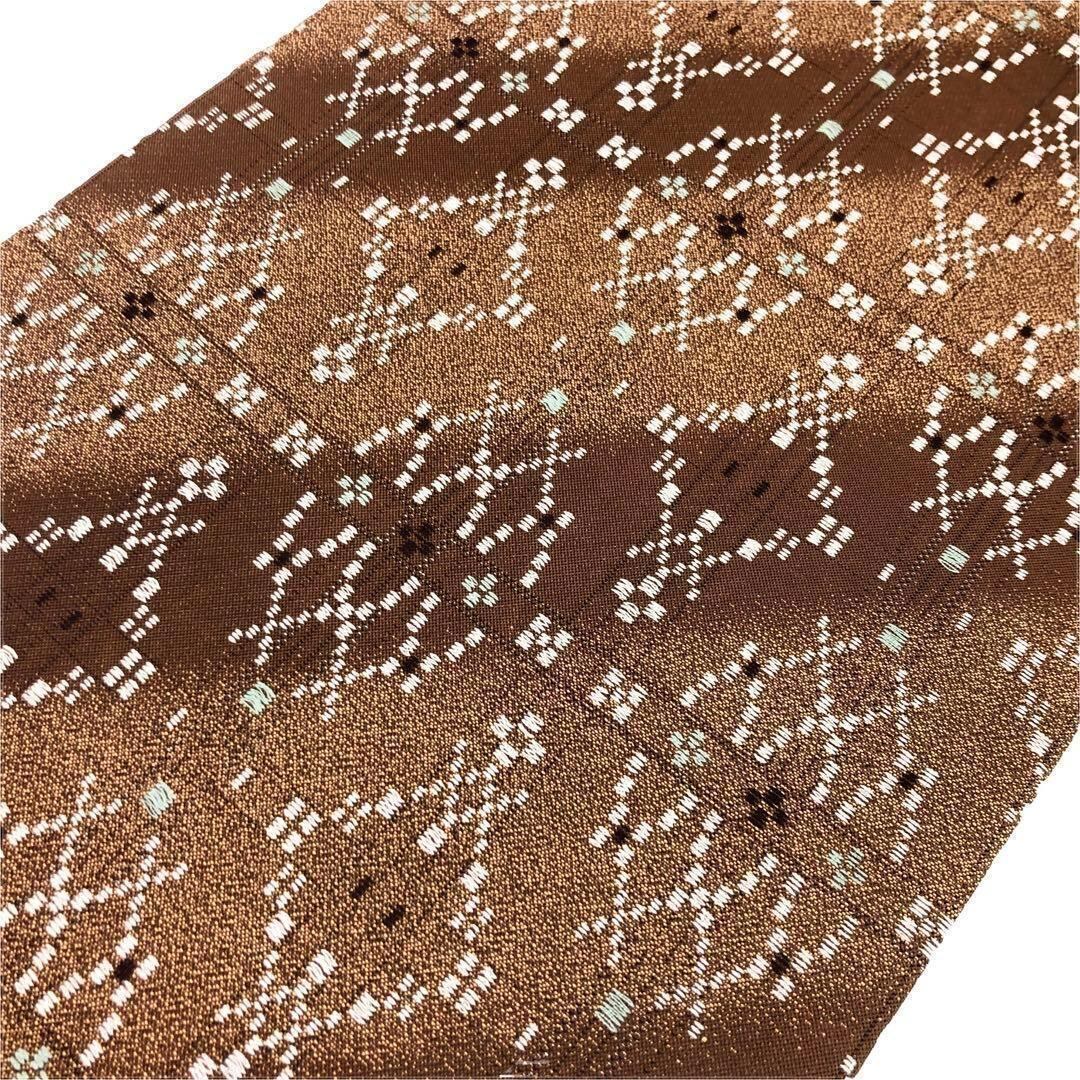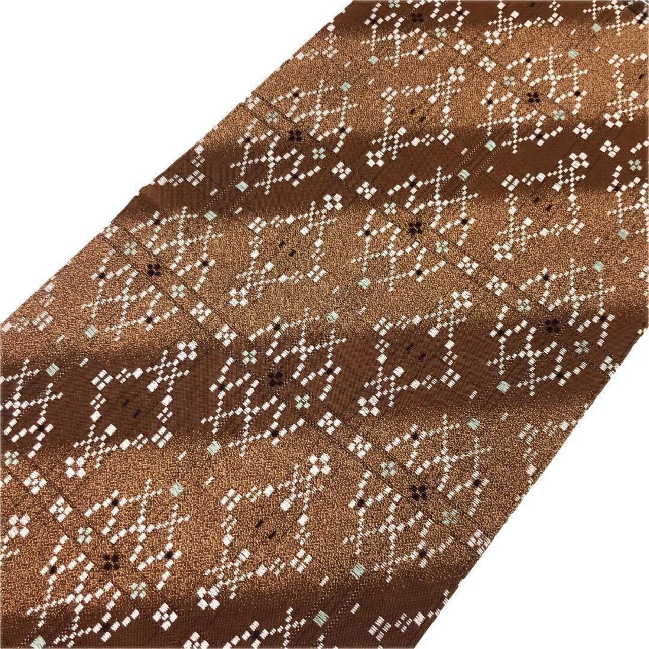 土器色と杉染色の落ち着いたお色味の斜め模様のグラデーションの紬地に花織がデザインされた素敵なお品でございます。
