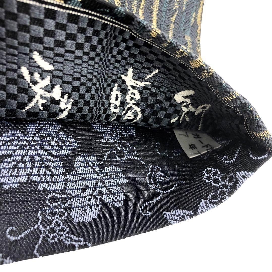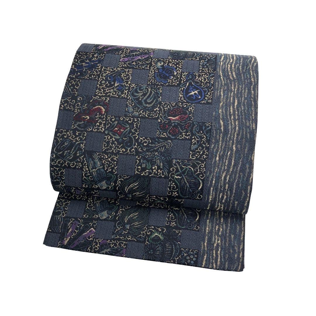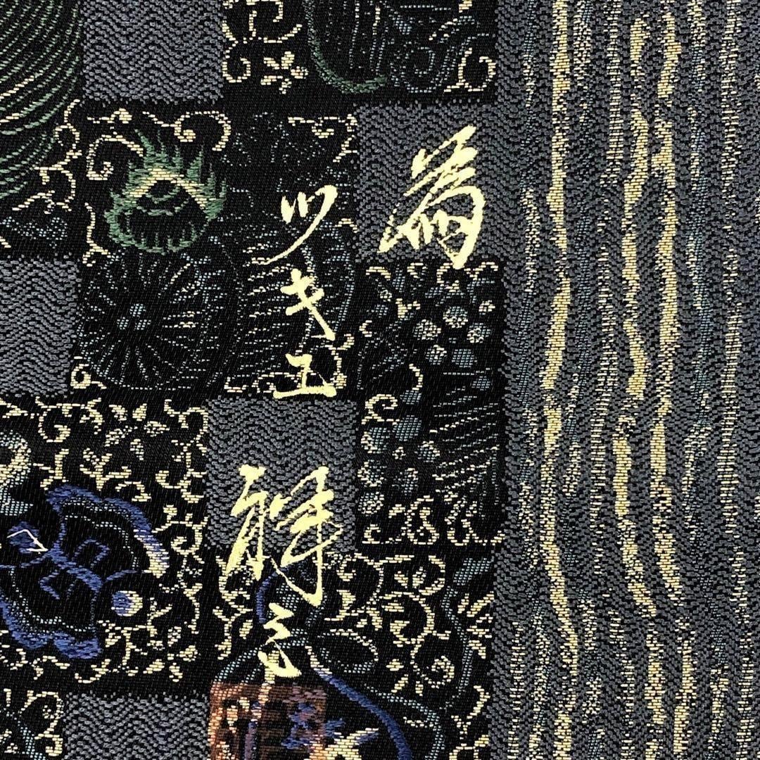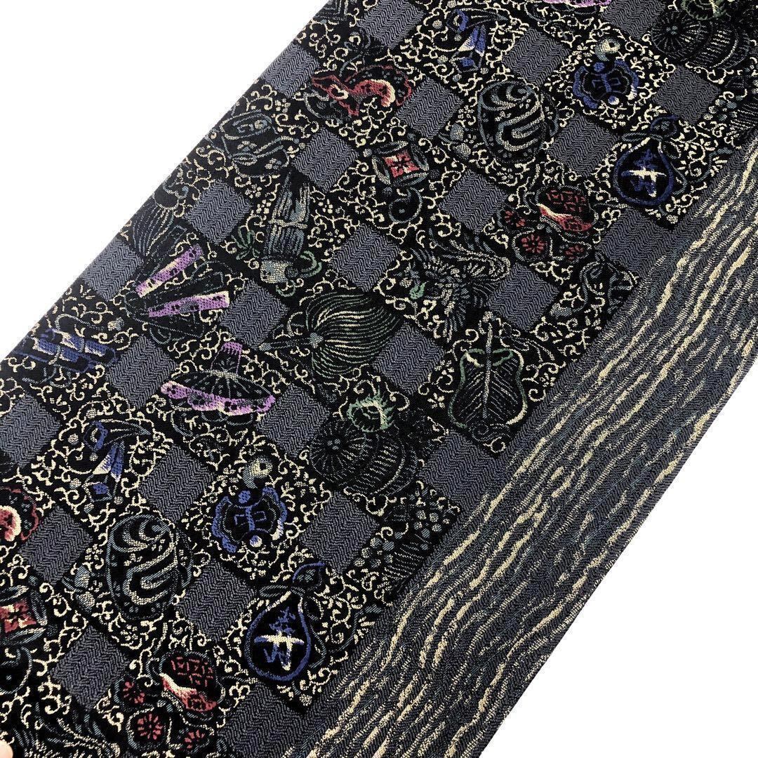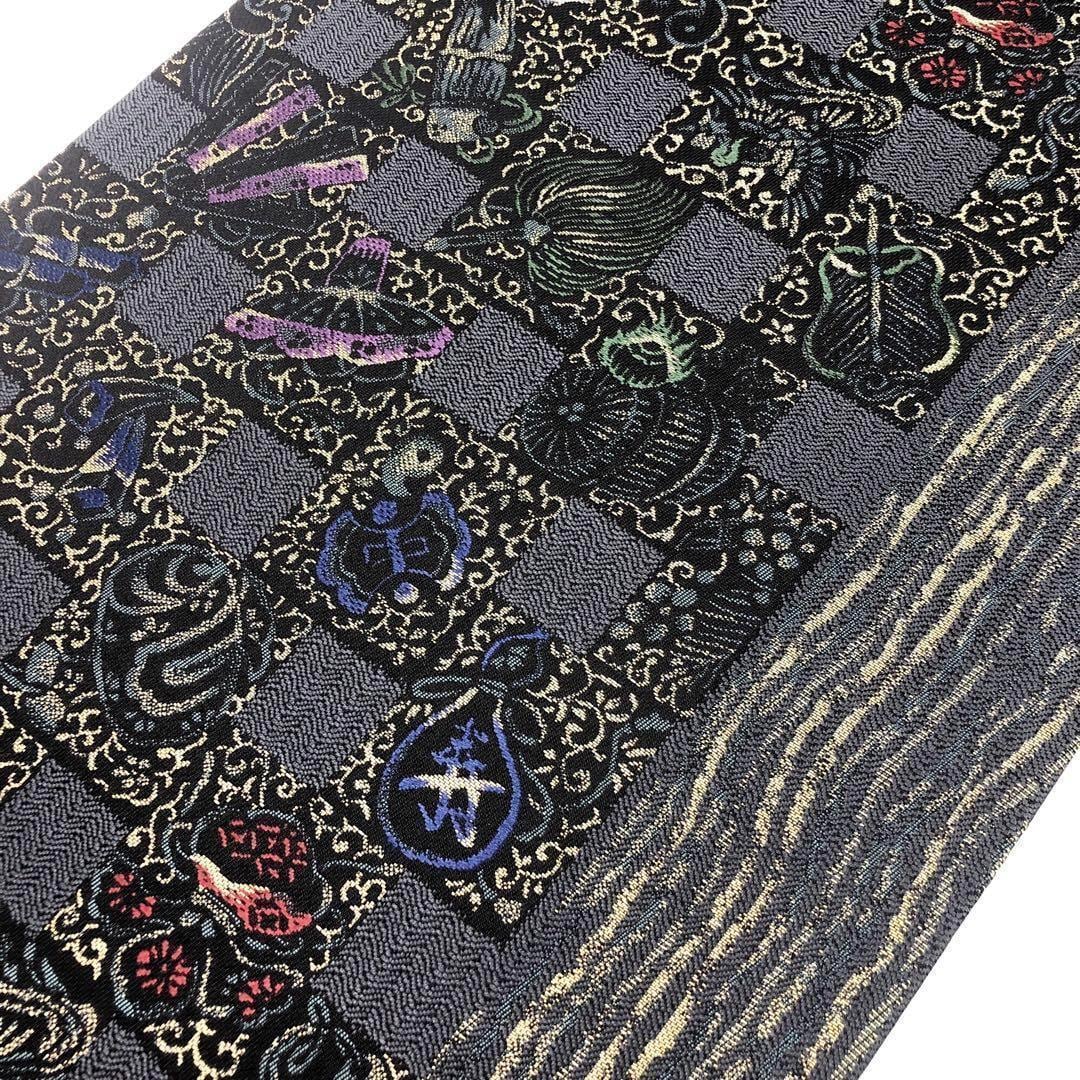 臈彩染め、藍鼠色ページのお色味に四角模様に宝尽くしがモダンで立体感のある美しいデザインで表現された素敵なお品でございます。