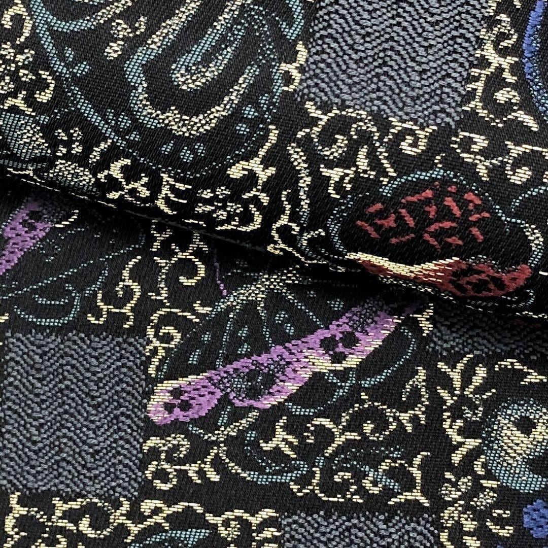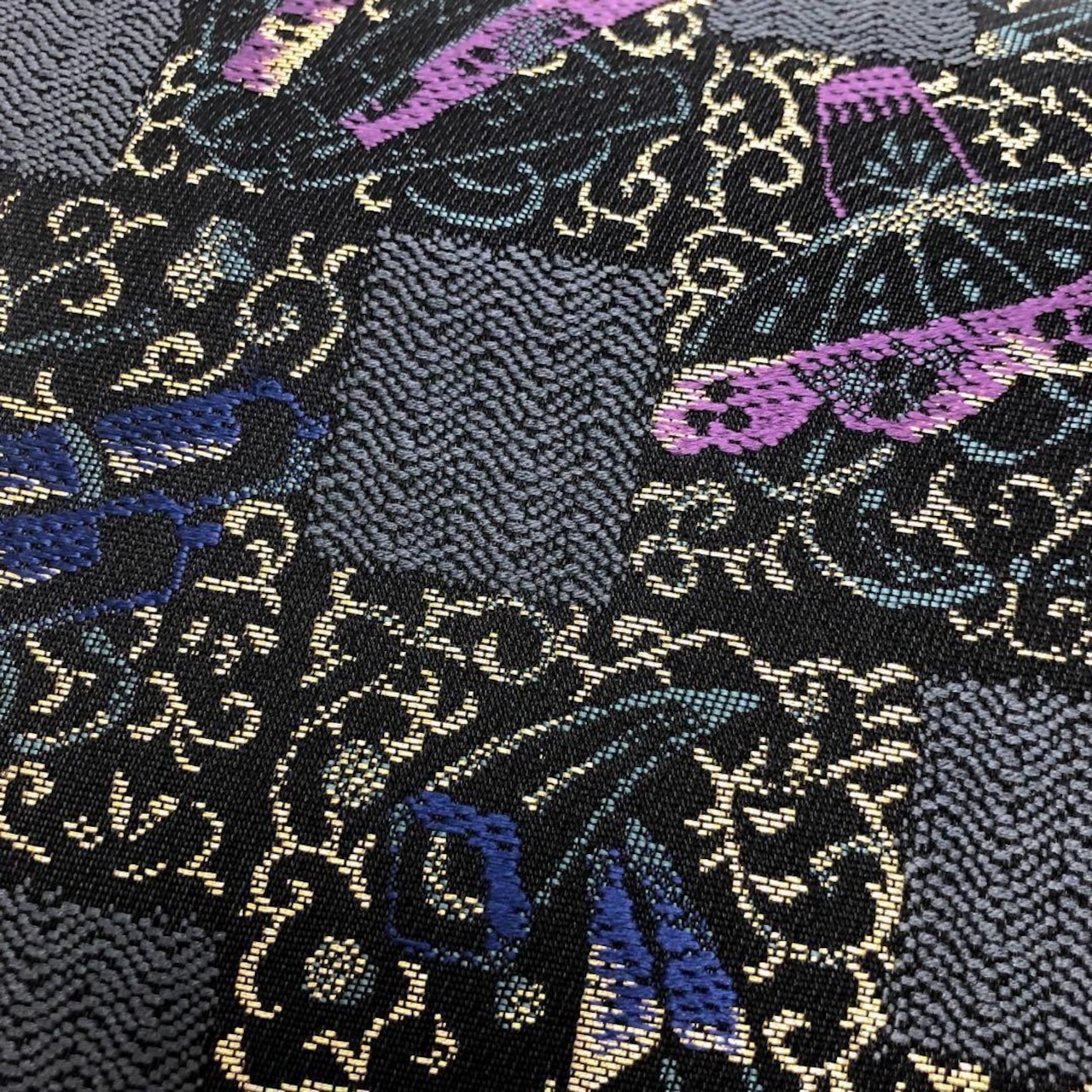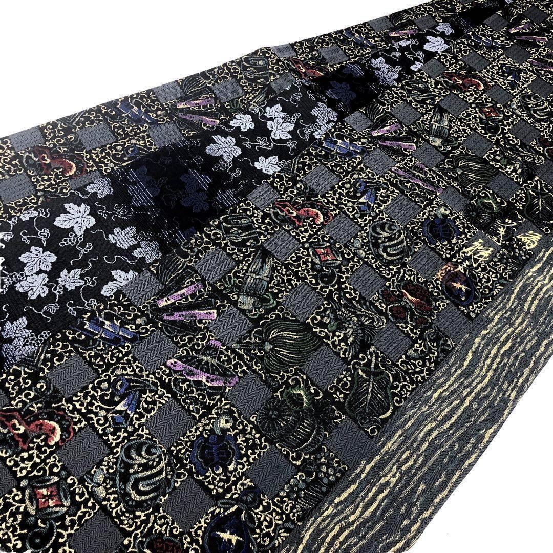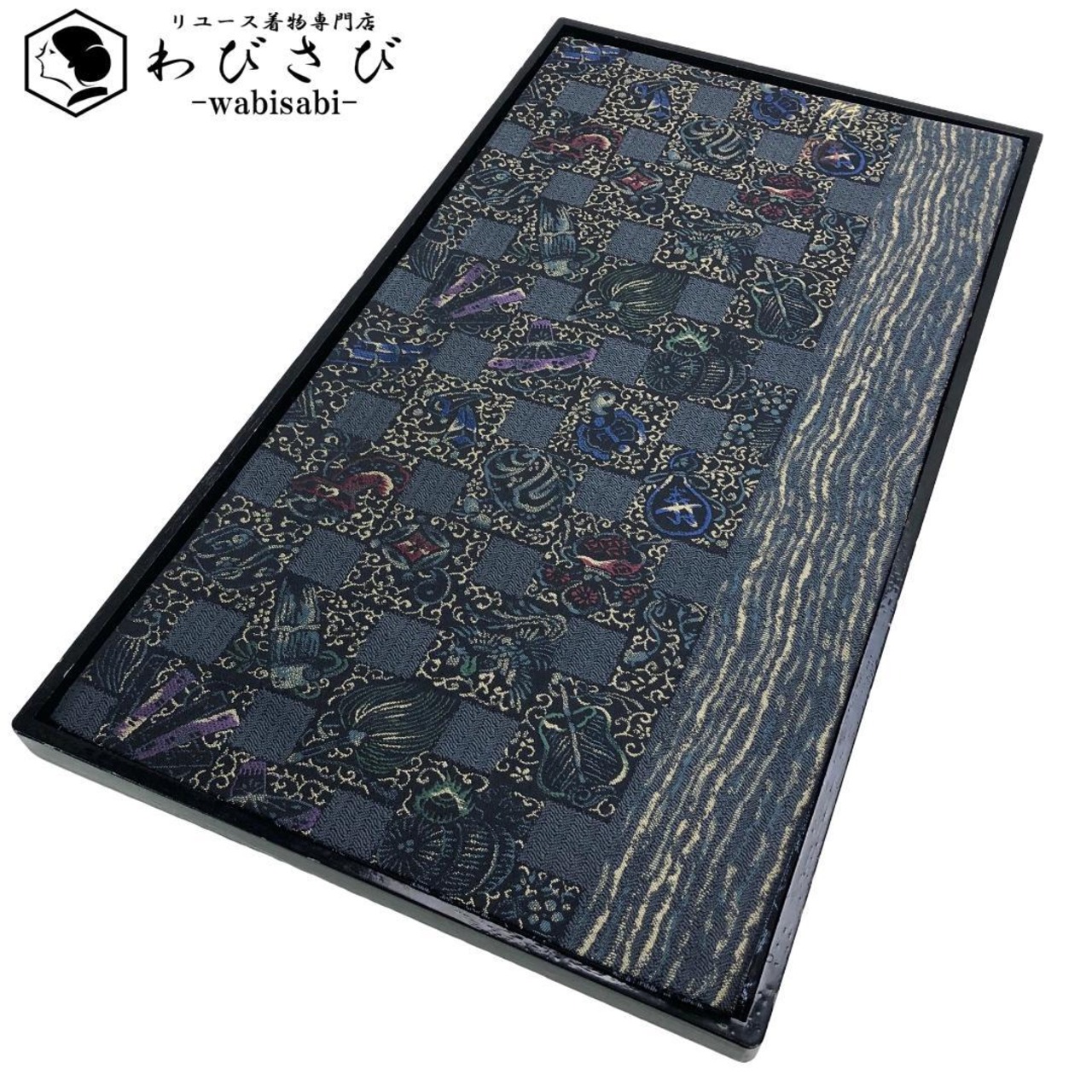 臈彩染め、藍鼠色ページのお色味に四角模様に宝尽くしがモダンで立体感のある美しいデザインで表現された素敵なお品でございます。