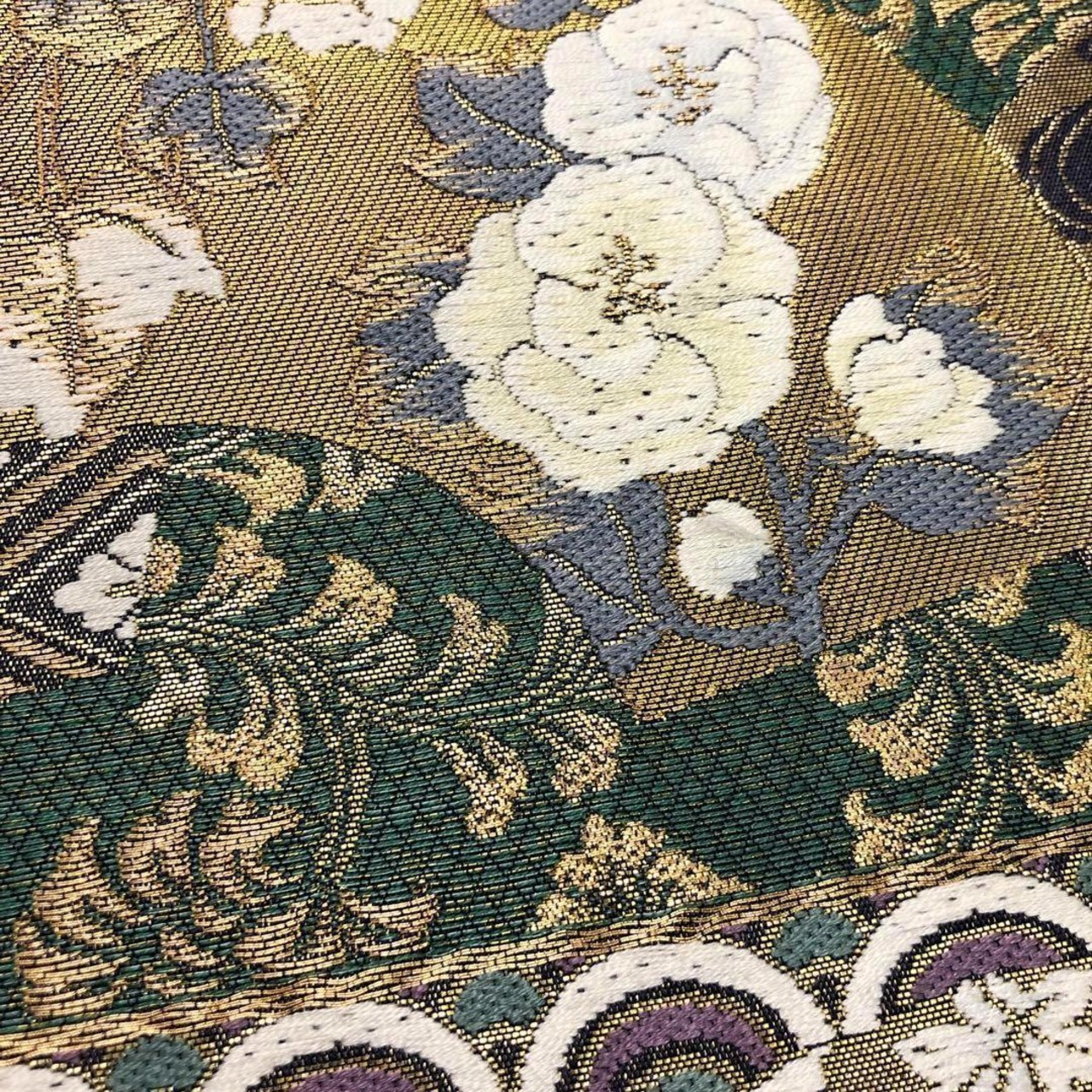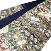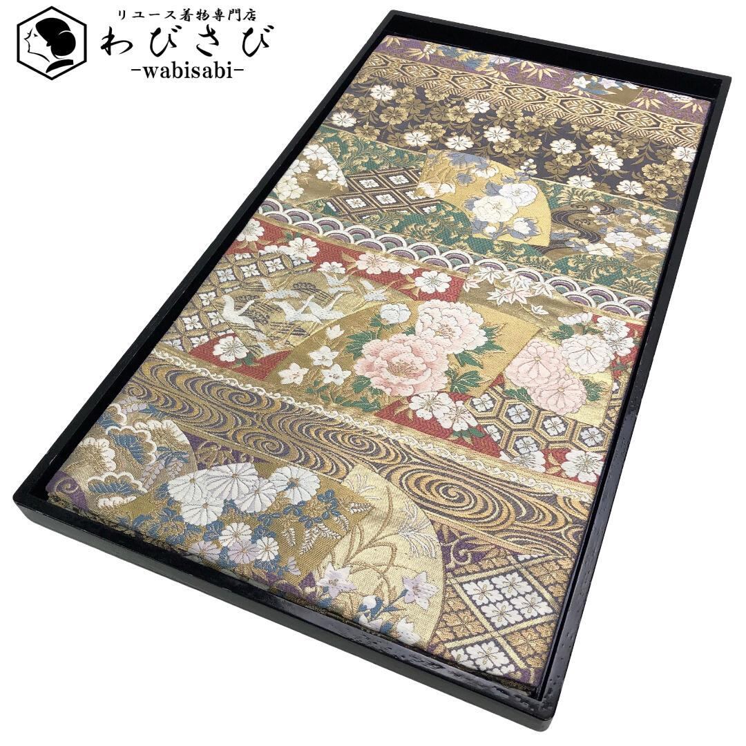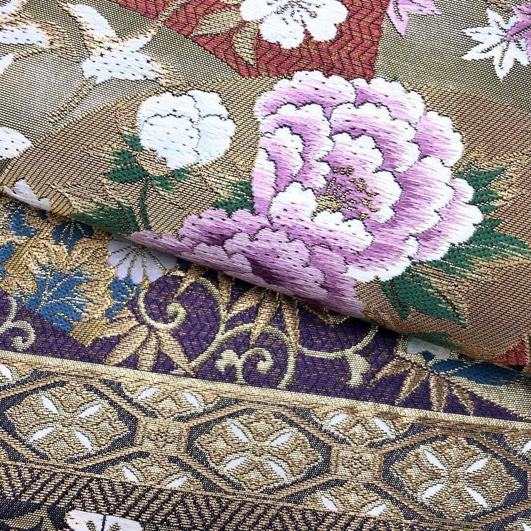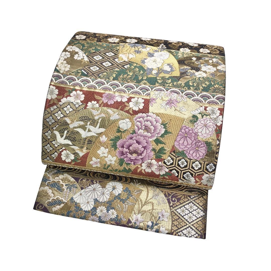 地紙紋に鶴、牡丹や菊などの四季の花々がデザインされた華やかで美しいお品でございます。