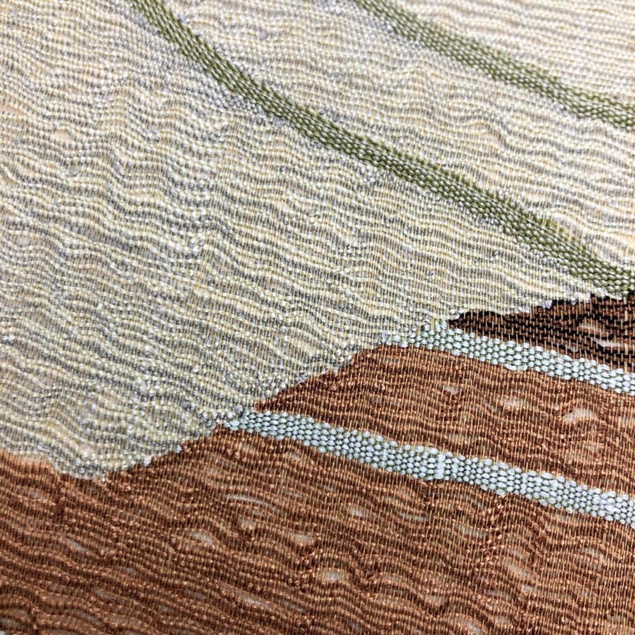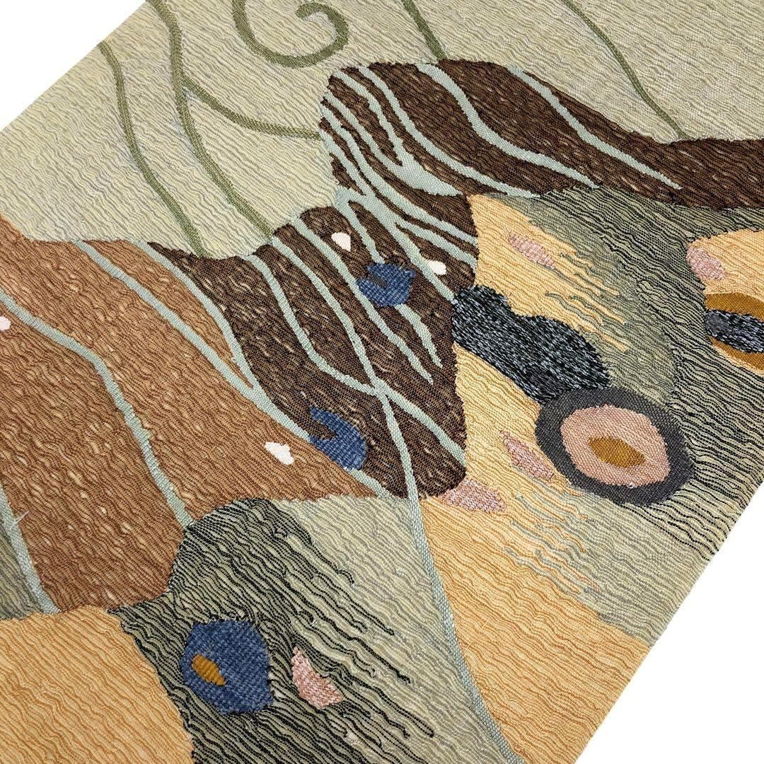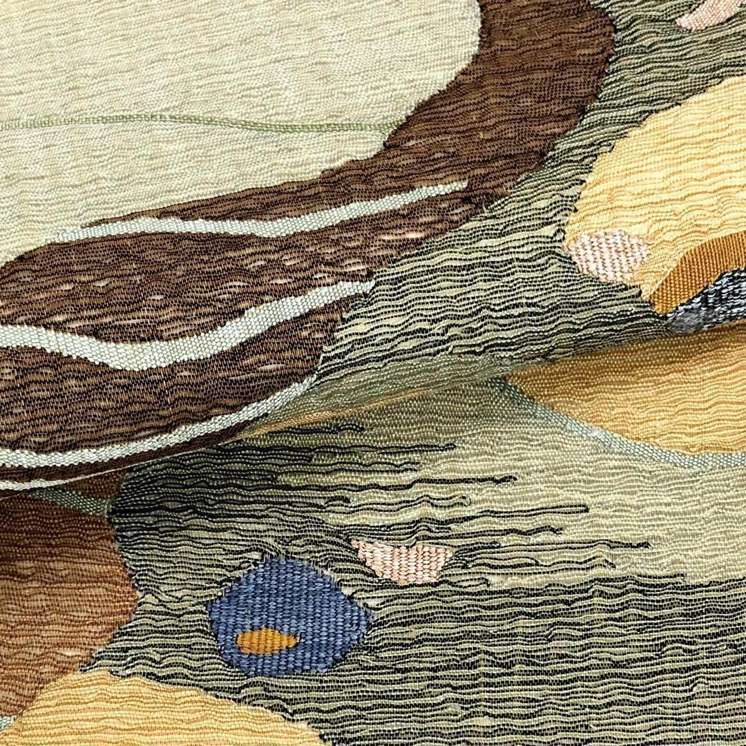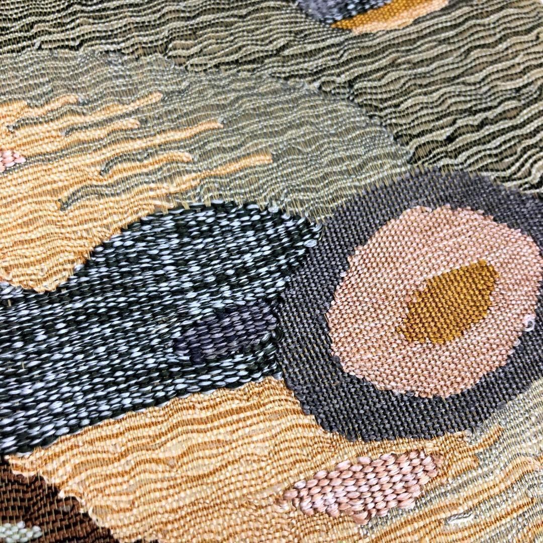 枯野色の品のあるお色味の透け感のあるすくい織、抽象柄模様がデザインされた素敵なお品でございます。