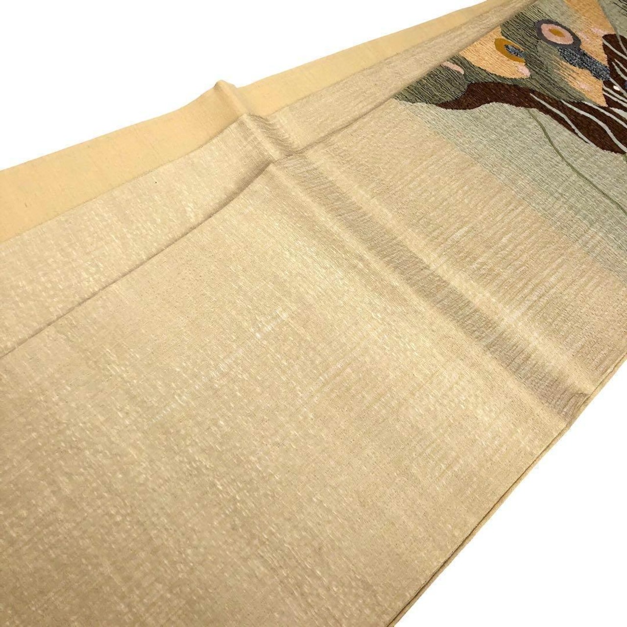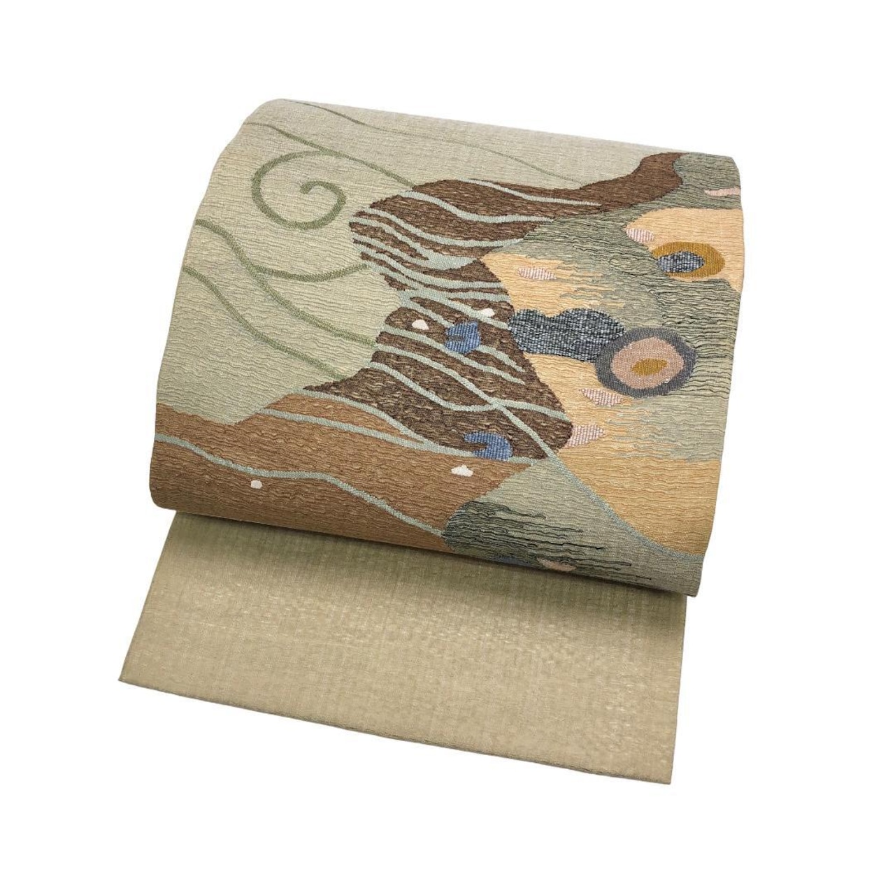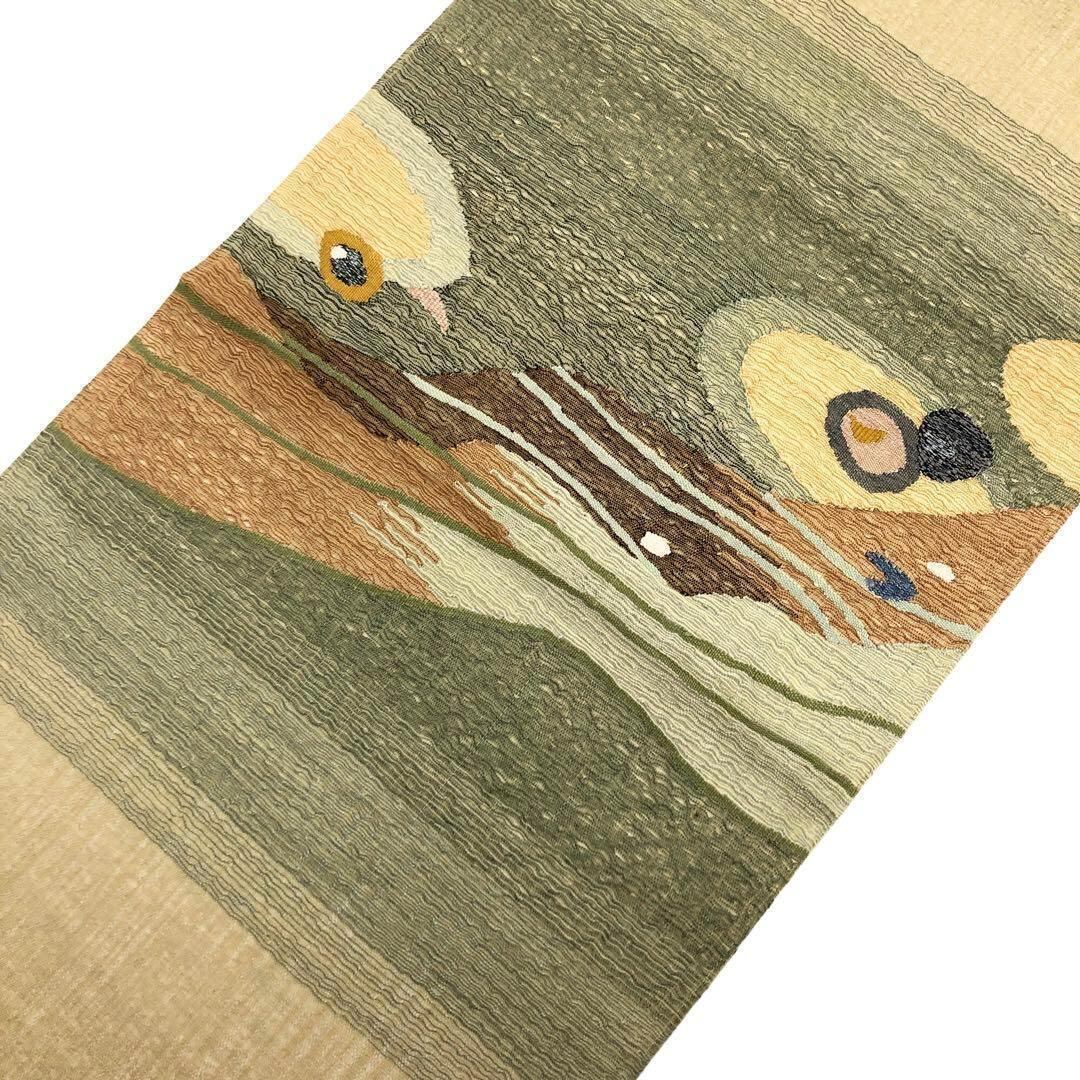 枯野色の品のあるお色味の透け感のあるすくい織、抽象柄模様がデザインされた素敵なお品でございます。