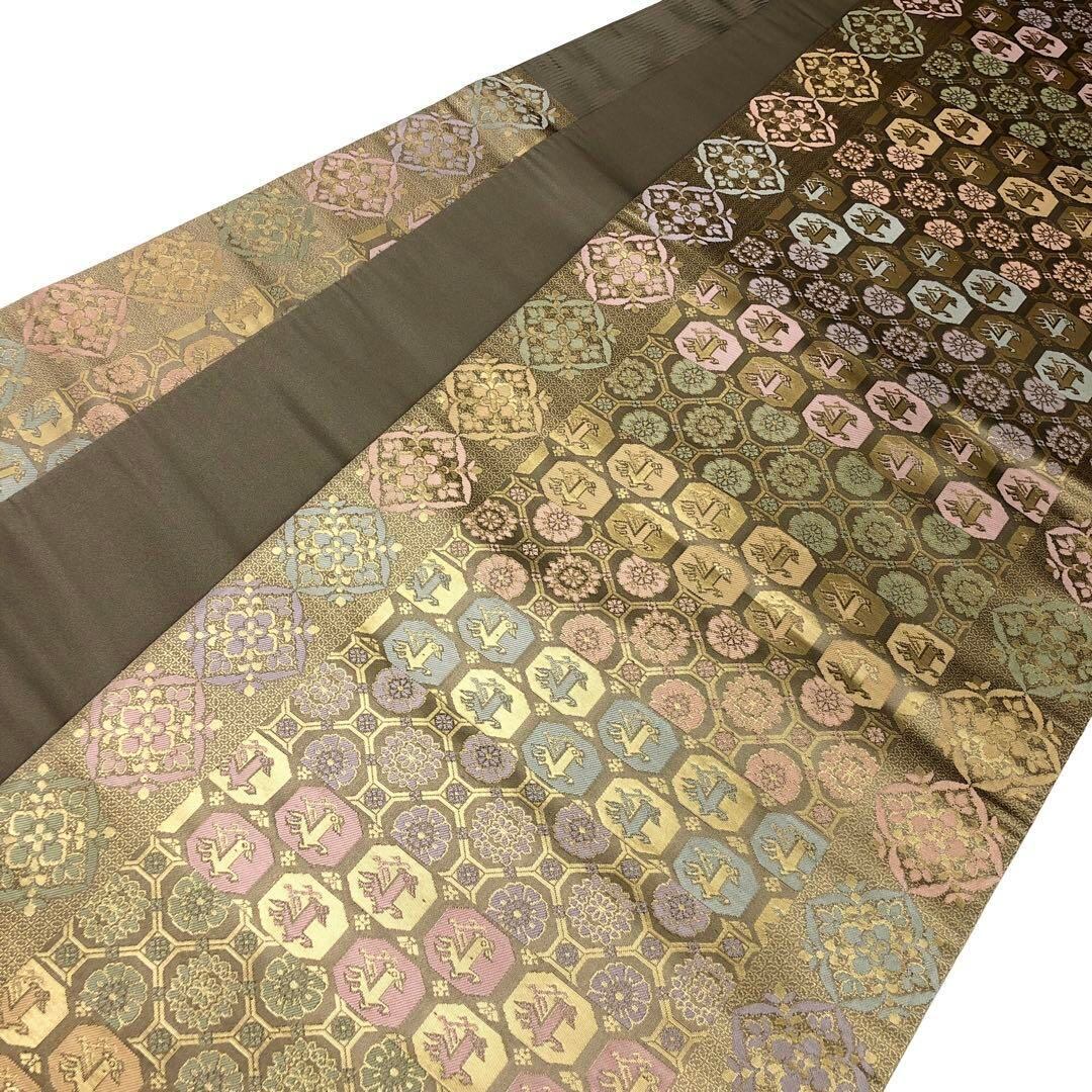 茅色ベースの上品なお色味に煌びやかで美しい織模様がデザインされた素敵なお品でございます。