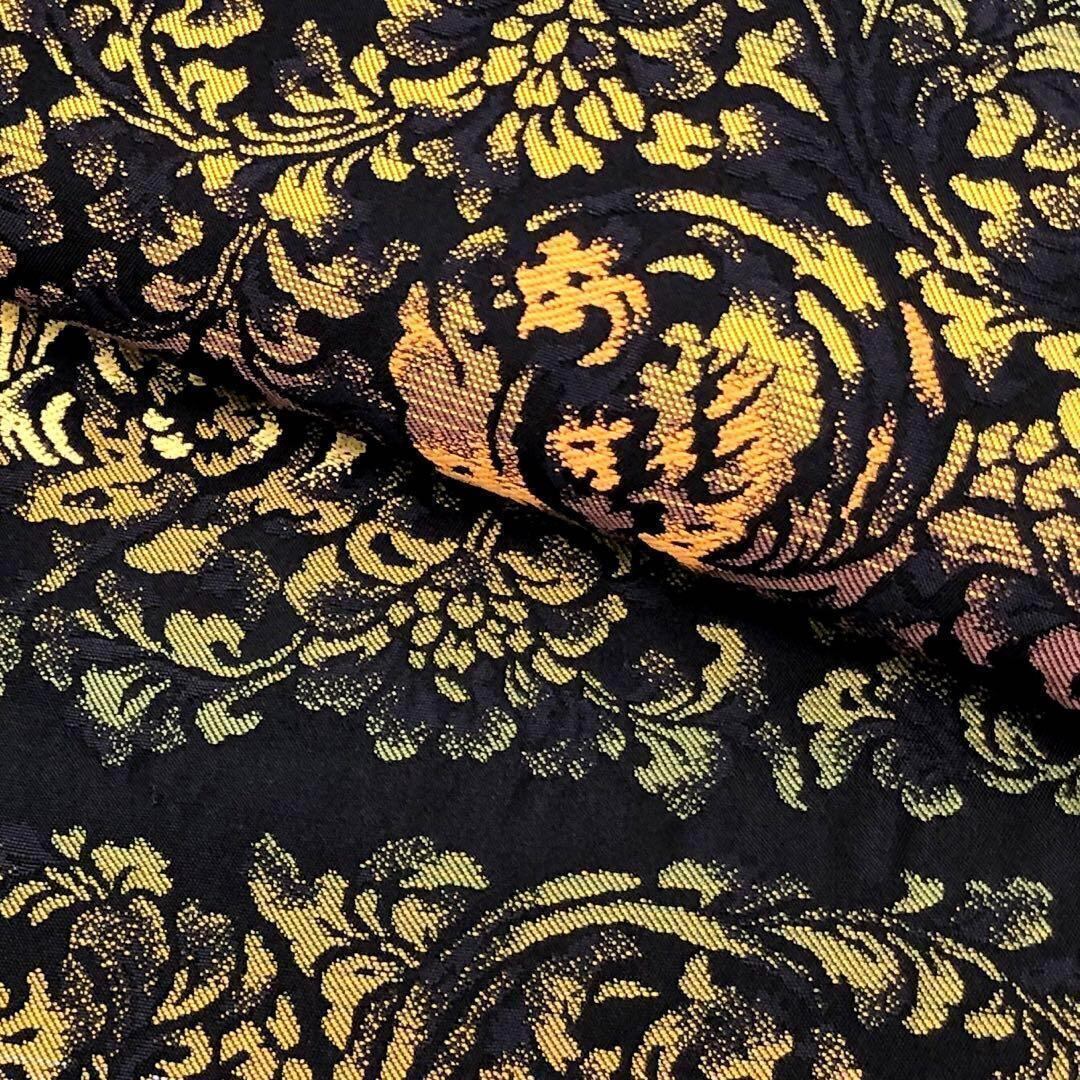 黒地に色味の鮮やかなグラデーションで彩られたオリエンタルな花唐草織模様がデザインされた素敵なお品でございます。