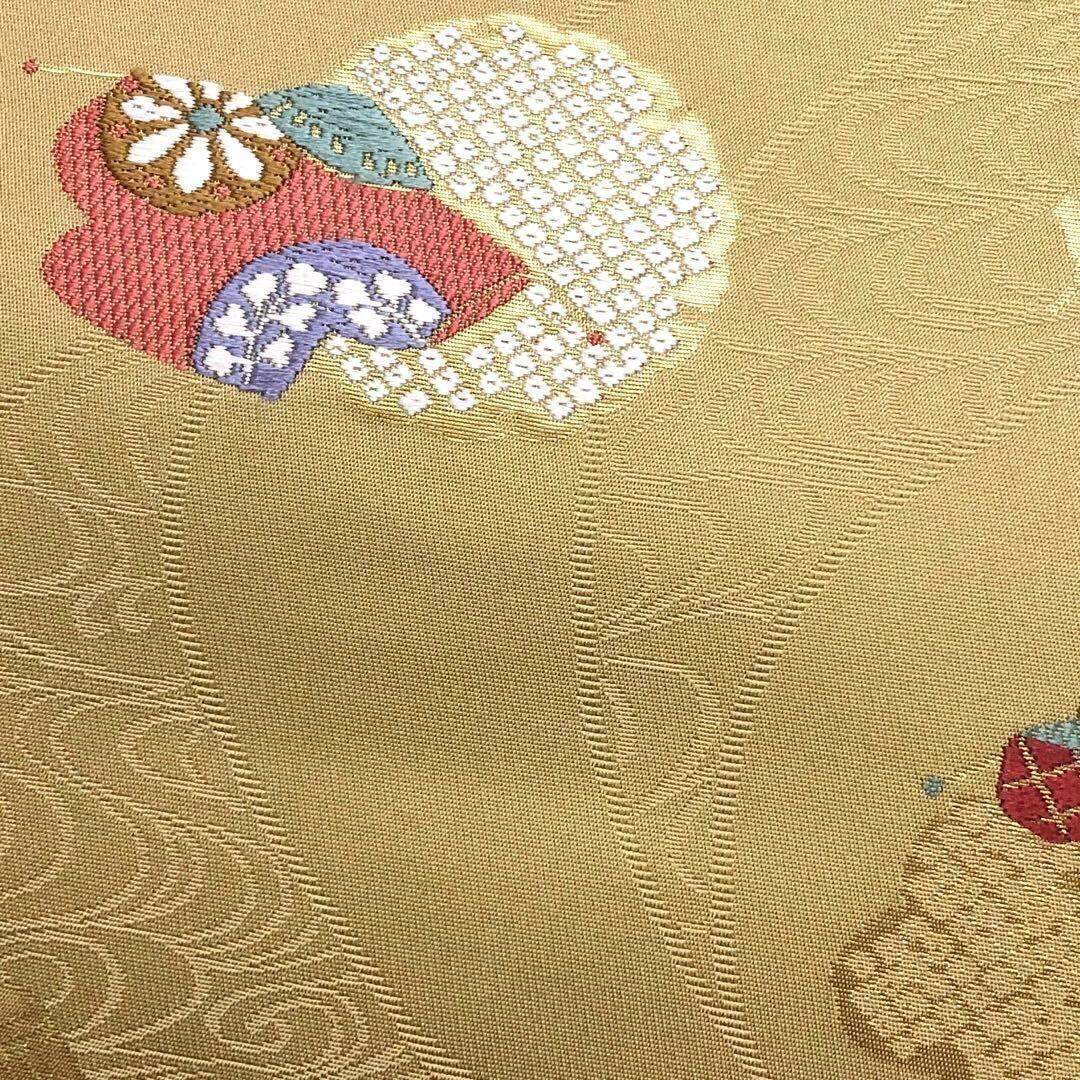 麦藁色の品のあるお色味に流水、花柄の地模様にかかしと雪輪の柄裄が素敵なお品でございます。
