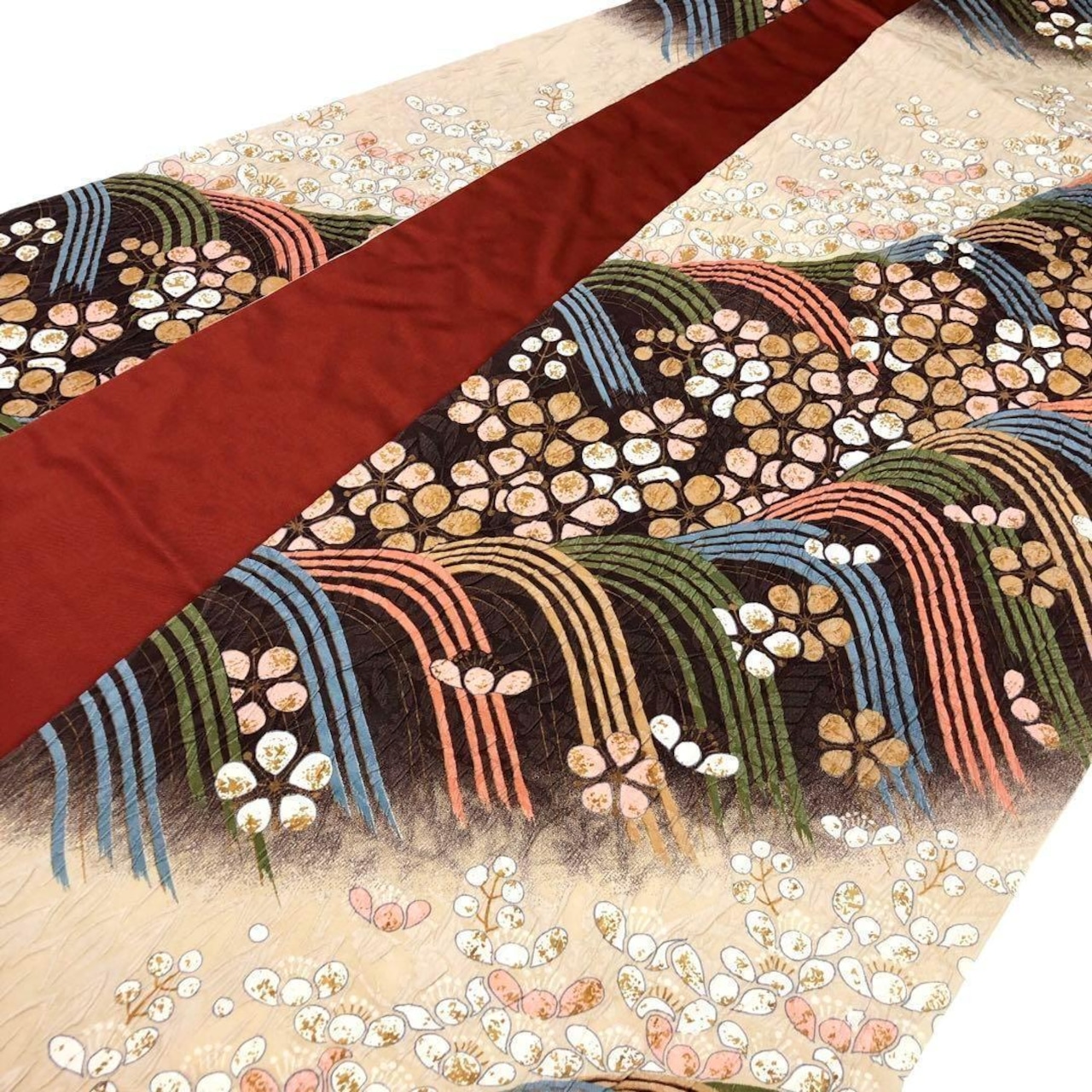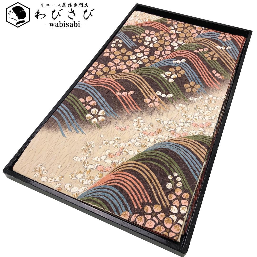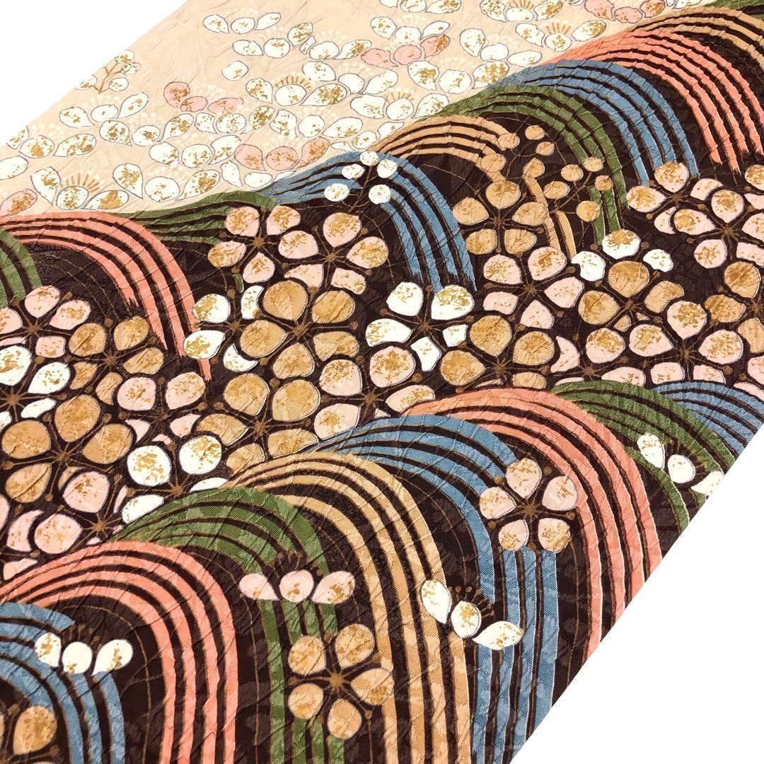 膨れ織の立体感のある織に彩り鮮やかな波模様に花柄がデザインされた素敵なお品でございます。