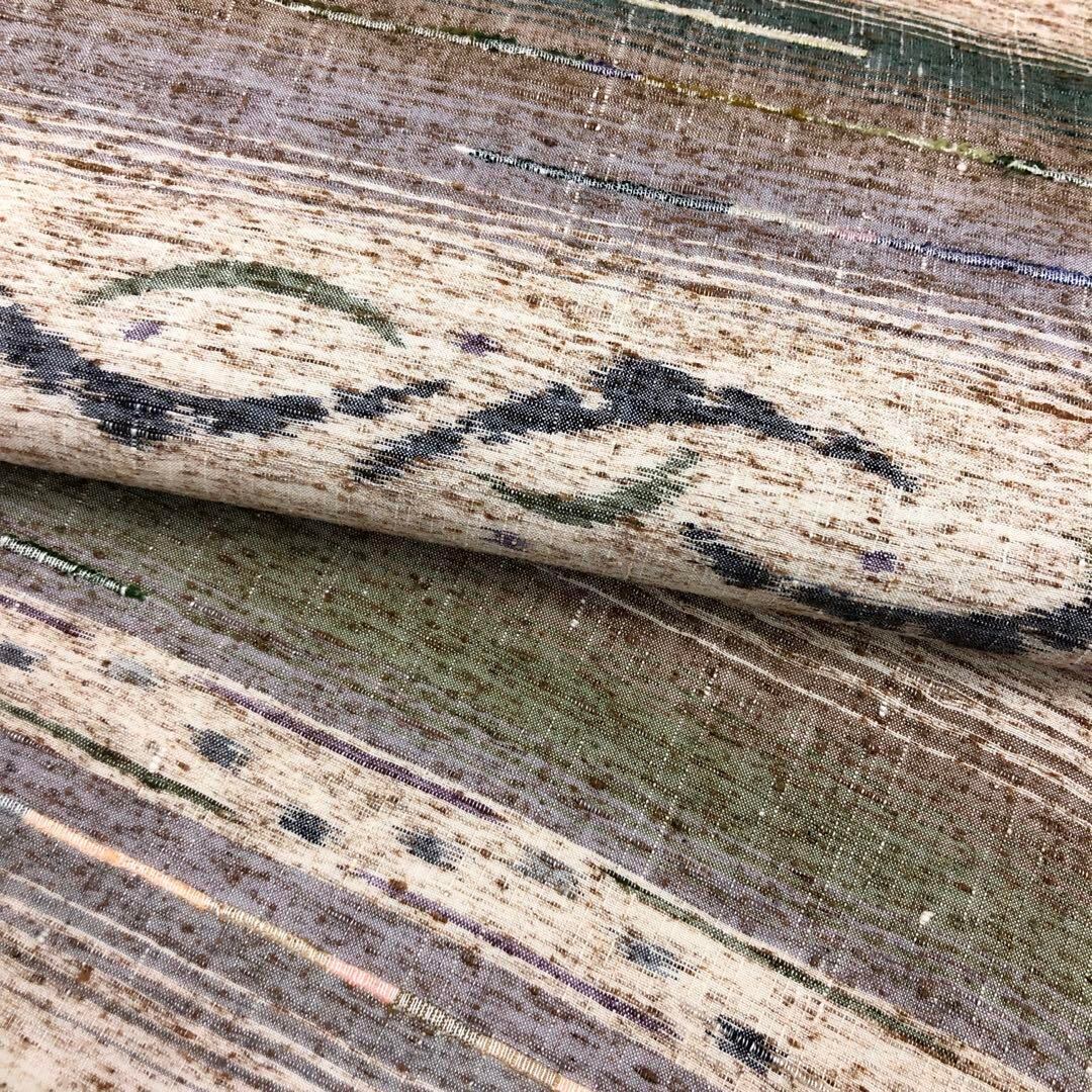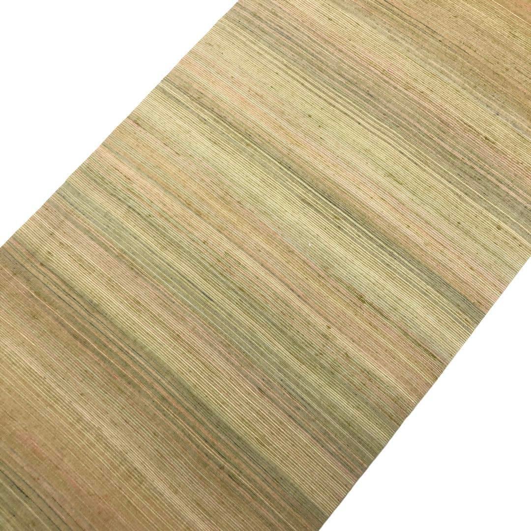 ぜんまい紬の独特の節が見られる自然な風合いに抽象模様、反対は淡い緑味のお色が美しい紬の横柄のデザインの両面お使い頂ける素敵なお品でございます。