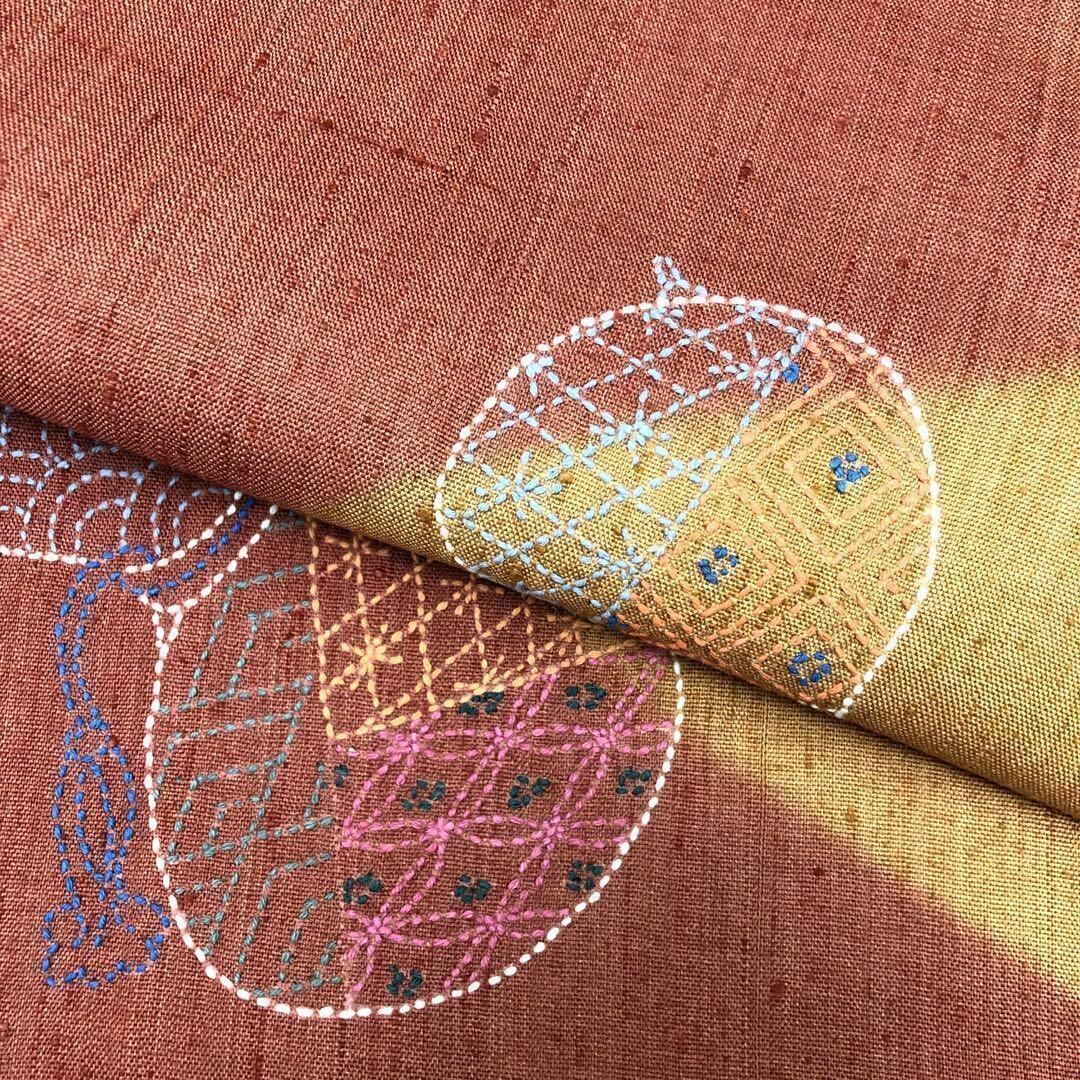 赤茶色ベースの上質な紬地に七宝や青海波の柄裄の瓢箪を刺し子でデザインされた素敵なお品でございます。