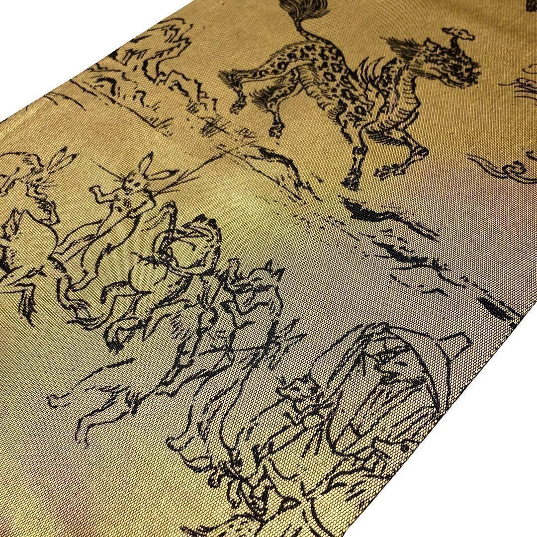 袋帯 リバーシブル 宿々織 金に鳥獣戯画 麻の葉 七宝 ガード加工 O-2717 着物 きもの kimono 和服 和装 中古 リサイクル着物 【送料無料】