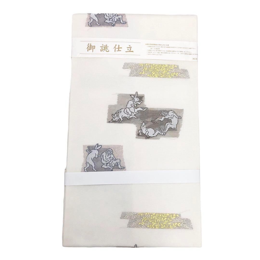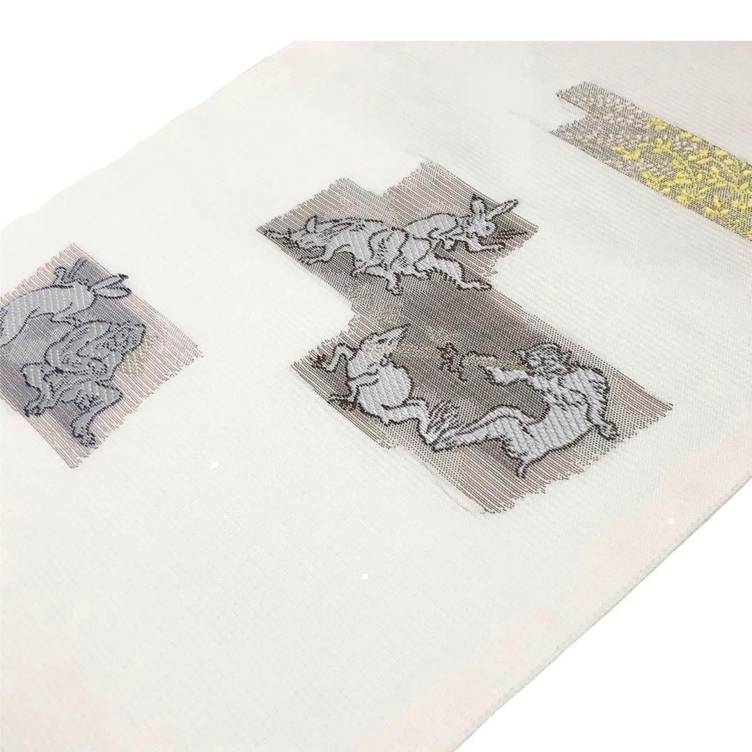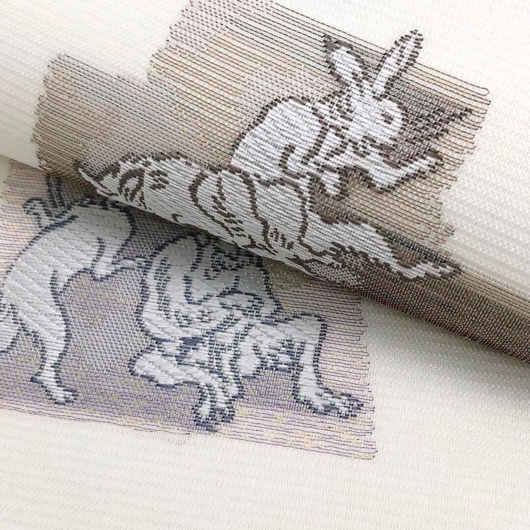 沢本織物、乳白色の上品なお色味に国宝の鳥獣戯画がデザインされた素敵なお品でございます。