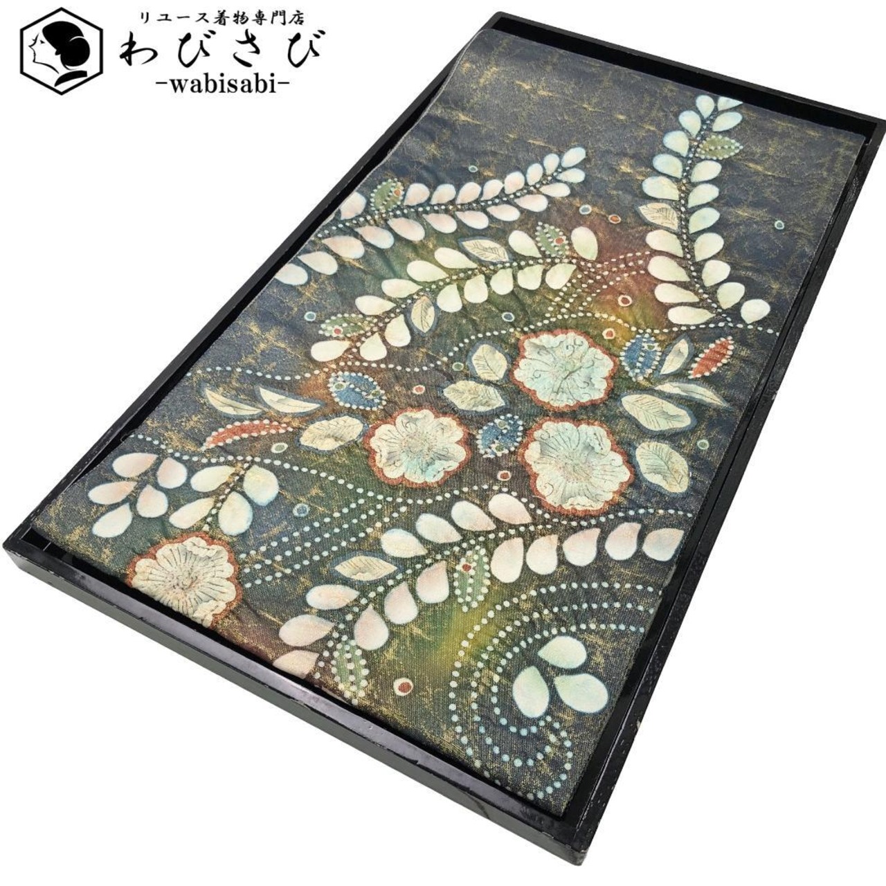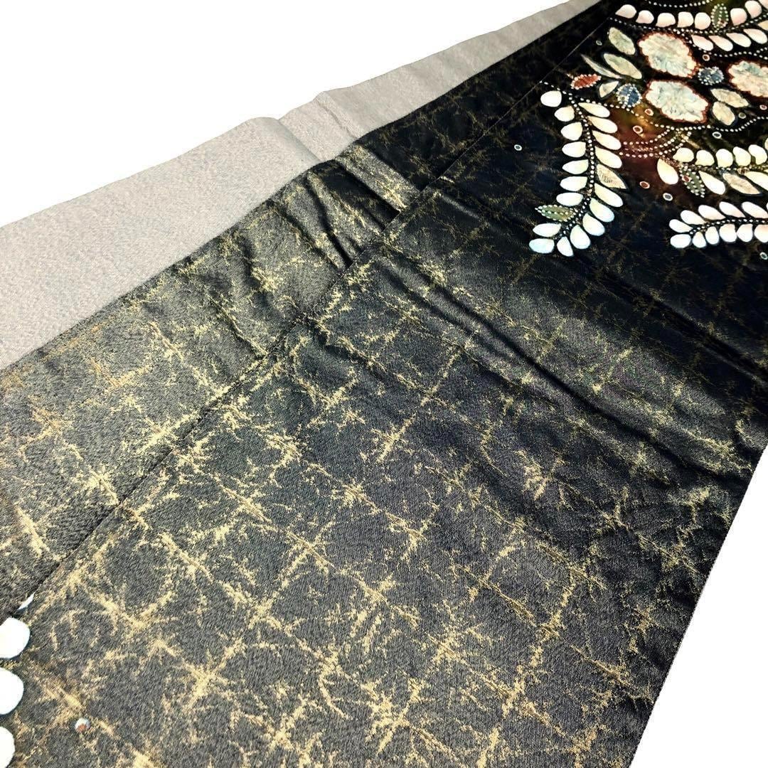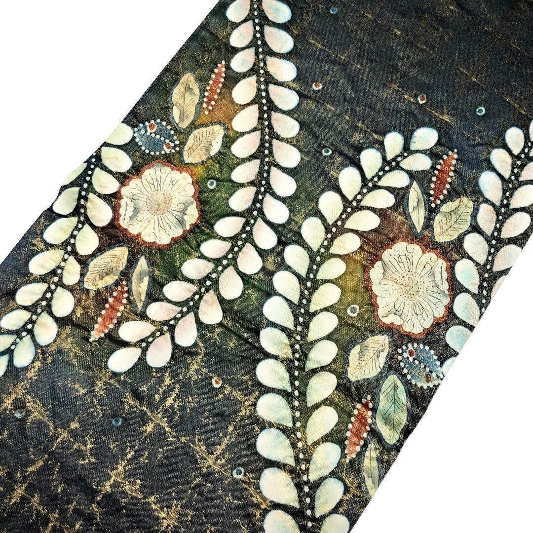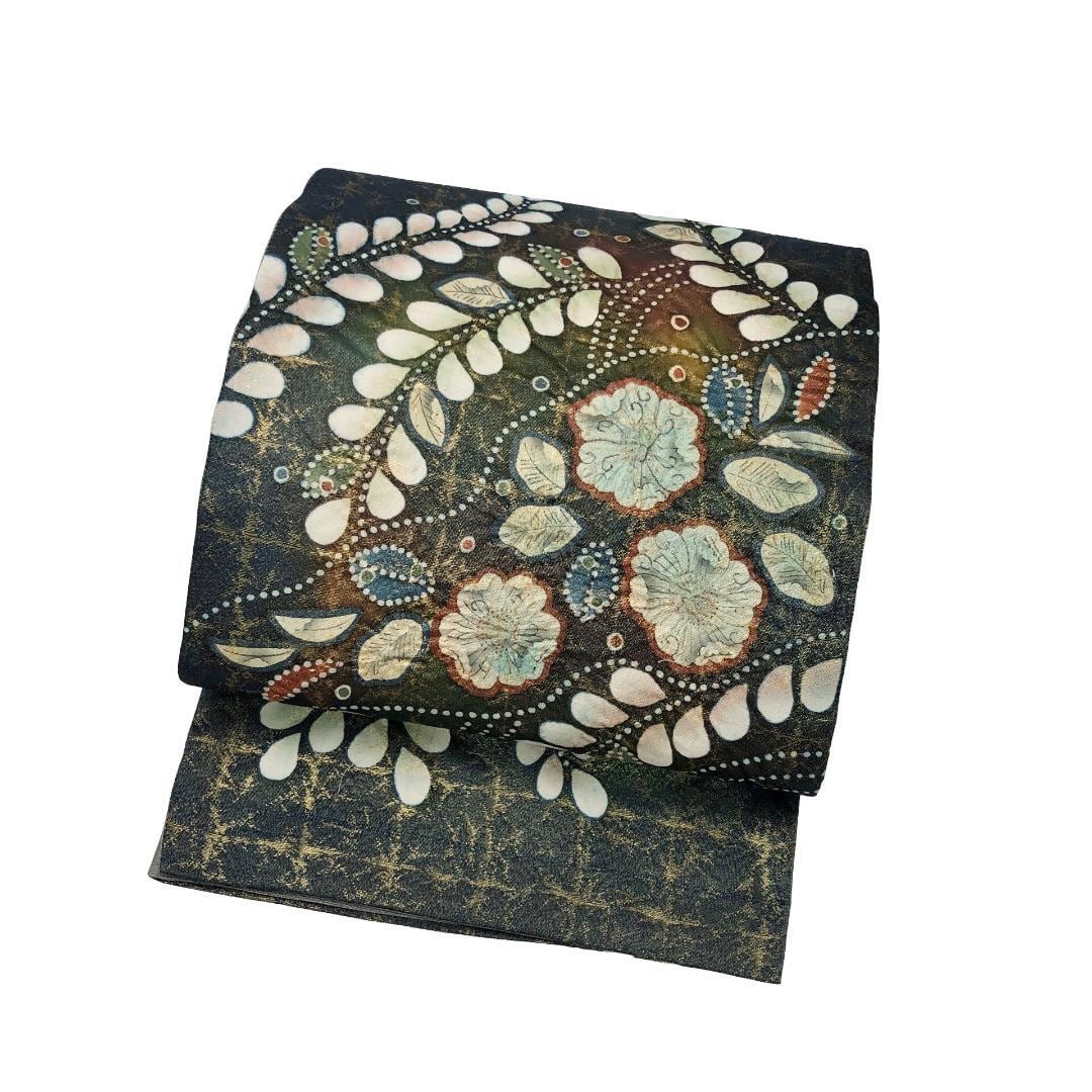 深青緑色に金糸を使ったお色味に美しい辻が花がデザインされた素敵なお品でございます。