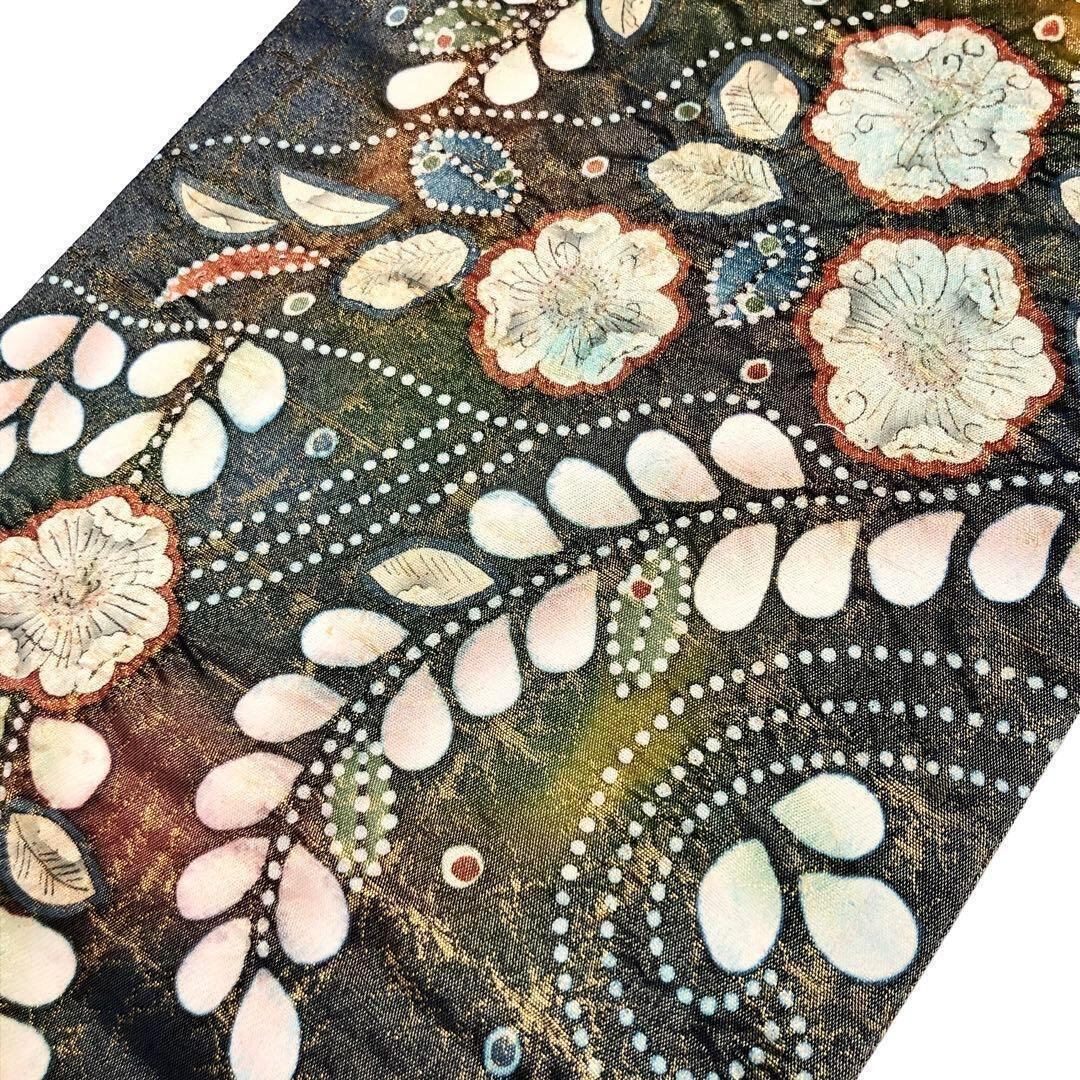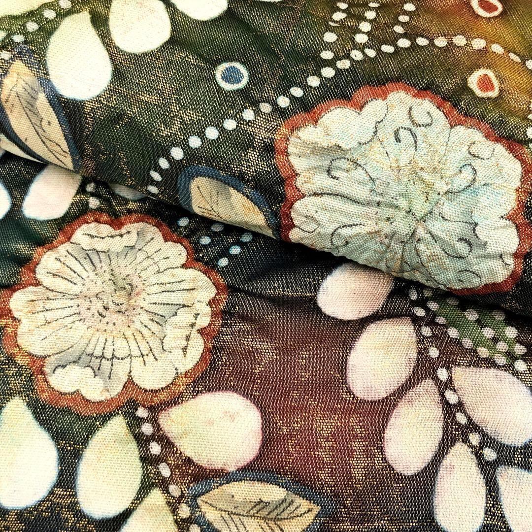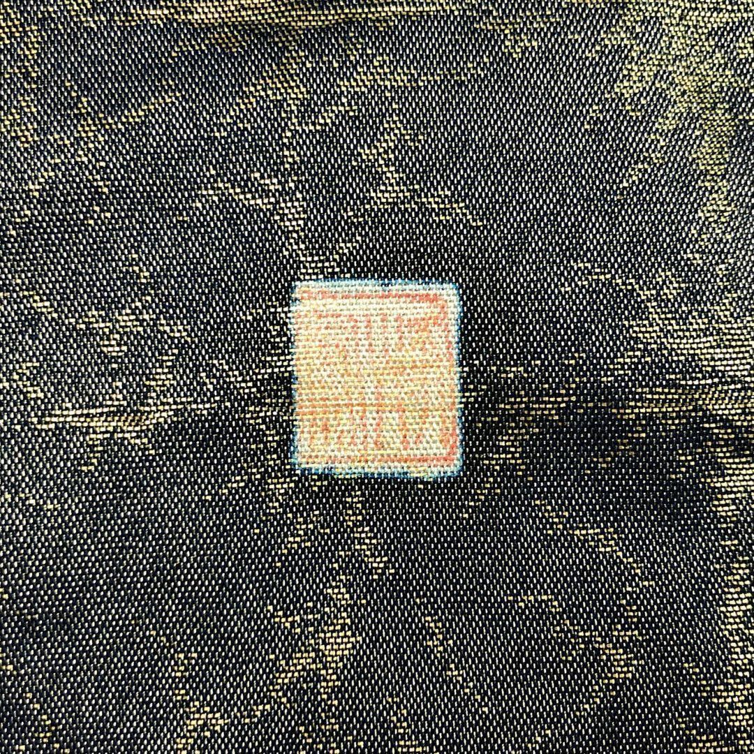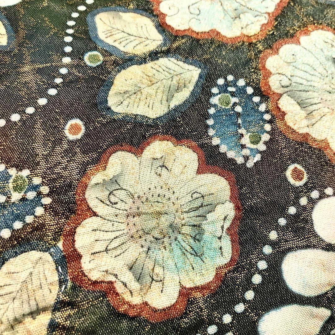 深青緑色に金糸を使ったお色味に美しい辻が花がデザインされた素敵なお品でございます。