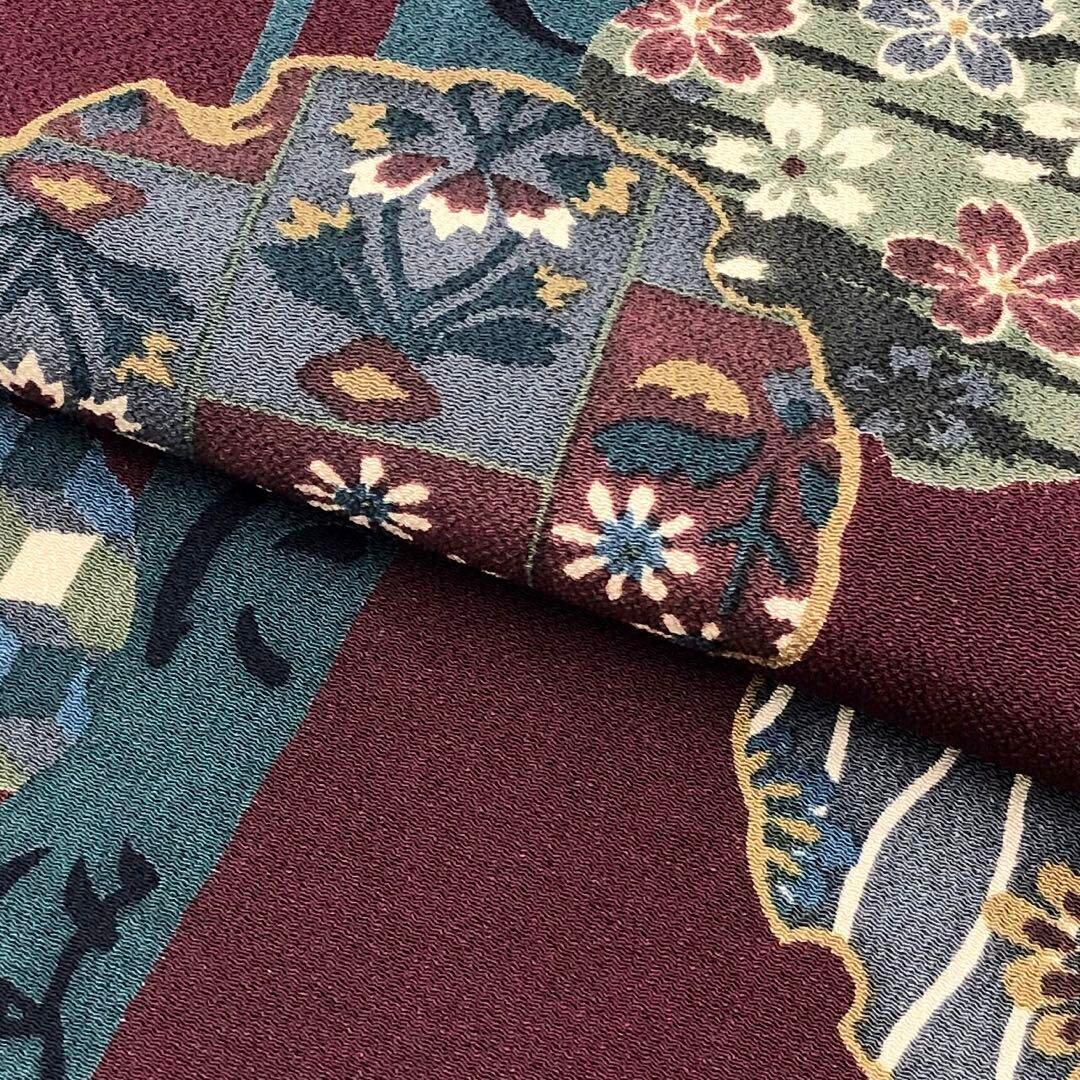 紫檀色の縮緬地にいろは歌の縦模様、雪輪の中に花や蝶のデザインがされた落ち着いた染色の素敵なお品でございます。