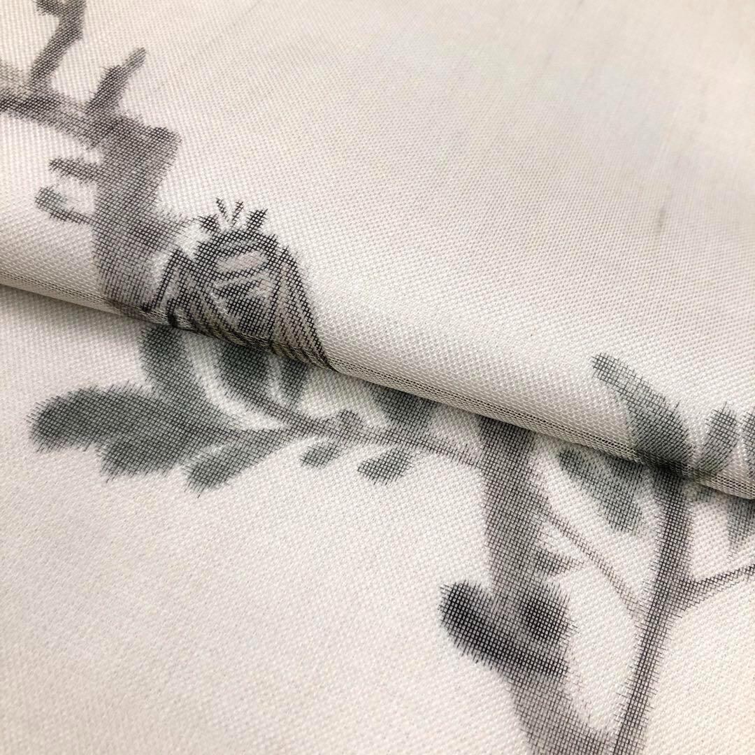 透け感のある灰白色の品なあるお色味に手描きでデザインされた枝葉にとまる蝉がデザインされた風流なお品でございます。