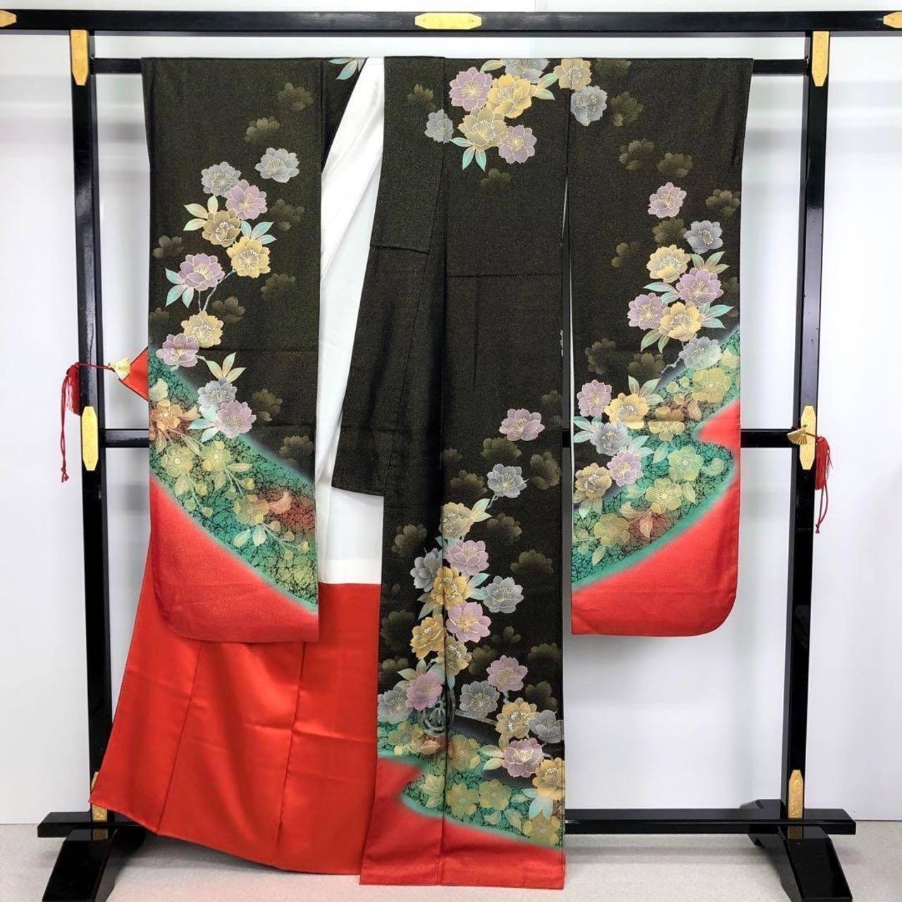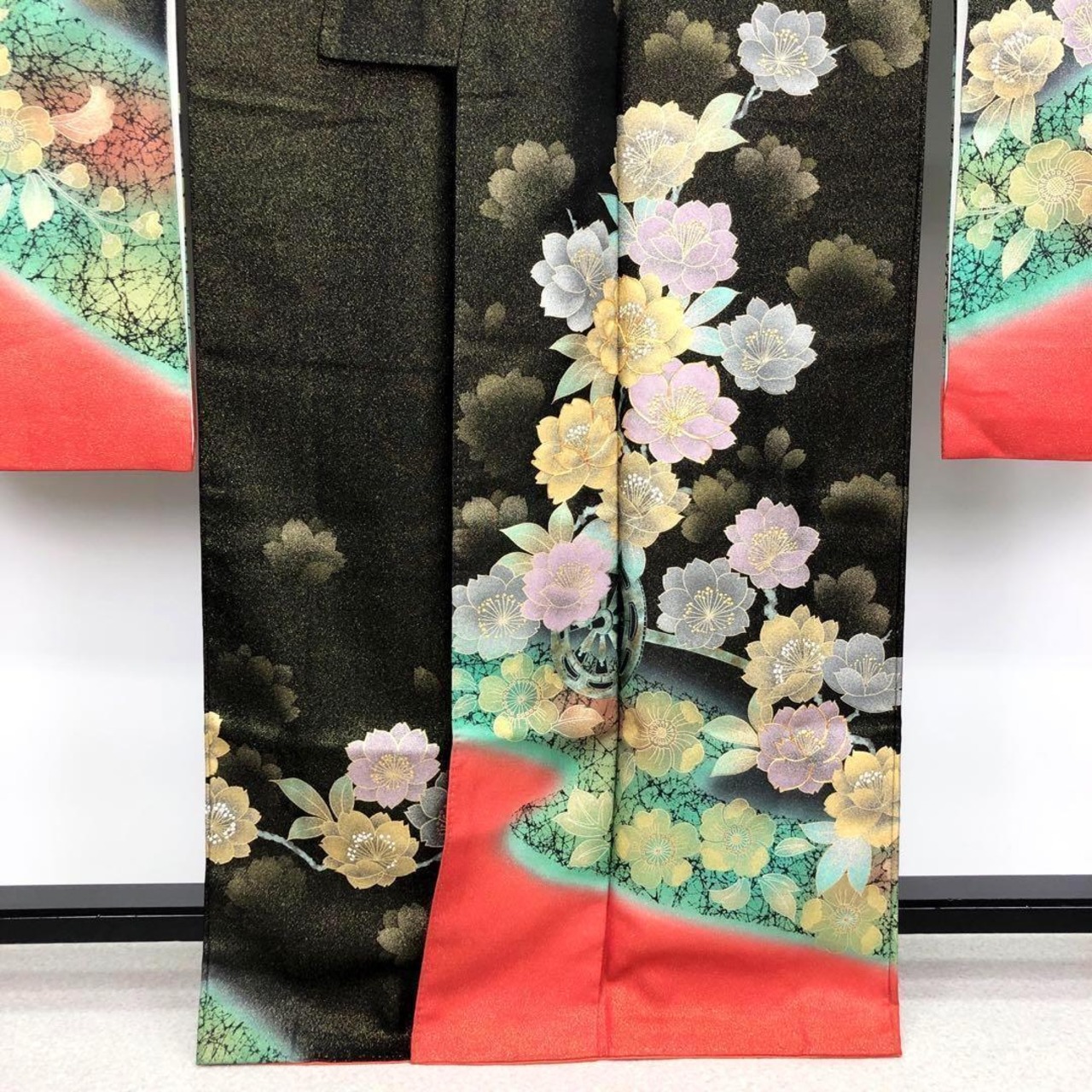 振袖 美しい桜の花模様 花車 金駒刺繍 金通し 黒色 トールサイズ K-3116